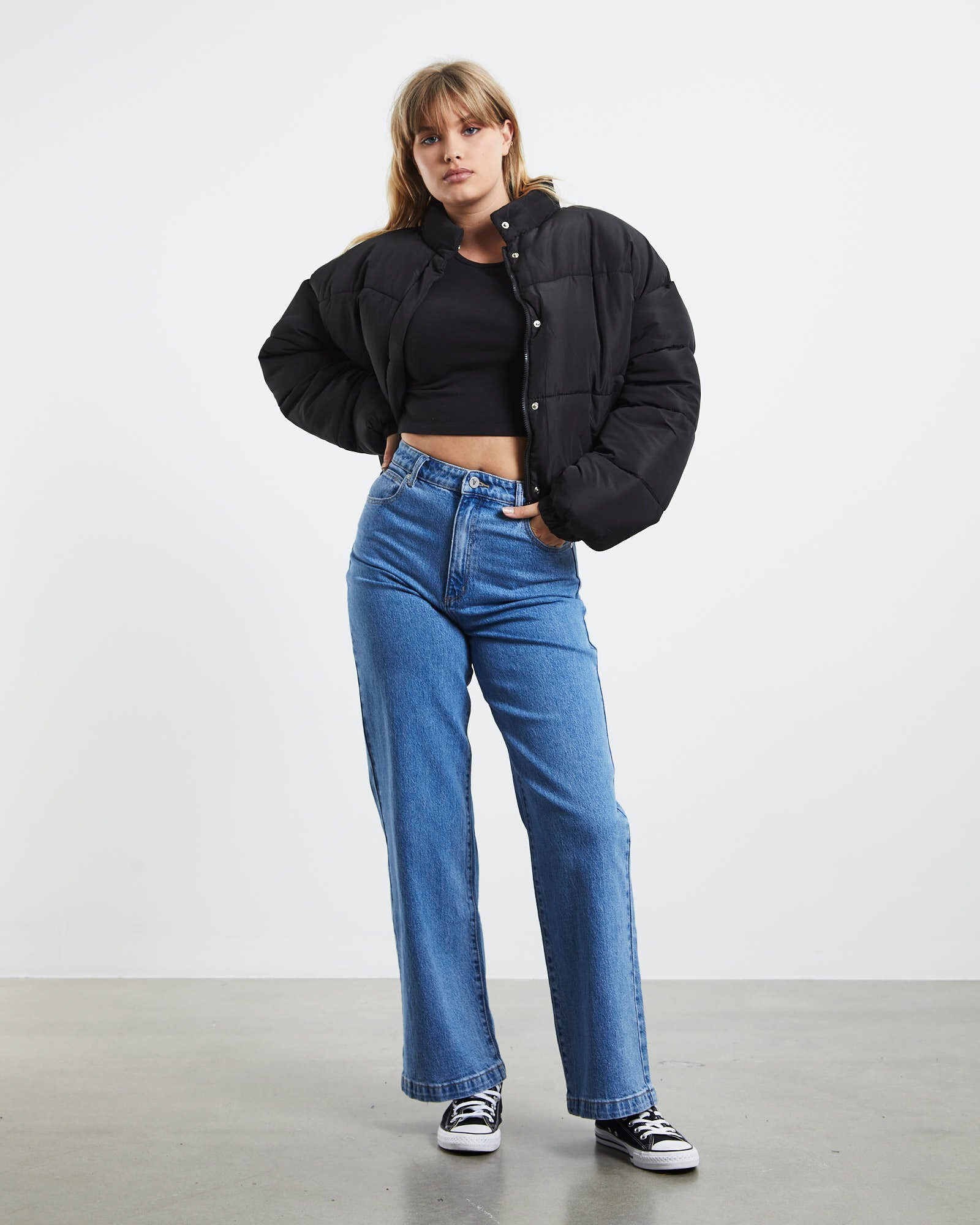 The 94 High And Wide Jeans by Abrand come in a mid-blue wash and are a wide leg style. The piece is designed with a slight stretch and features a zip fly and button closure, belt loops, five pockets and sits high on the waist. Pair with a knit cropped jumper and Converse to complete the look.