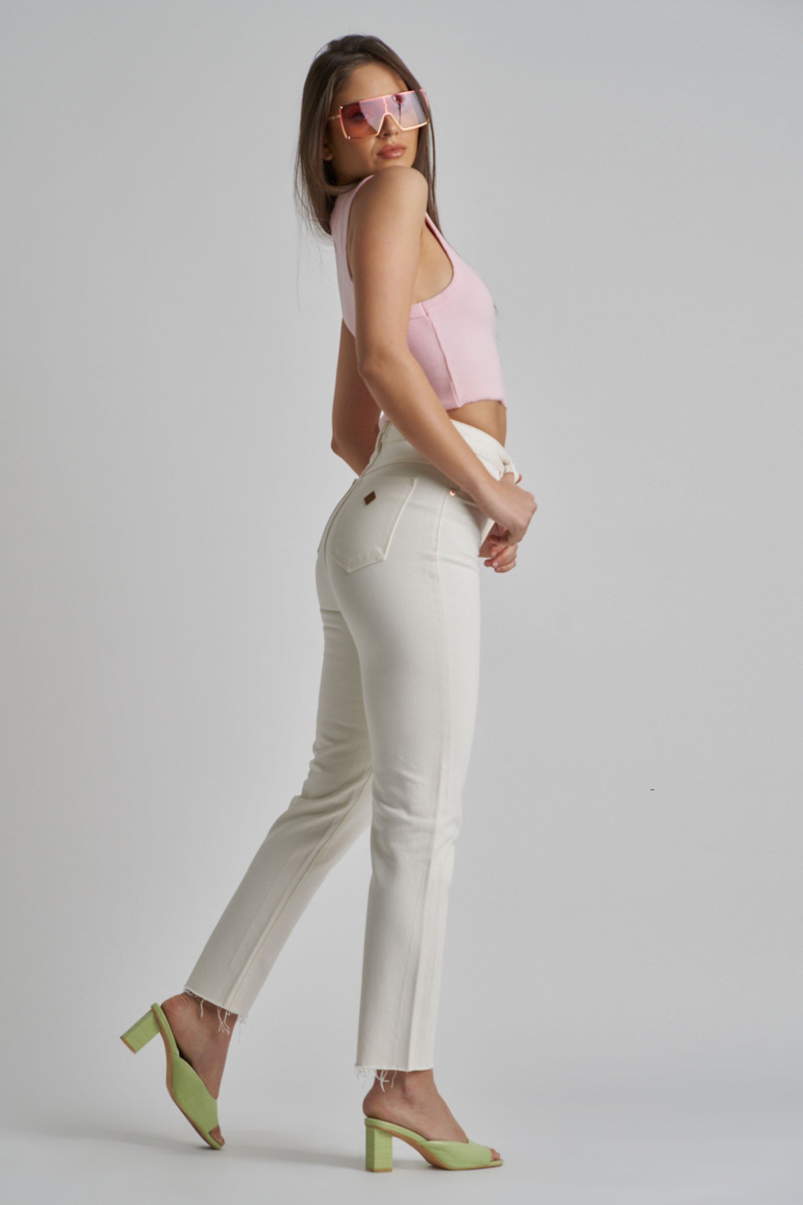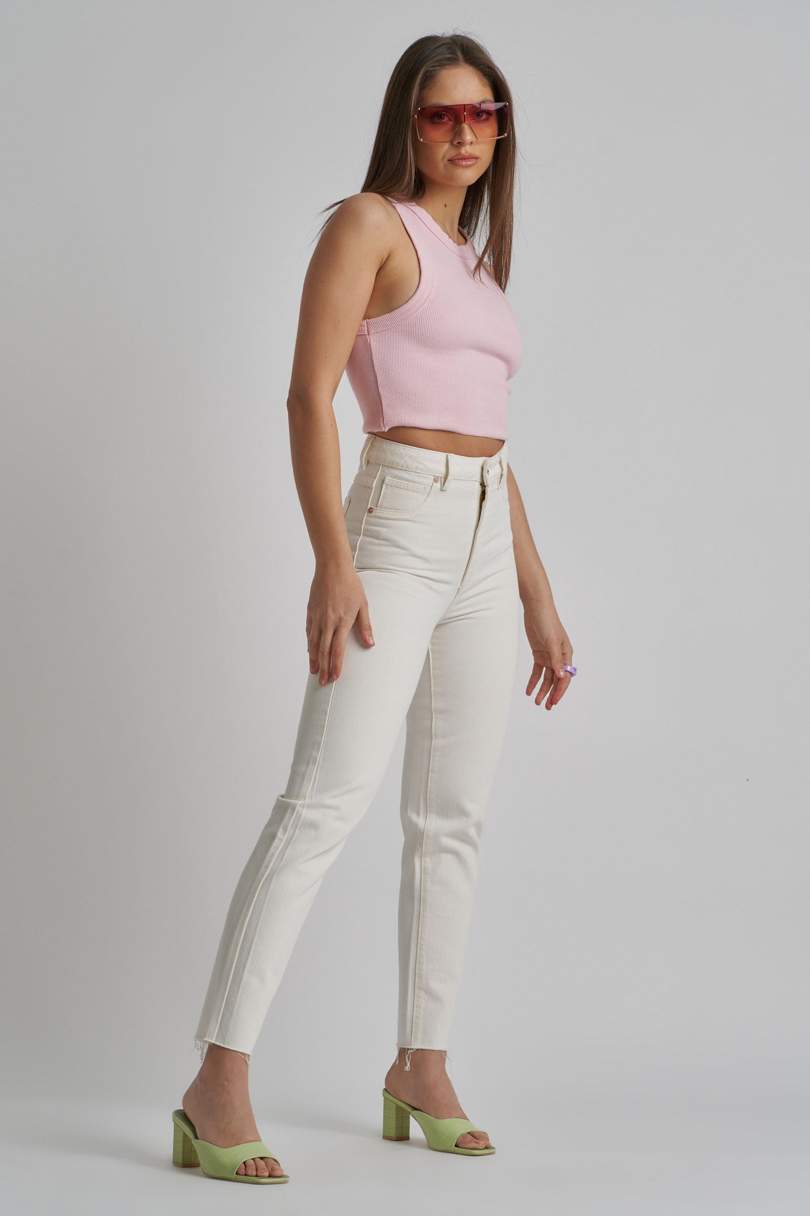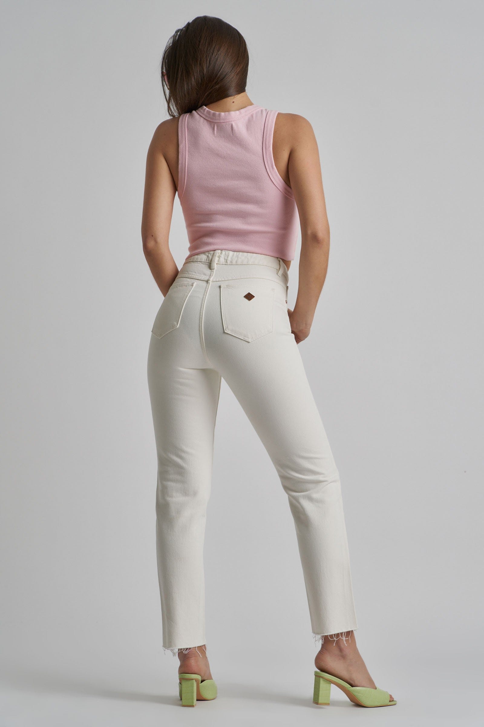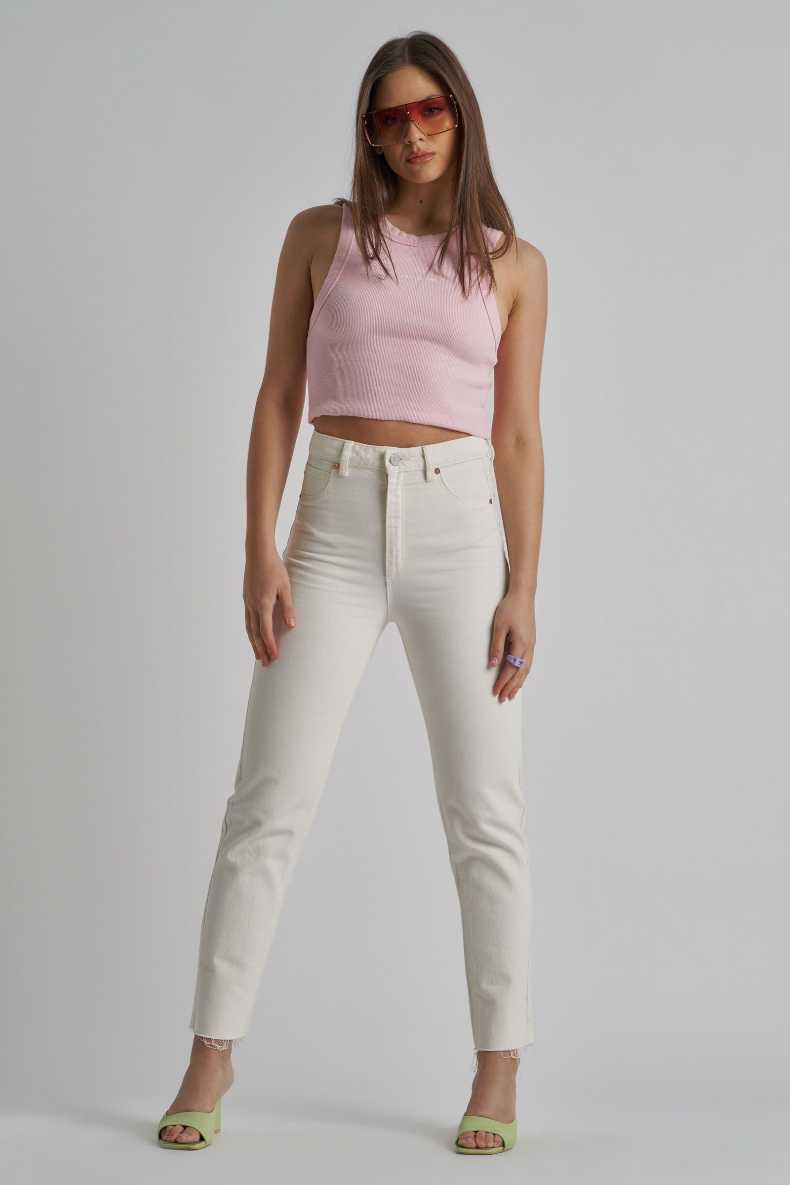 The A 94 High slim in White Fade is a high rise, slim leg jean, made with a rigid denim. We suggest going up a size.