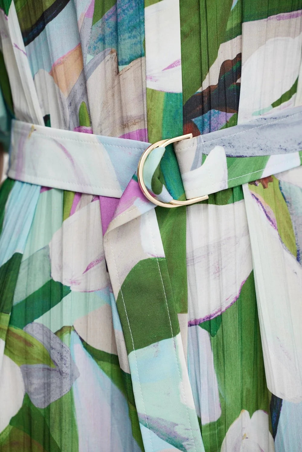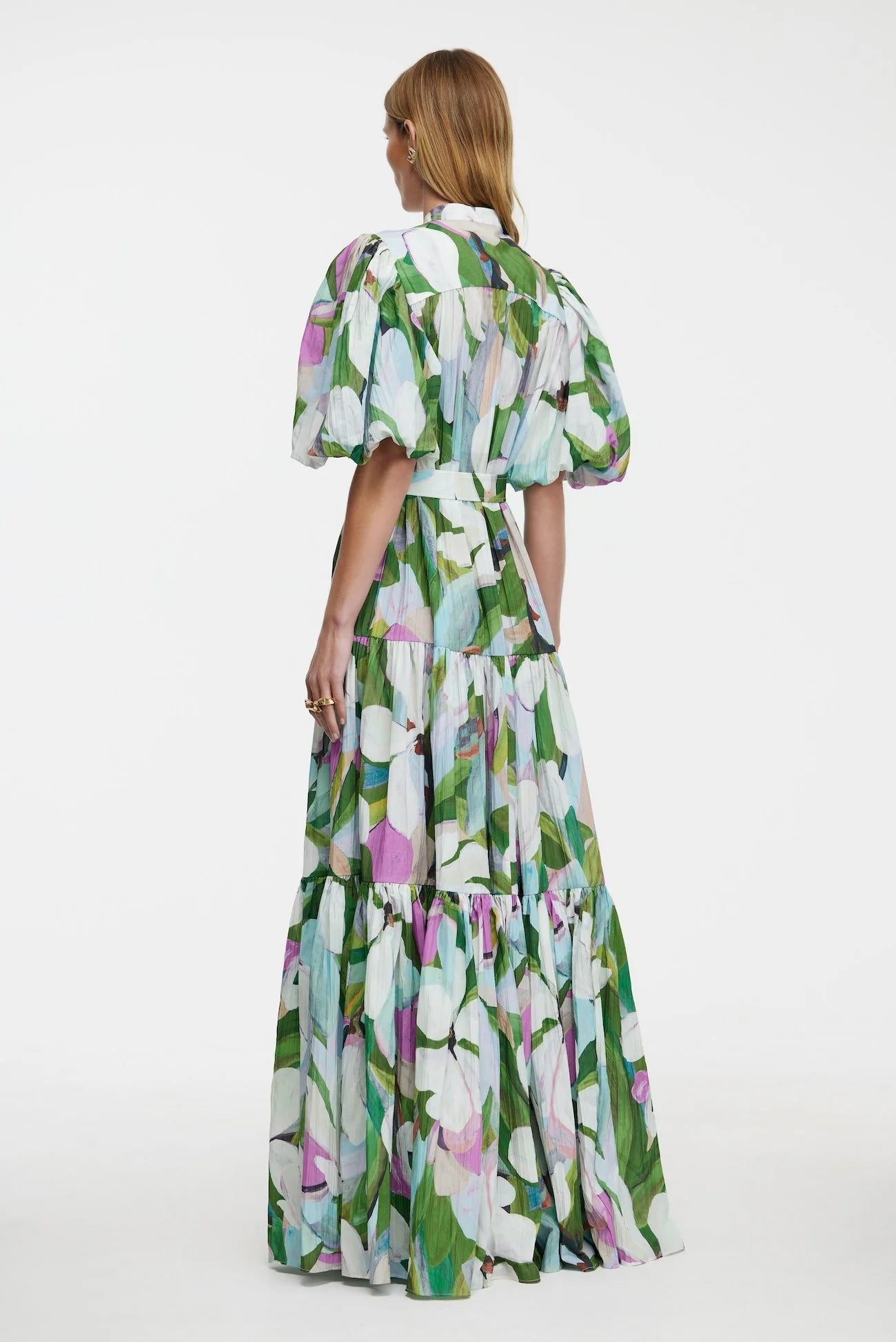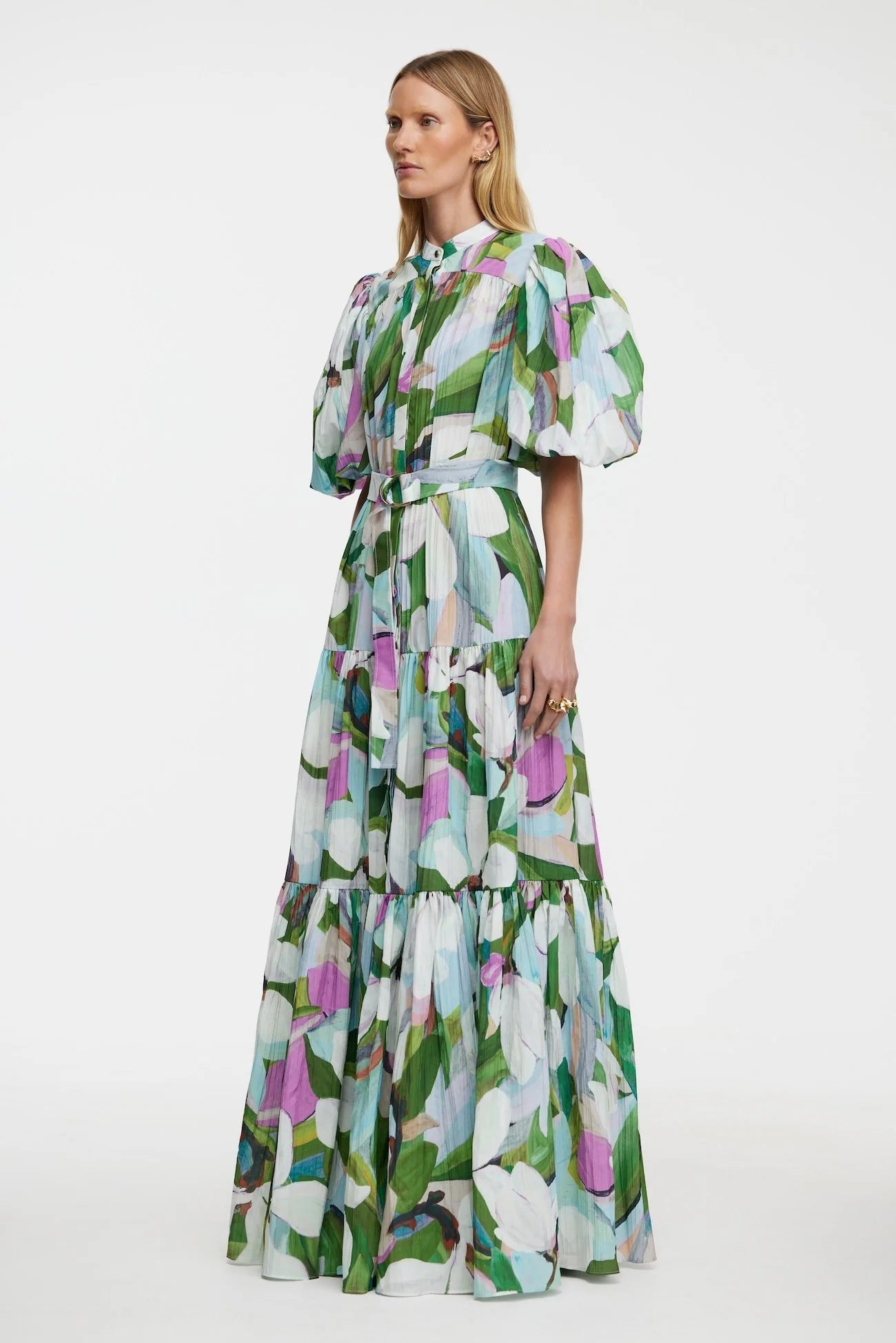 Introducing the Roade Maxi Dress in Cornlily Meadow, a flowing piece crafted from micro-pleated printed fabric. Featuring a high neck with a hidden button closure and a gold statement button, this dress also boasts chic half-length balloon sleeves and gathered tiers for added movement. The belted waist with a gold D-ring detail creates a flattering silhouette, while hidden inseam pockets add practicality to this unlined design.