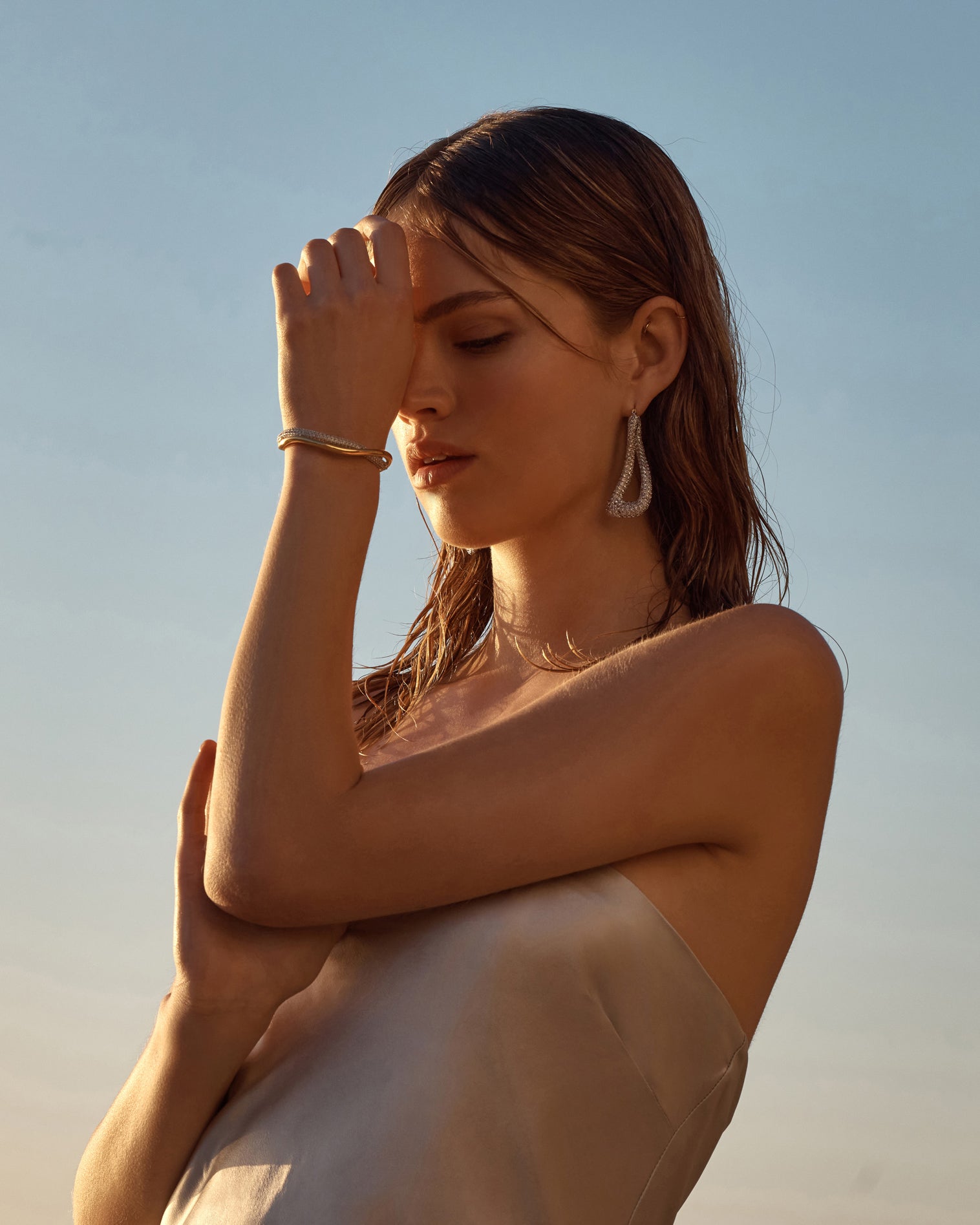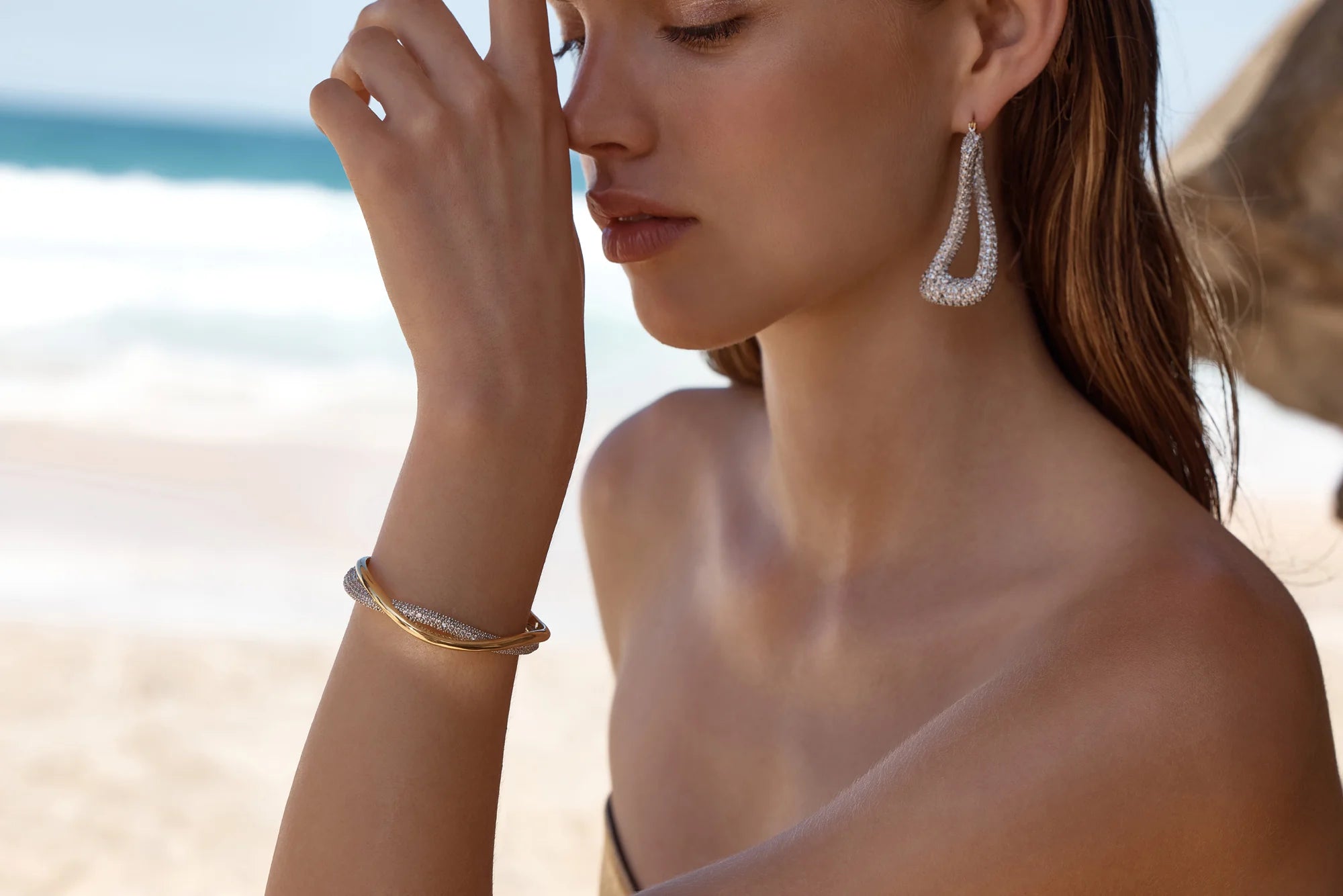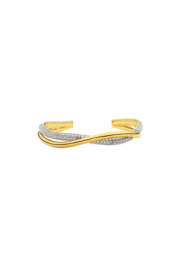 Make a statement in the Bahamas Bracelet featuring two dramatic twisted silhouettes. One is adorned with sparkling cubic zirconia crystals, the other elegantly finished in shiny 24K Gold plating. It's giving the appearance of two cuffs in one. Handcrafted in Italy.