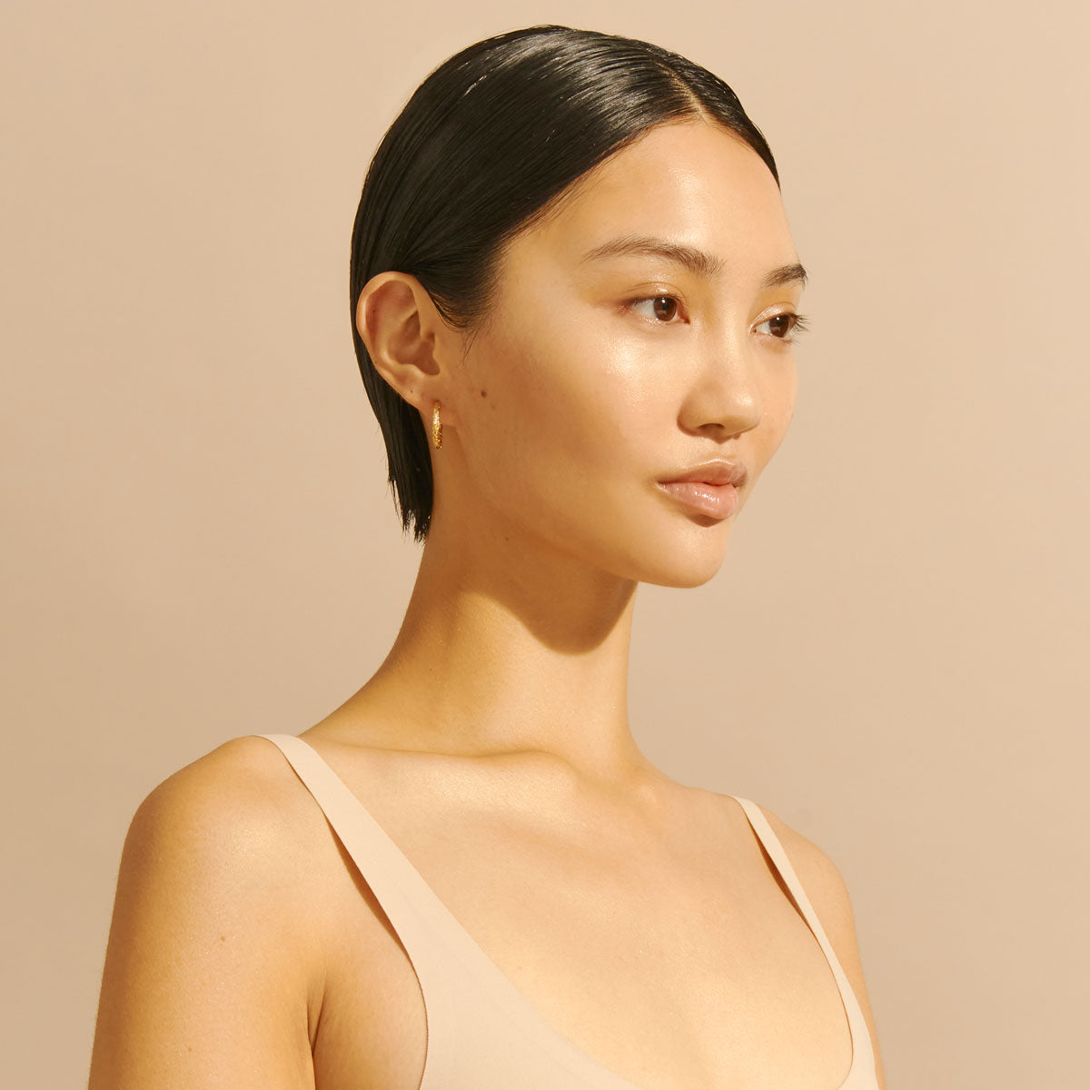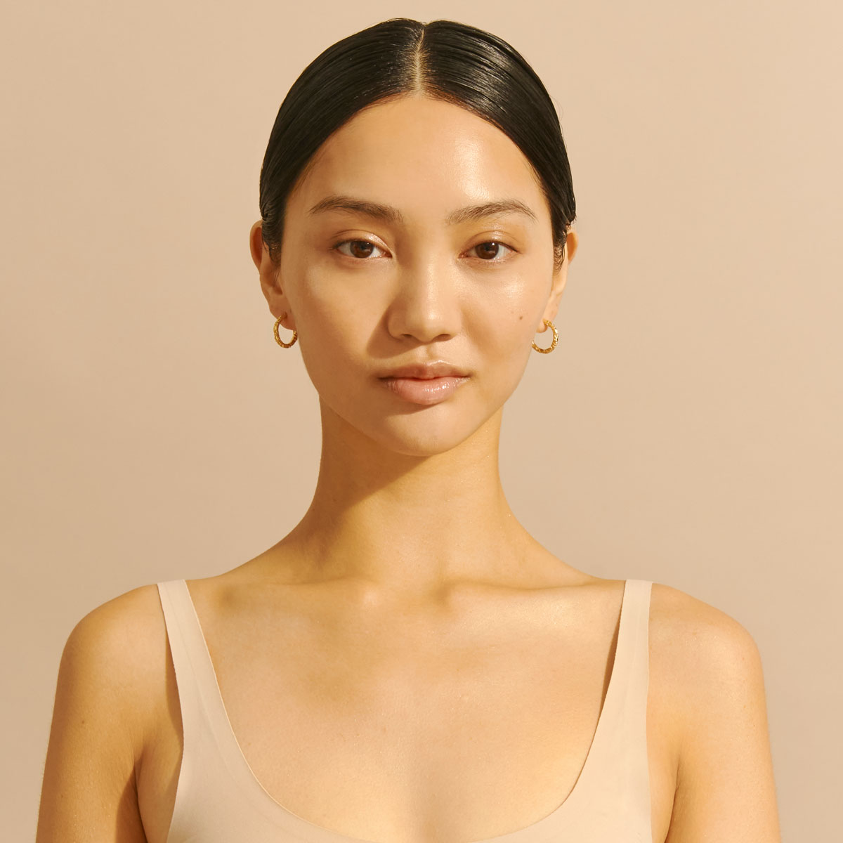 THE DALLAS EARRINGS SHOWCASE A CONTEMPORARY HOOP DESIGN FEATURING A TEXTURED GOLD SILHOUETTE.