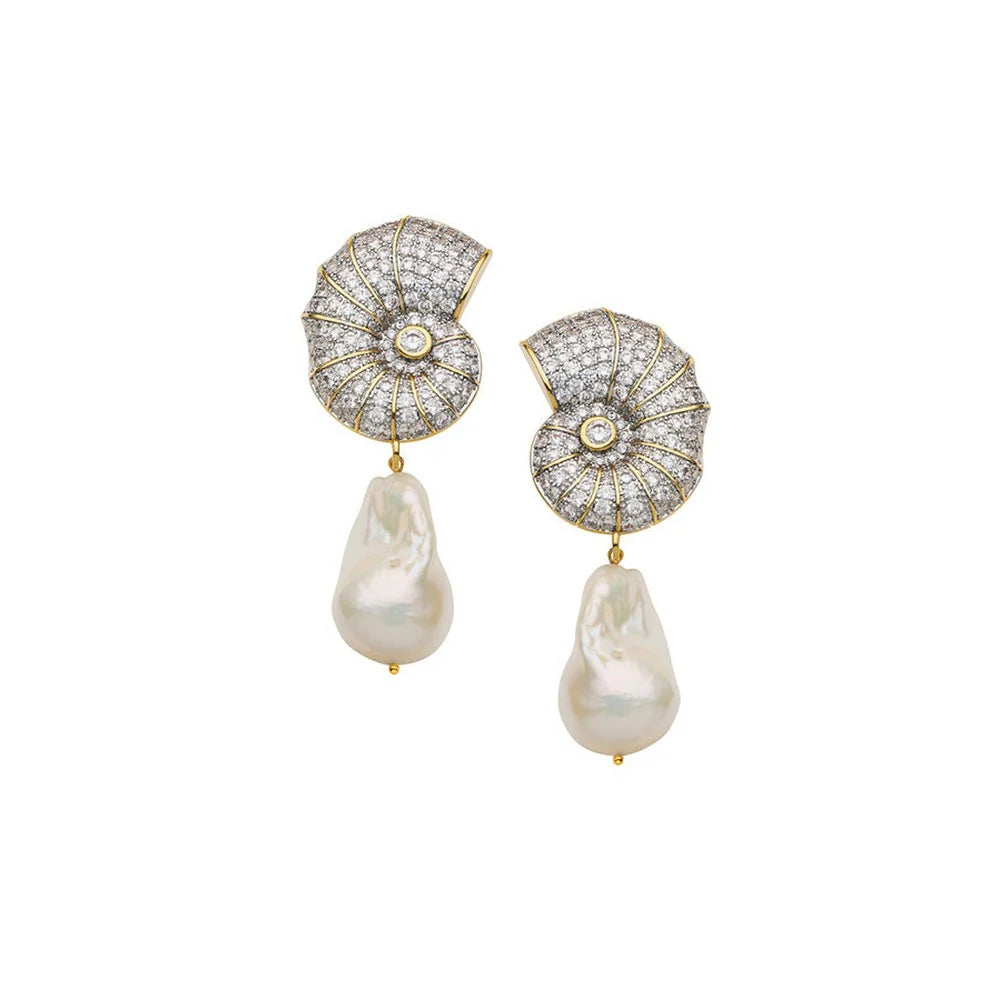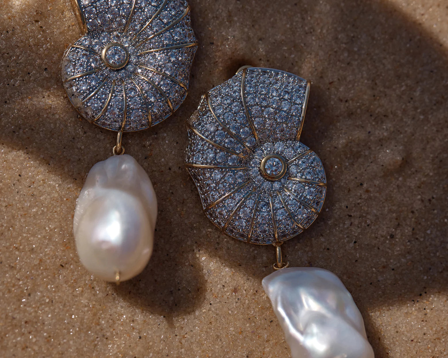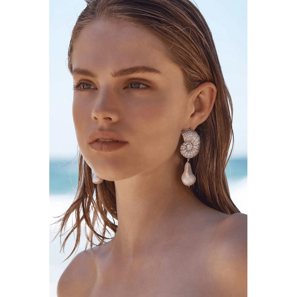 Complete your party look with the Ithaca Earrings. Featuring a huge AAA+ Freshwater Baroque Pearl suspended beneath a cubic zirconia encrusted shell. Handcrafted in Italy.