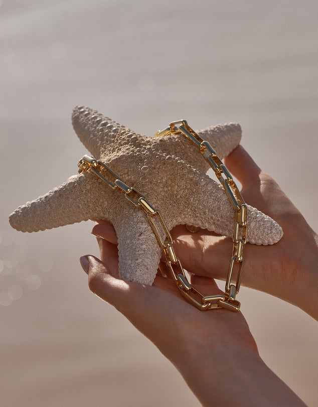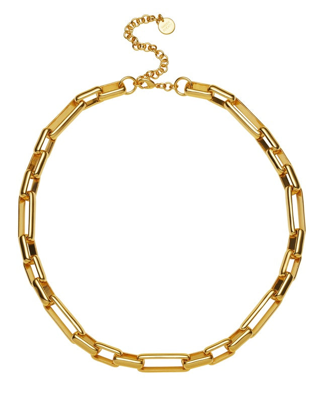24K Gold plated rectangular links are the stand out feature of the Santorini Necklace. Wear yours with the matching Santorini Bracelet. Handcrafted in Italy.