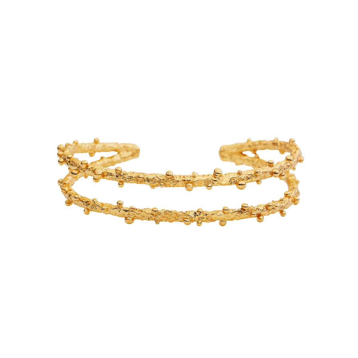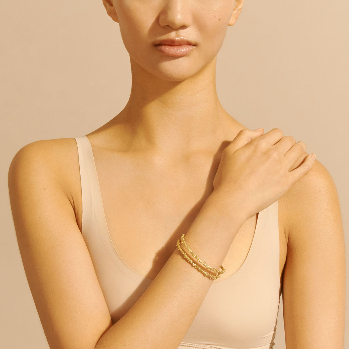 The Saylor Bracelet is a double layered cuff showcasting stand out texture in 24K gold plated brass. Wear yours with the matching Saylor Earrings.