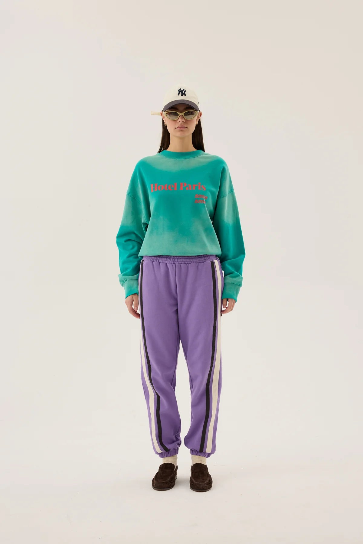 Introducing our Hotel Paris Sweatshirt in Washed Ocean Green. Crafted from a luxurious 100% cotton brushed fleece, each piece is one-of-a-kind due to the unique washing process. This style features an exclusively designed print on the front, offering a vintage aesthetic. Pair yours with our Bisous Trackpant in Noir for a chic leisurewear look.