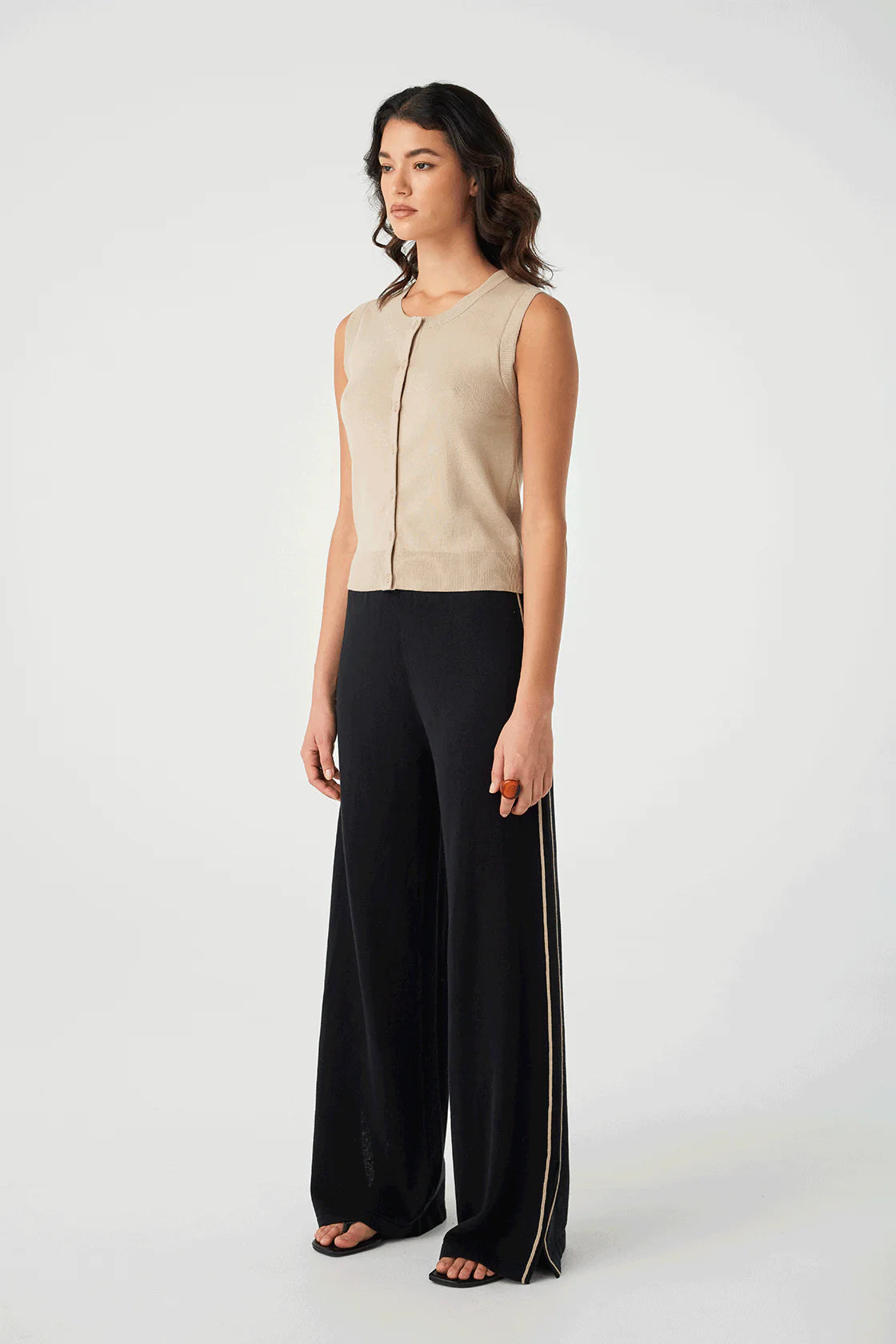 The Finley Button-Up Vest in Taupe is a sleek, minimalist staple for effortless layering. Its smooth knit texture, button-down front, and classic crew neck create a clean, polished look. The shrunken silhouette enhances versatility, pairing seamlessly with the Pippa Pant for a refined, modern outfit.