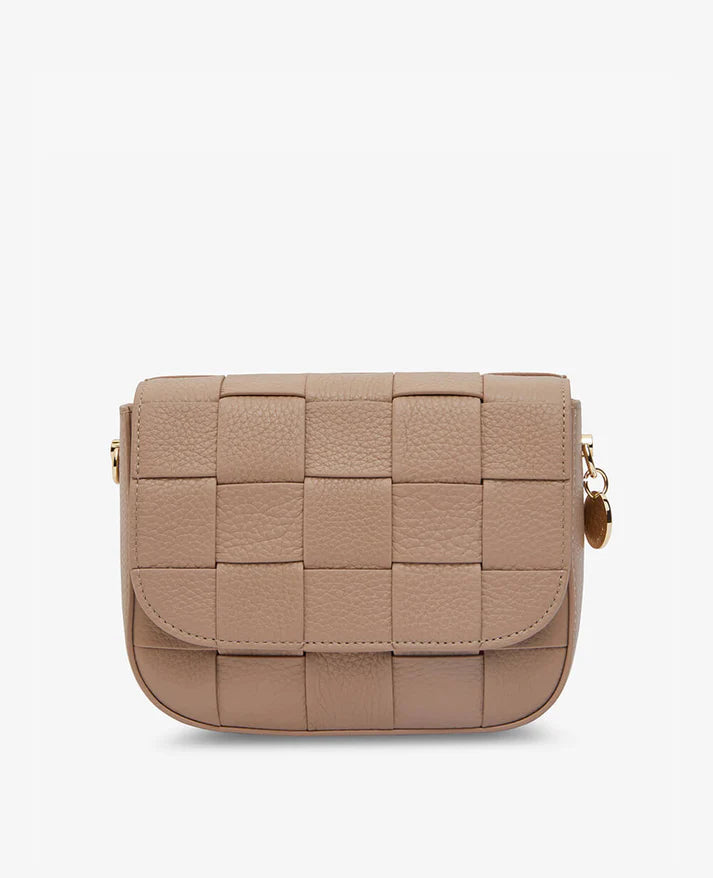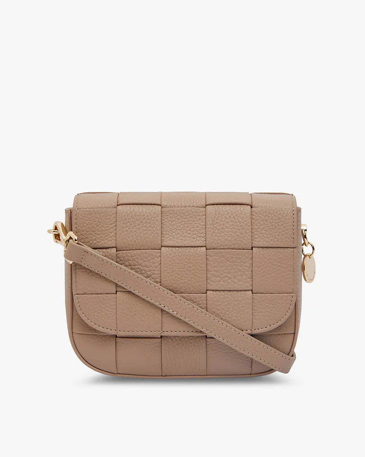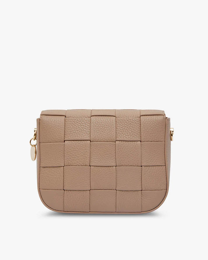 The Arlington Milne Clara Weave Crossbody in Fawn is crafted from pebble leather. The bag features light gold hardware, a gold-plated logo coin and a leather strap with buckle detail. The bonded leather top flap is secured with a hidden mag closure and opens to reveal Arlington Milnes signature hot pink lining and an open top slip pocket with leather trim.