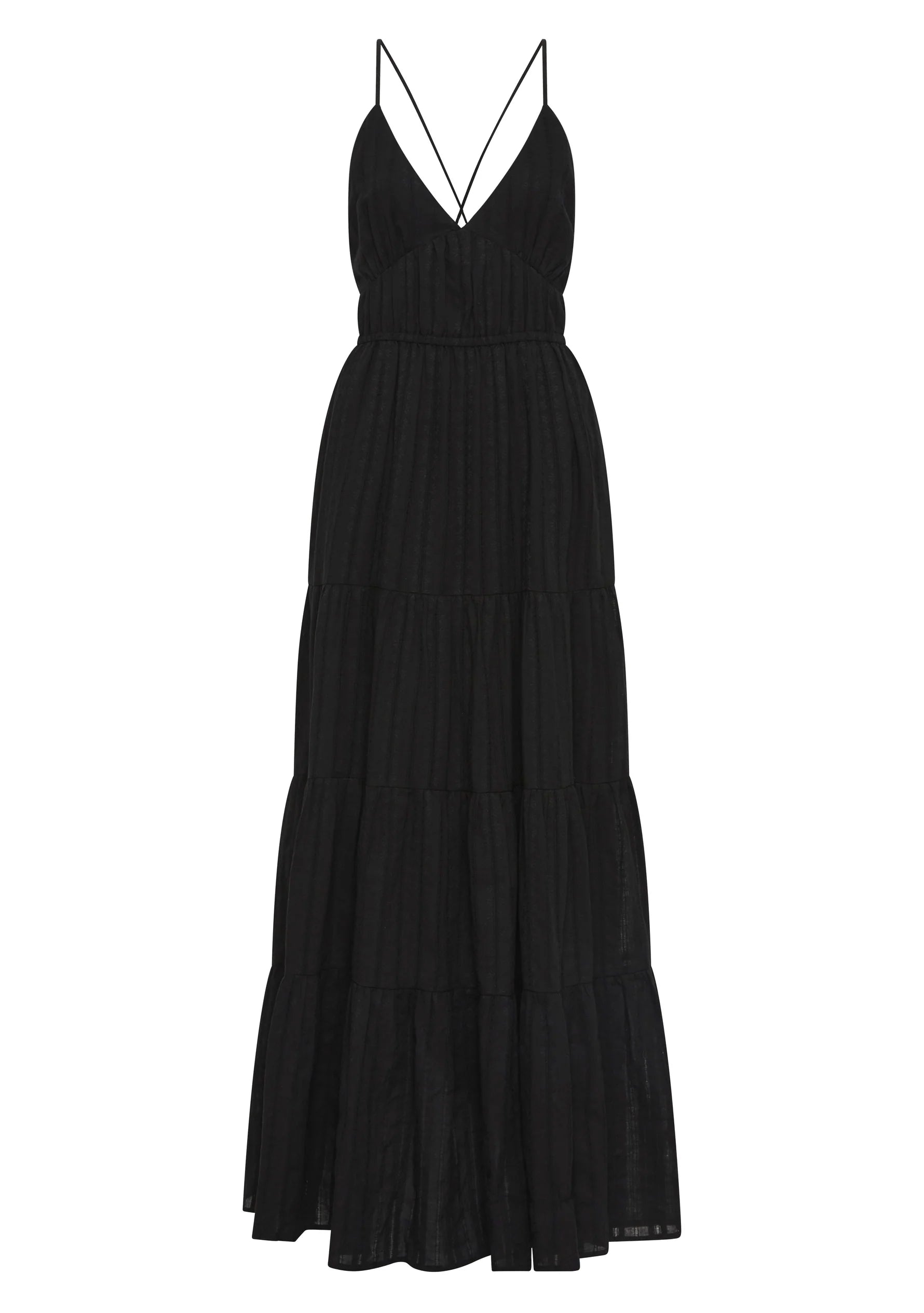 The Alessandra Maxi Dress in a glamorous black hue features a flattering V neckline, elasticated waist, and adjustable tie straps. It's full-volume skirt with tiers is crafted from textured cotton, offering a soft drape and hand feel.