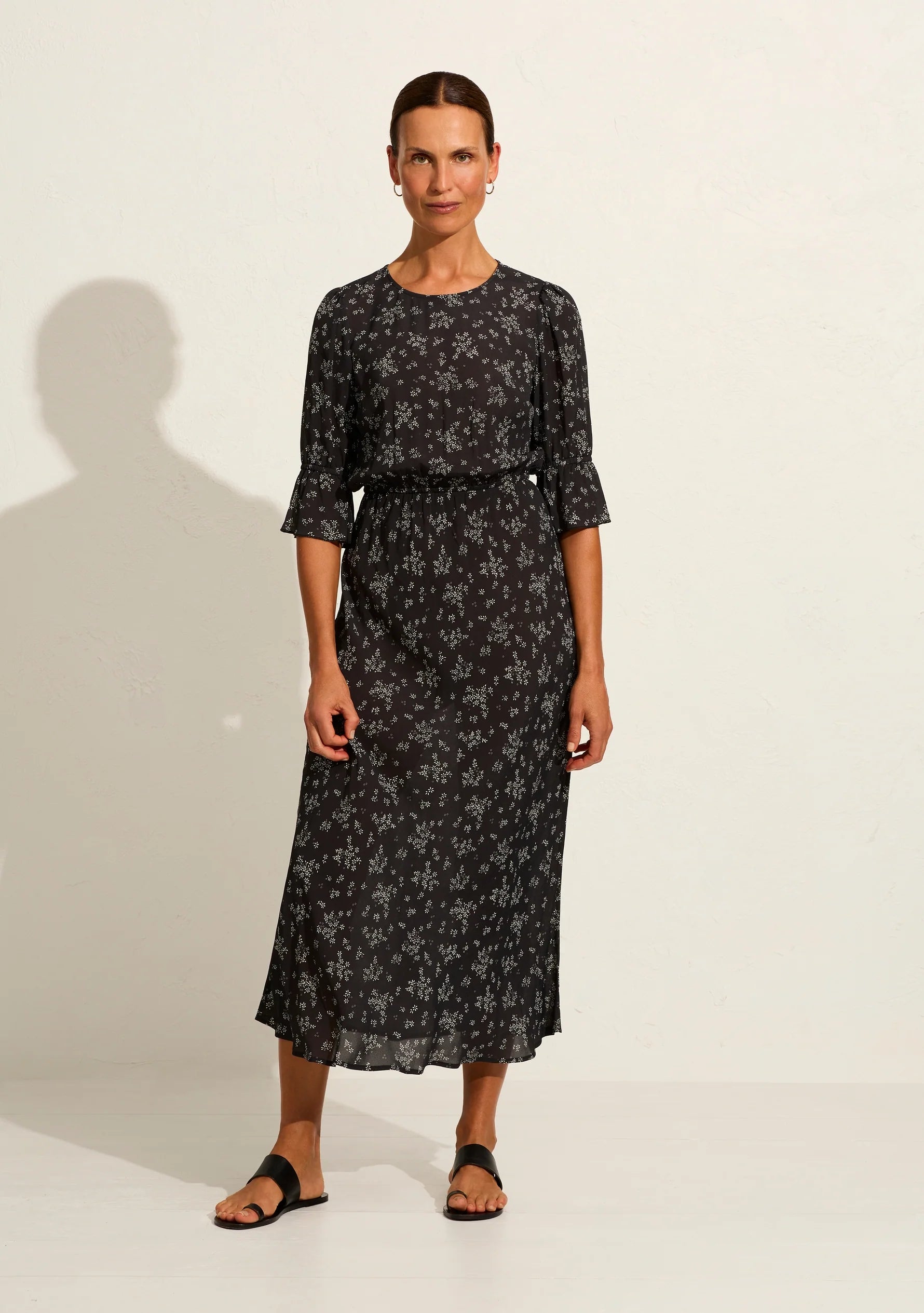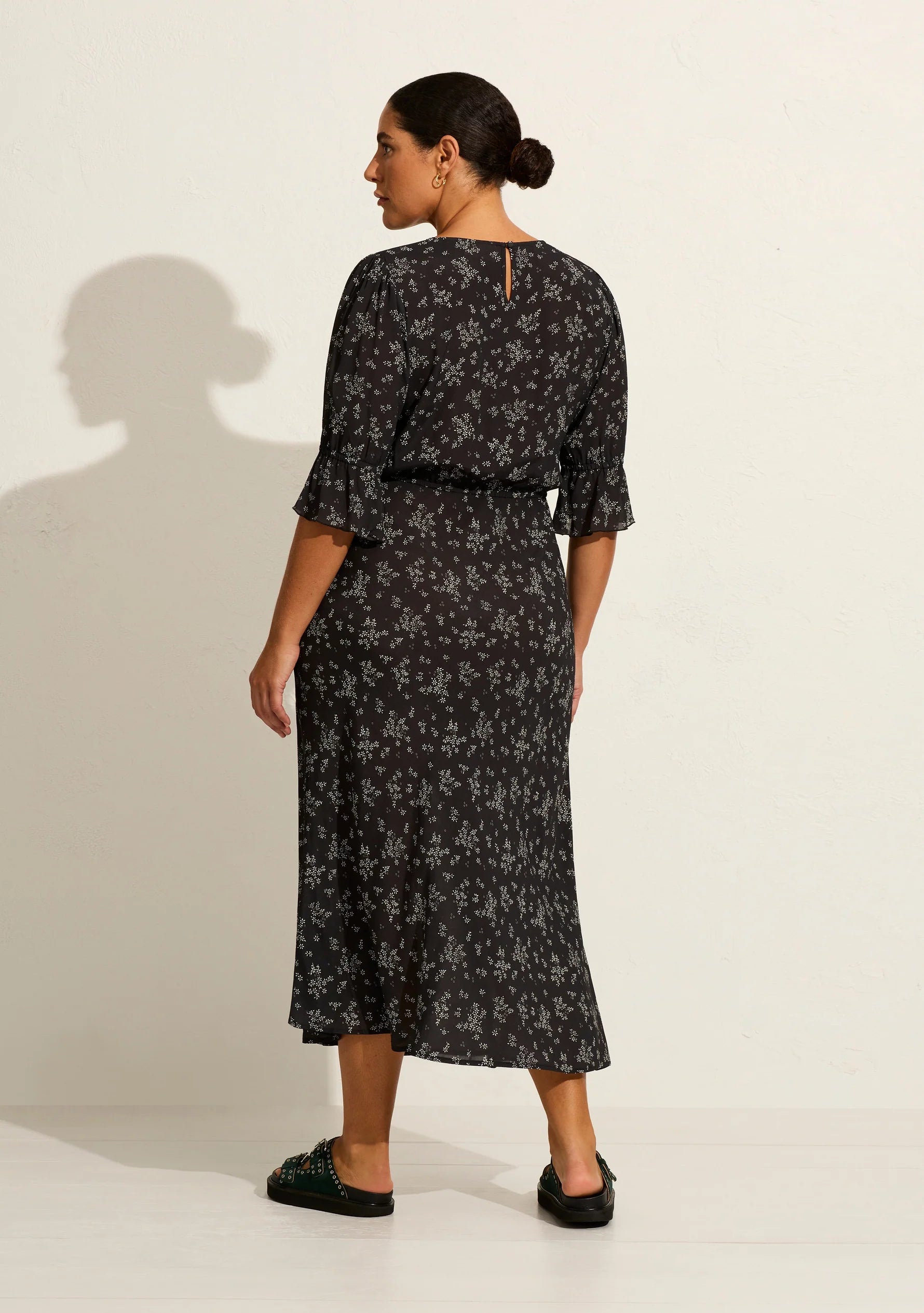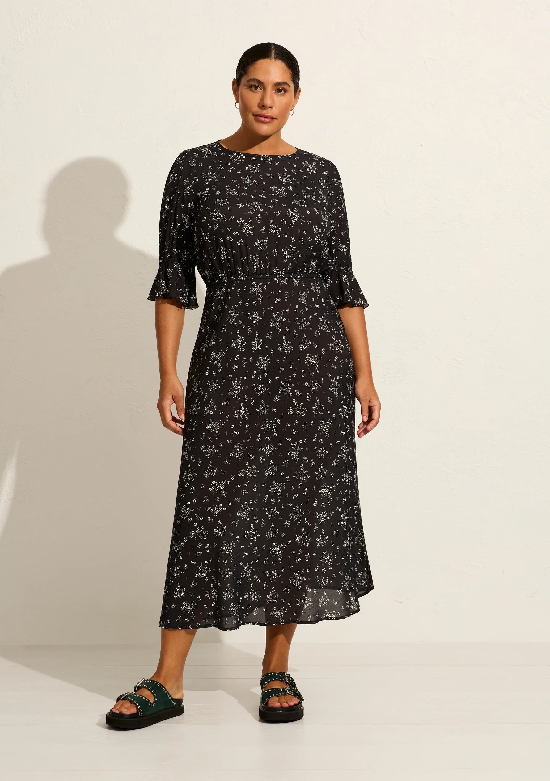 The Aruna midi dress in classic black Maeve print is one of our simple and elegant core pieces, featuring a round neckline, short sleeves with frill, an elasticated waistband, and a blouson top flowing into a flattering bias-cut skirt that falls into a draped hem. What's not to love?
