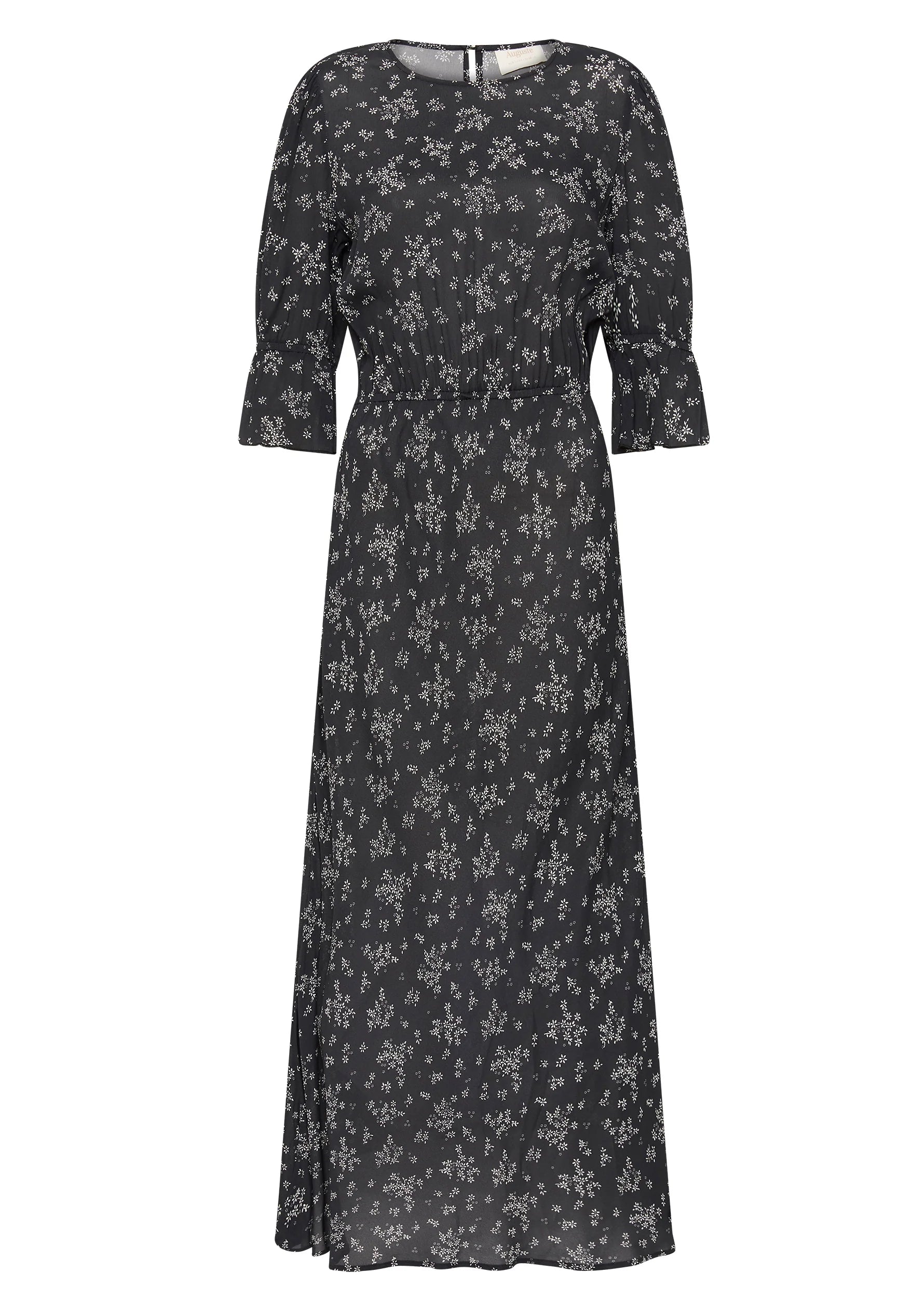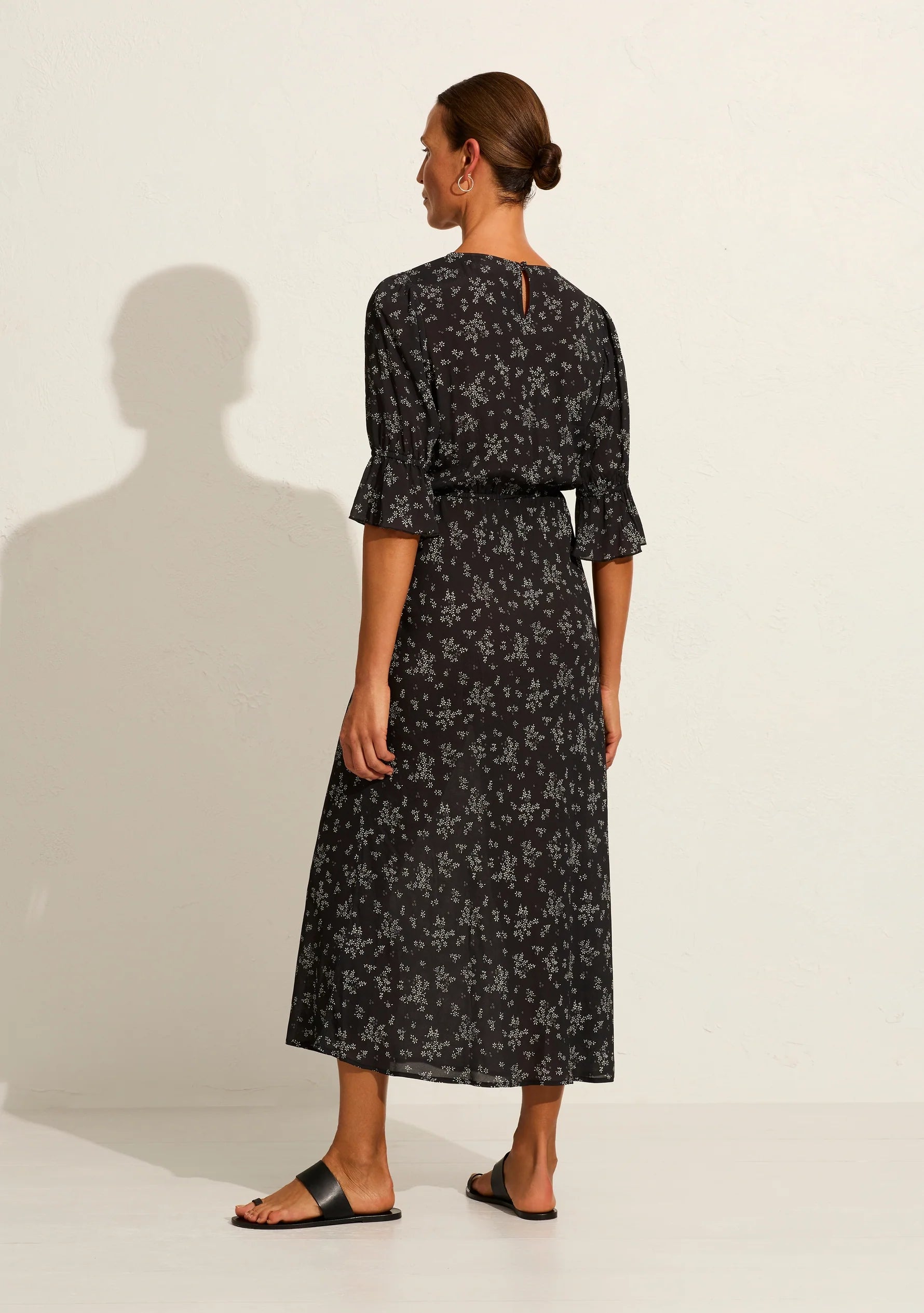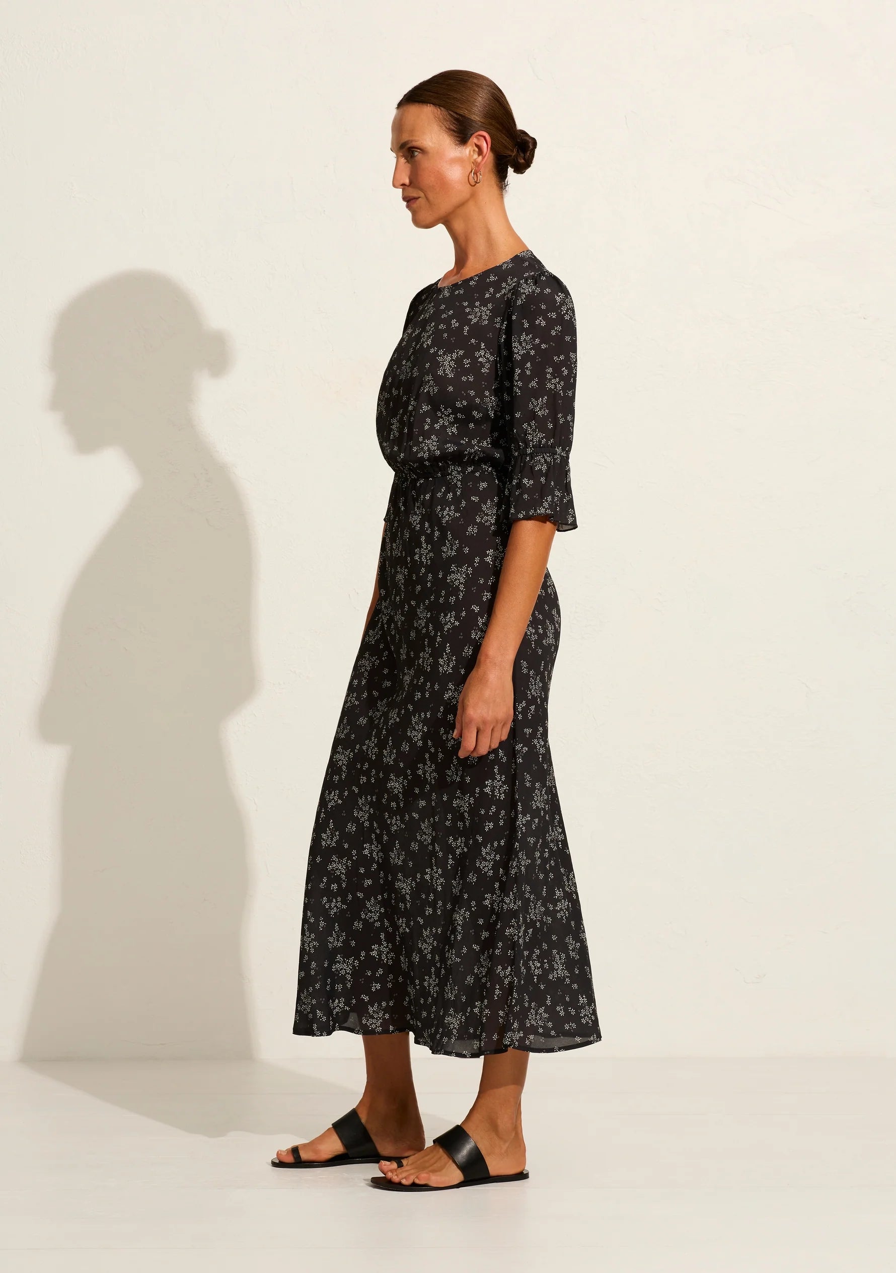 The Aruna midi dress in classic black Maeve print is one of our simple and elegant core pieces, featuring a round neckline, short sleeves with frill, an elasticated waistband, and a blouson top flowing into a flattering bias-cut skirt that falls into a draped hem. What's not to love?