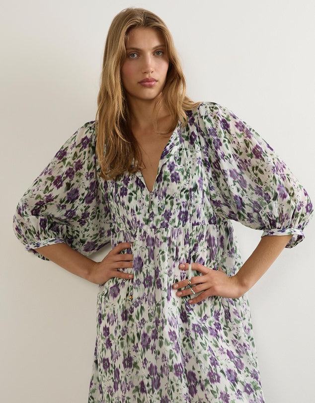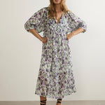 The Audrey Midi Dress features an optional tie V-neckline, voluminous 3/4 sleeves with fixed cuffs, and front and back yoke panels that cascade into a flowing skirt. Offering a touch of bohemian charm to your everyday wardrobe, this Auguste bestseller is available exclusively online and in-store.