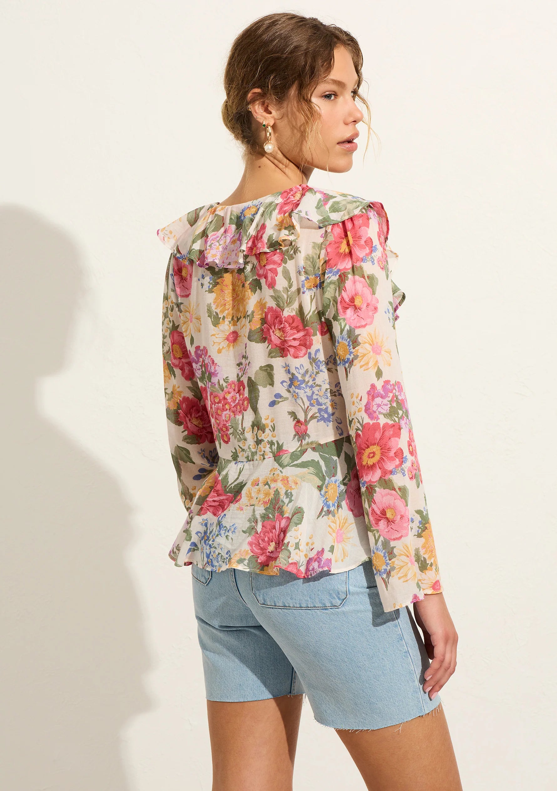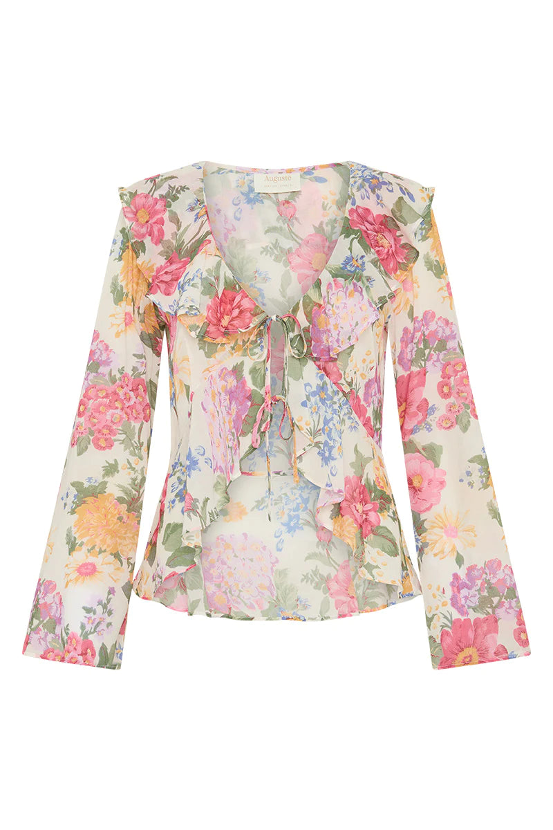 The Audrina Blouse in our Genevieve print features a deep V neckline with charming ruffle detail, adjustable tie closure, relaxed long sleeves, and a graduating ruffle hem.