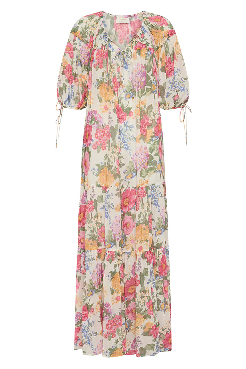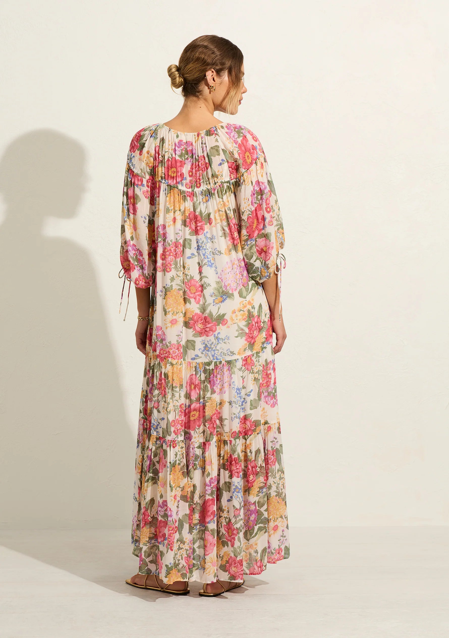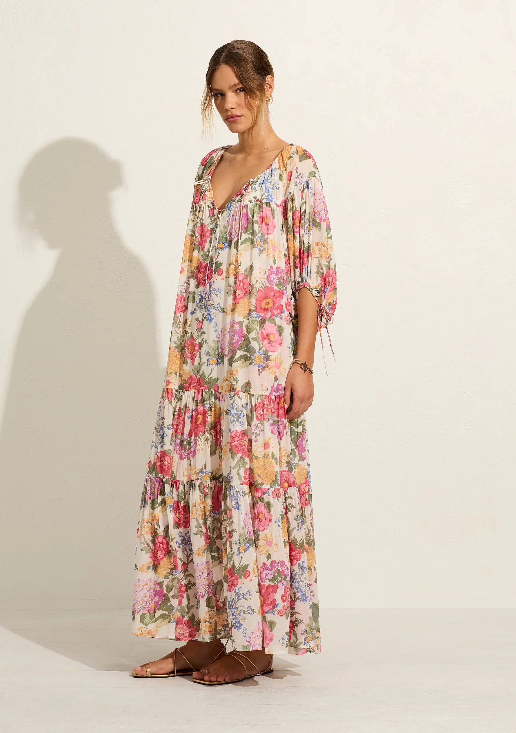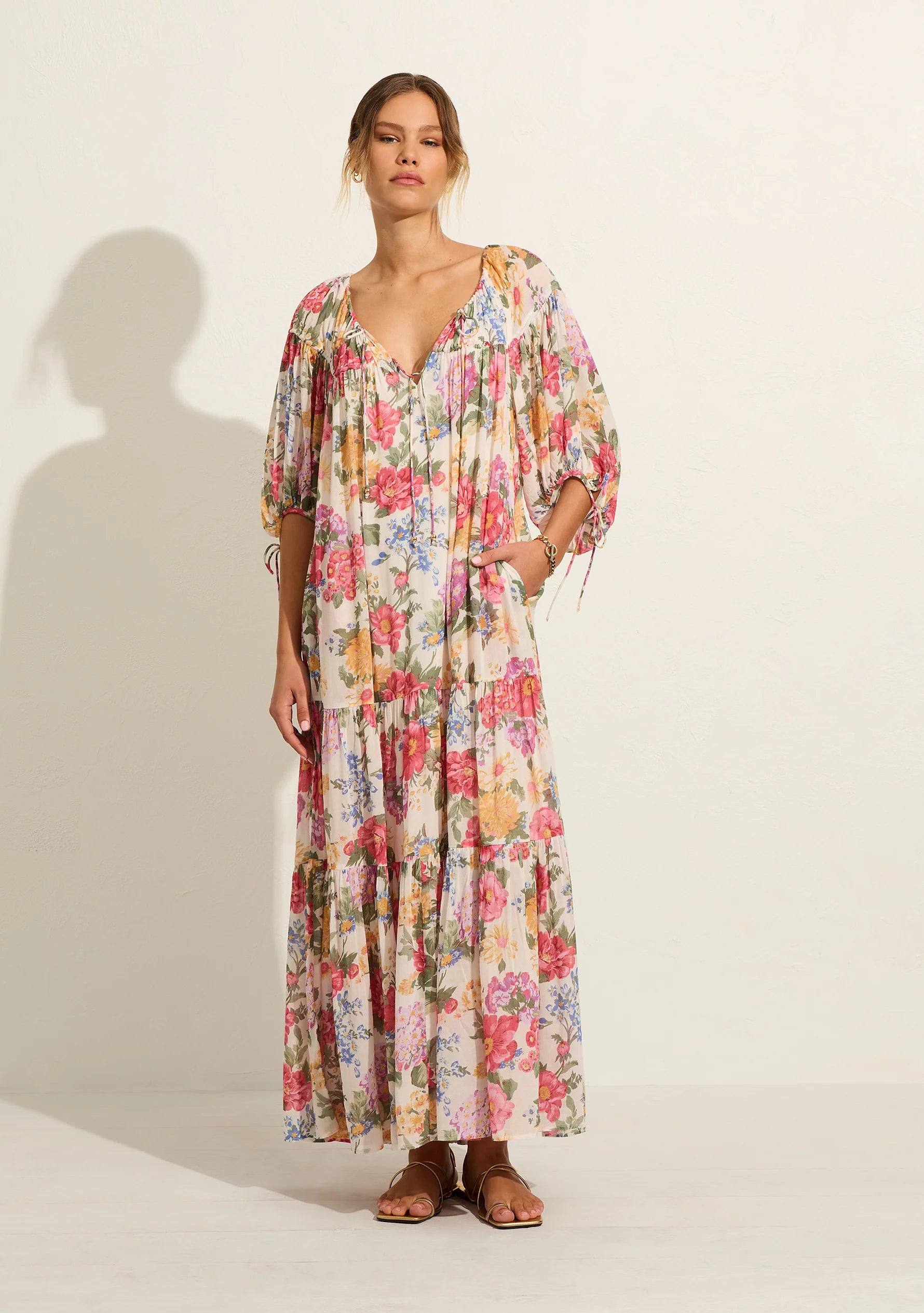 The Autumn Maxi Dress in our Genevieve print is a stunning piece with an optional open-close neckline and functional drawcord. It boasts voluminous raglan sleeves with tie cuffs and a tiered skirt. Made from lightweight, non-stretch fabric for a soft drape.