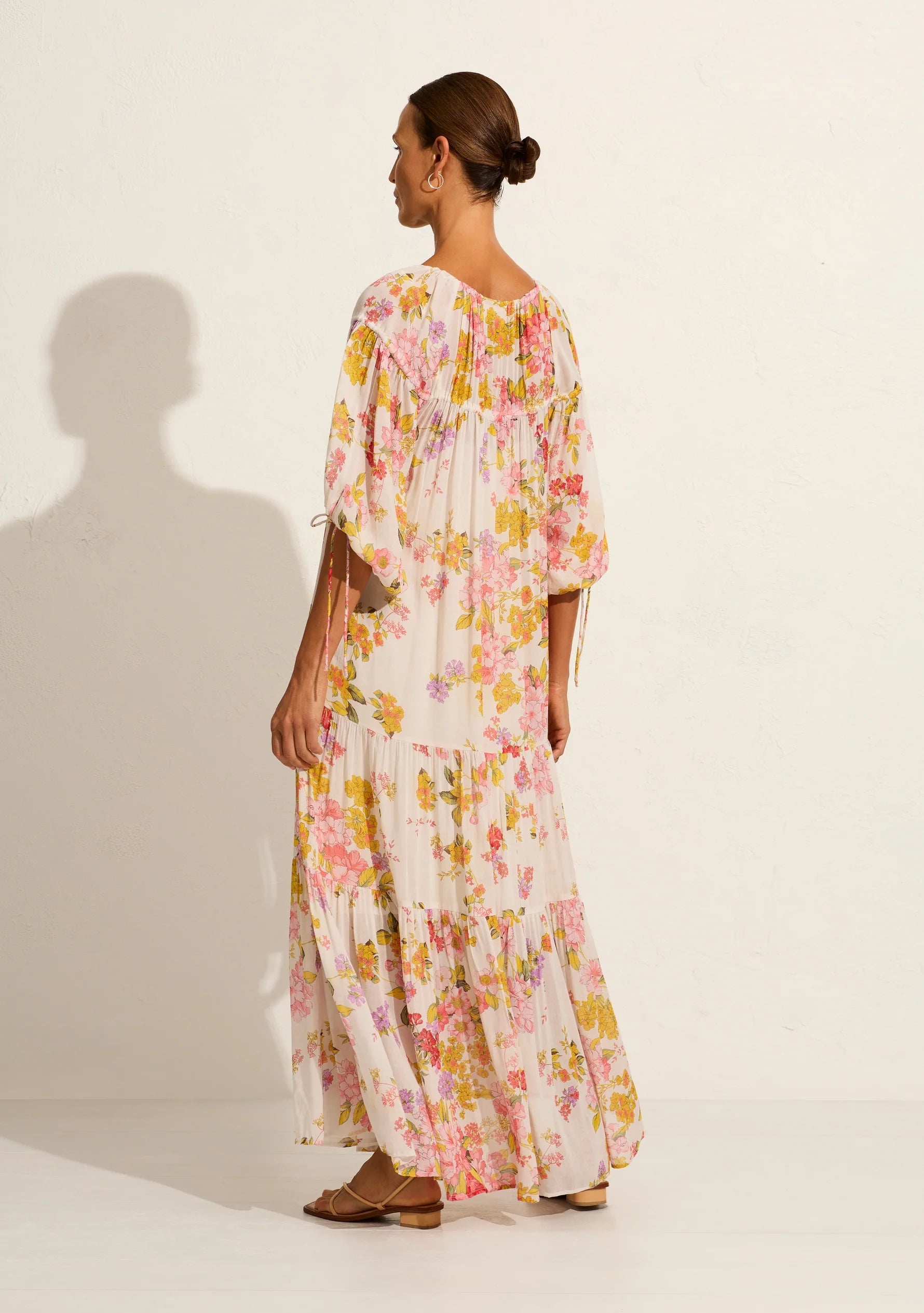 The Autumn Maxi Dress in our Elisabeth print is a stunning style featuring an optional open-close neckline with a functional drawcord. It has raglan sleeves with tie cuffs and a voluminous tiered skirt. Crafted from a lightweight cotton blend, it offers a soft, elegant drape.