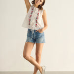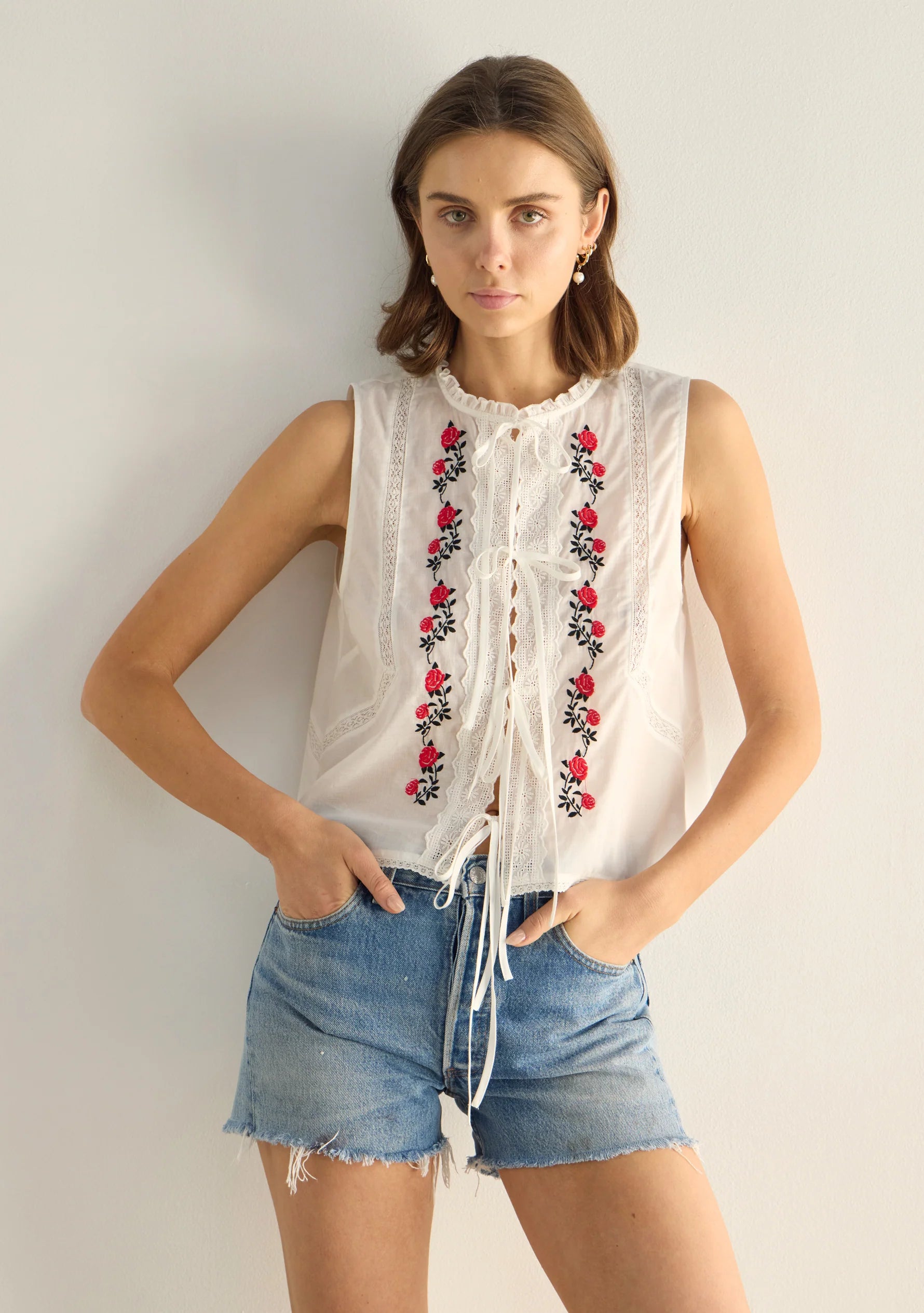 The Bellamy Embroidered Blouse in crisp white, with contrast hand-embroidered red roses, is your denim’s new best friend. In a super-flattering tank silhouette, no detail has been spared—intricate embroidery, delicate pin tucks, lace touches, and functional ties—crafted from deliciously soft organic cotton. A sweet, artisanal piece made to brighten every warm day.