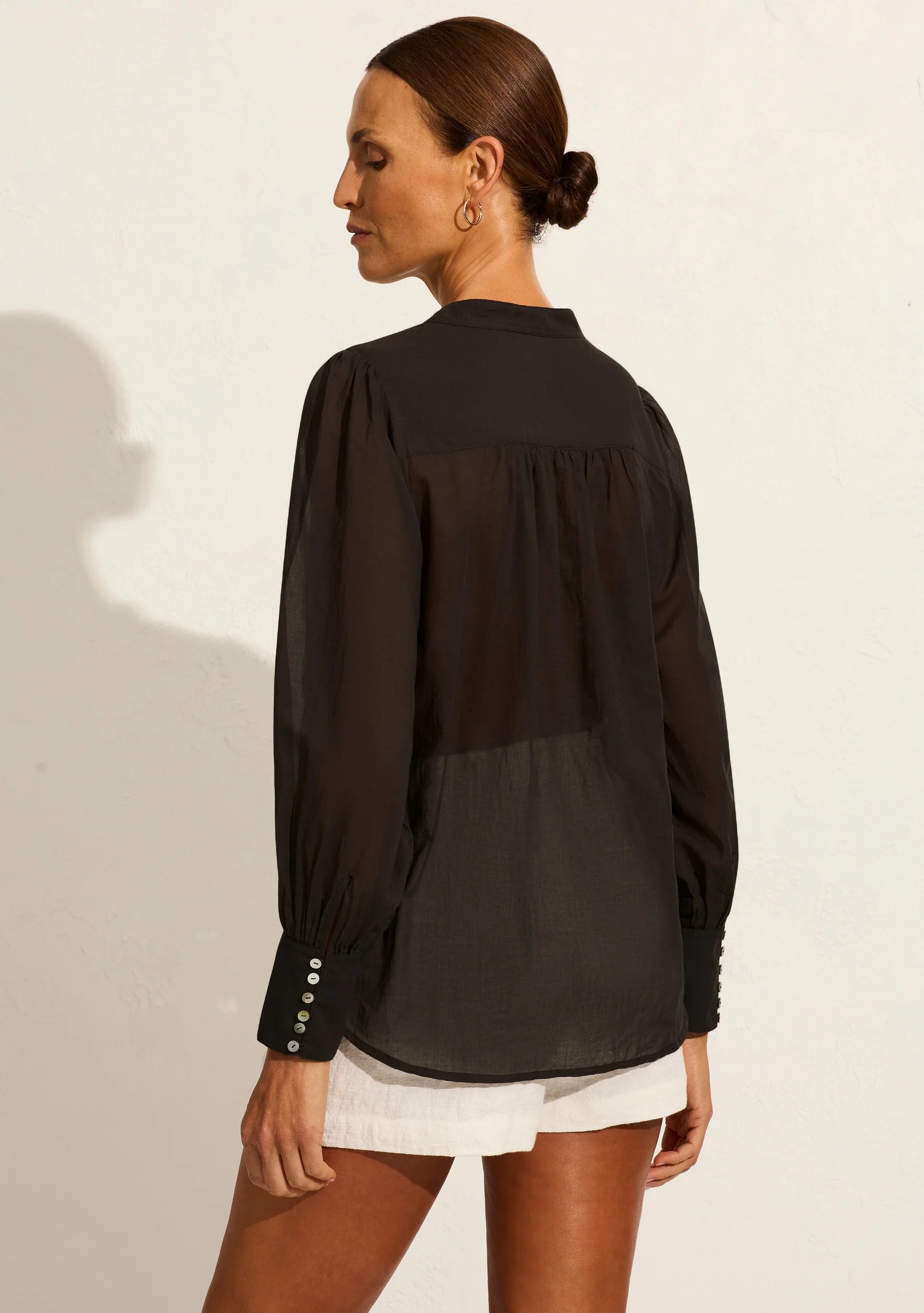 The Birdie Blouse in classic black showcases exquisite hand-embroidered details by our talented artisans in Bali. This style features a mandarin-style collar and blouson sleeves ending in fixed extended cuffs with shell buttons. Your denim's new best friend.