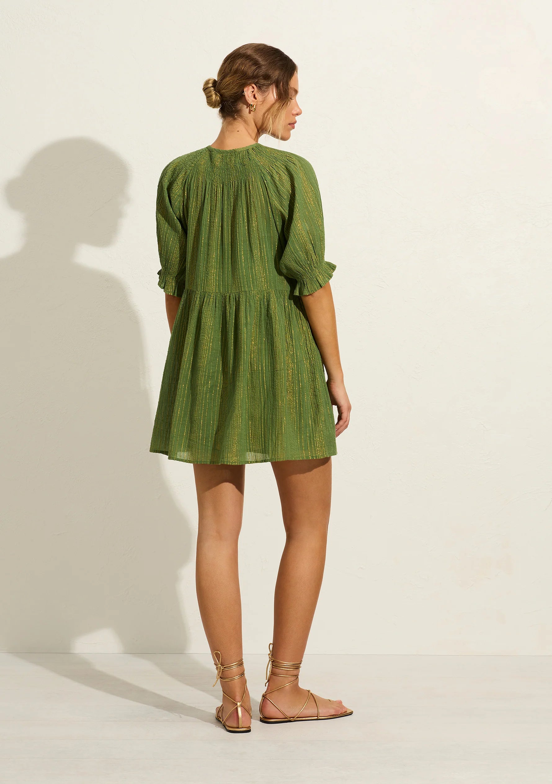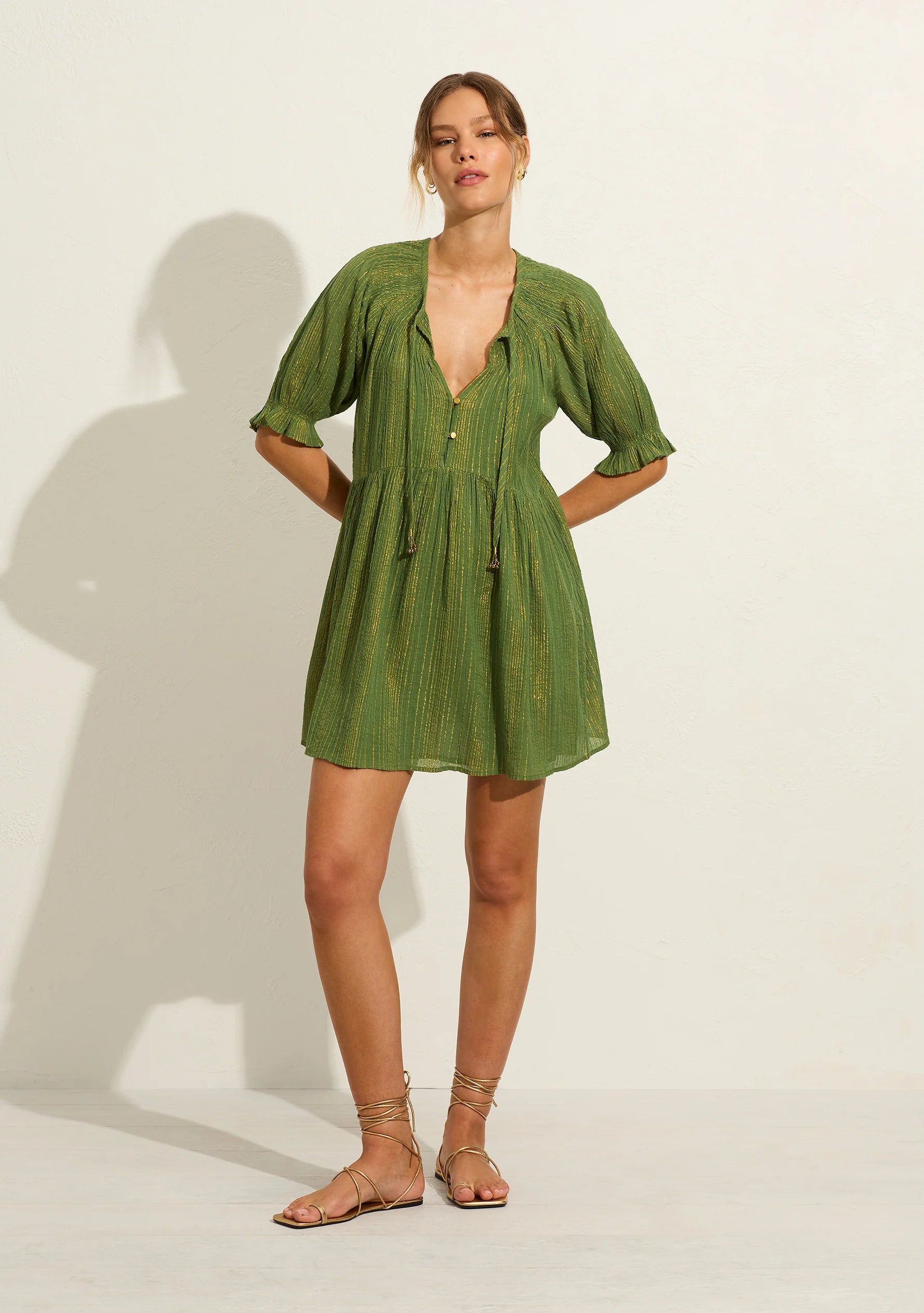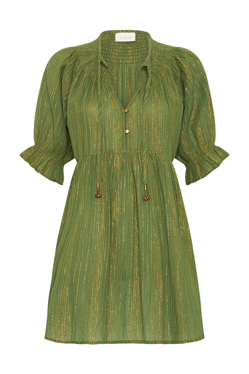 The seasonal green Brielle Mini Dress features our signature gold lurex thread, a charming V neckline with an optional tie, shirring around the neckline, and raglan puff sleeves with elastic cuffs. It's endlessly versatile, you won't want to take it off.