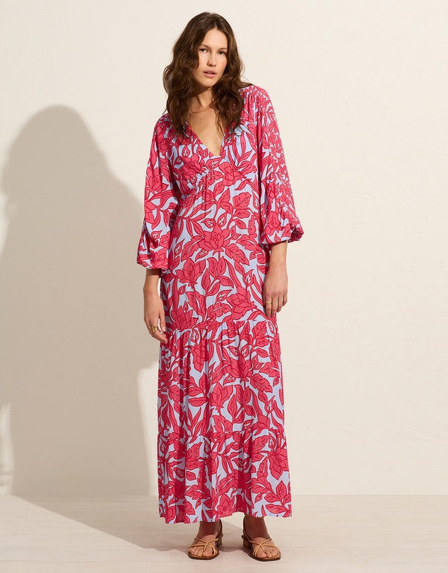 The Clovette Maxi Dress in epitomises elegance with its V neckline and billowing blouson sleeves. It features an underbust seam with soft gathers and a tiered maxi skirt. This dress is a standout piece in any wardrobe.