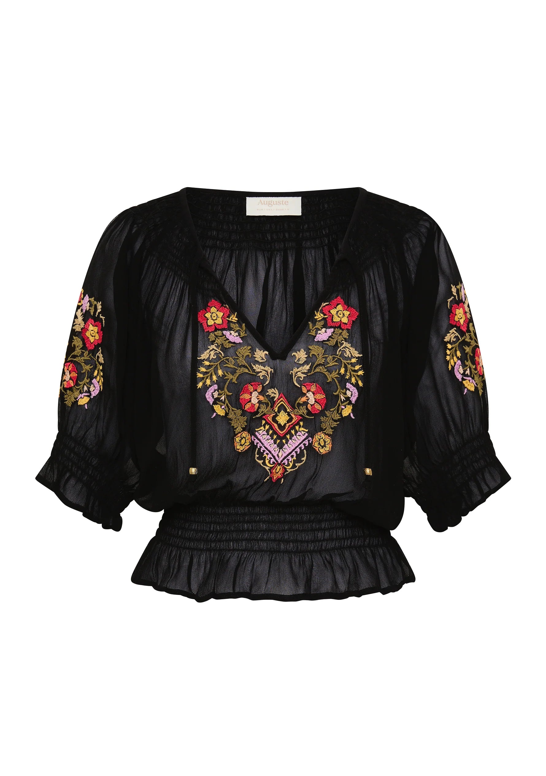 The Coralie Blouse channels 60s bohemian elegance with its V neckline, featuring intricate hand shirring and embroidery on the neckline and sleeves, along with an optional tie closure. Crafted from a semi-sheer georgette crepe, no detail is spared. Pair it with your favorite vintage denim any day of the week!