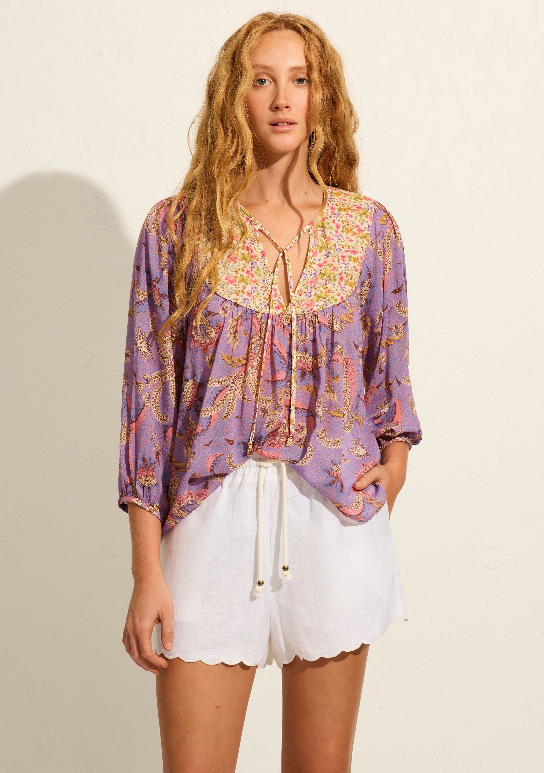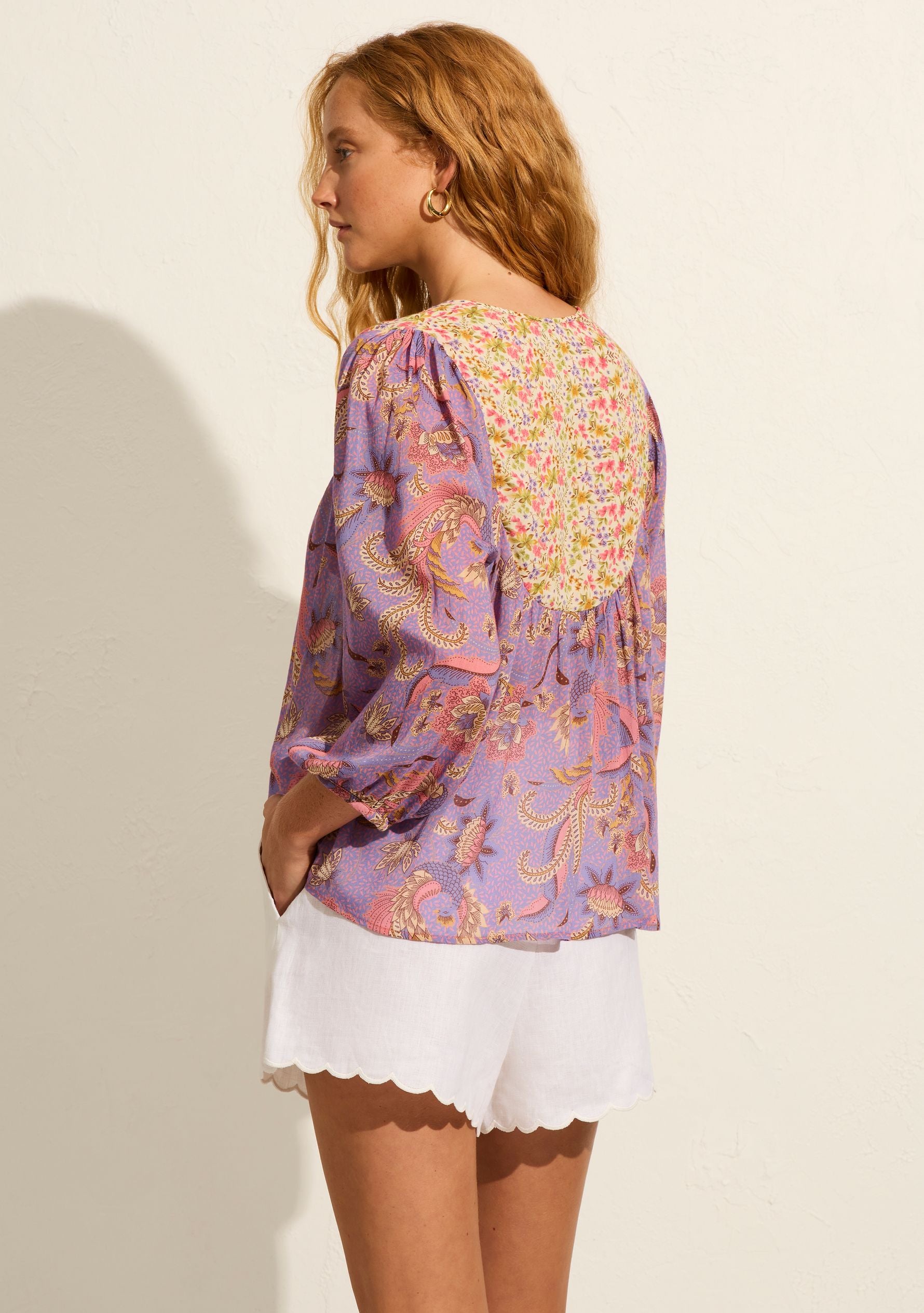The Days Blouse in our Harmony print with contrasting yolk and frill detail is a bohemian staple.