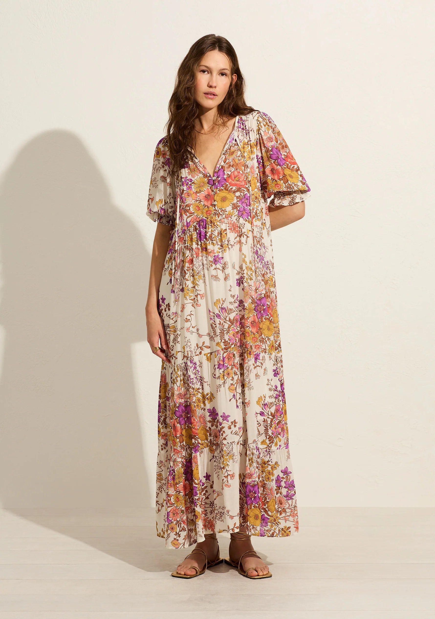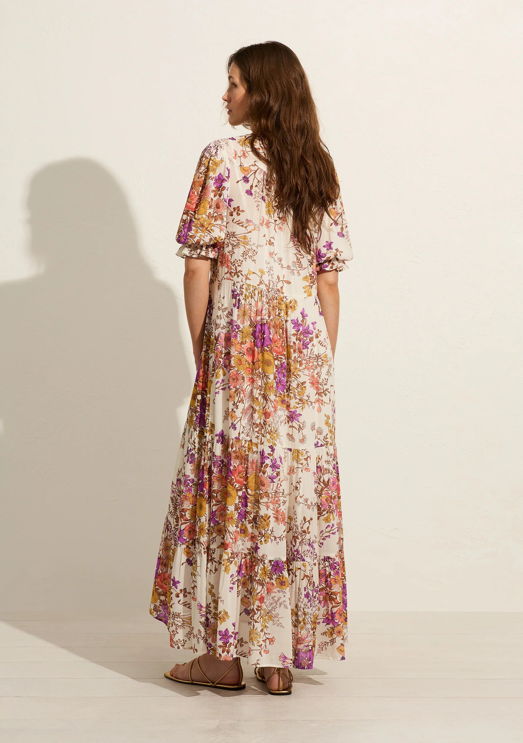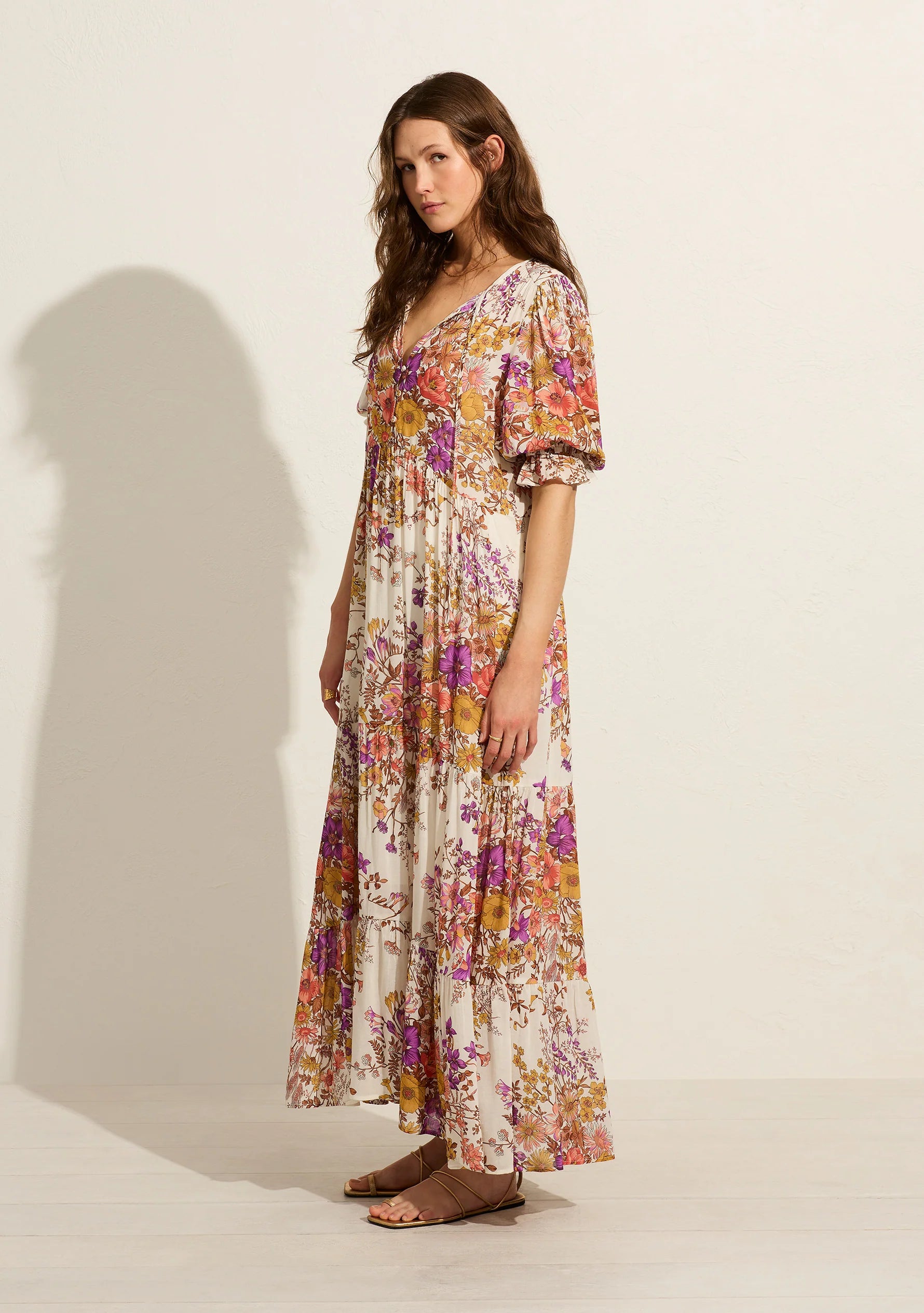 The best-selling Jessa Maxi Dress in Ivory Callie print is versatile for any occasion. Featuring a V neckline with a neck tie, button front closure, puff sleeves, and a voluminous tiered skirt.