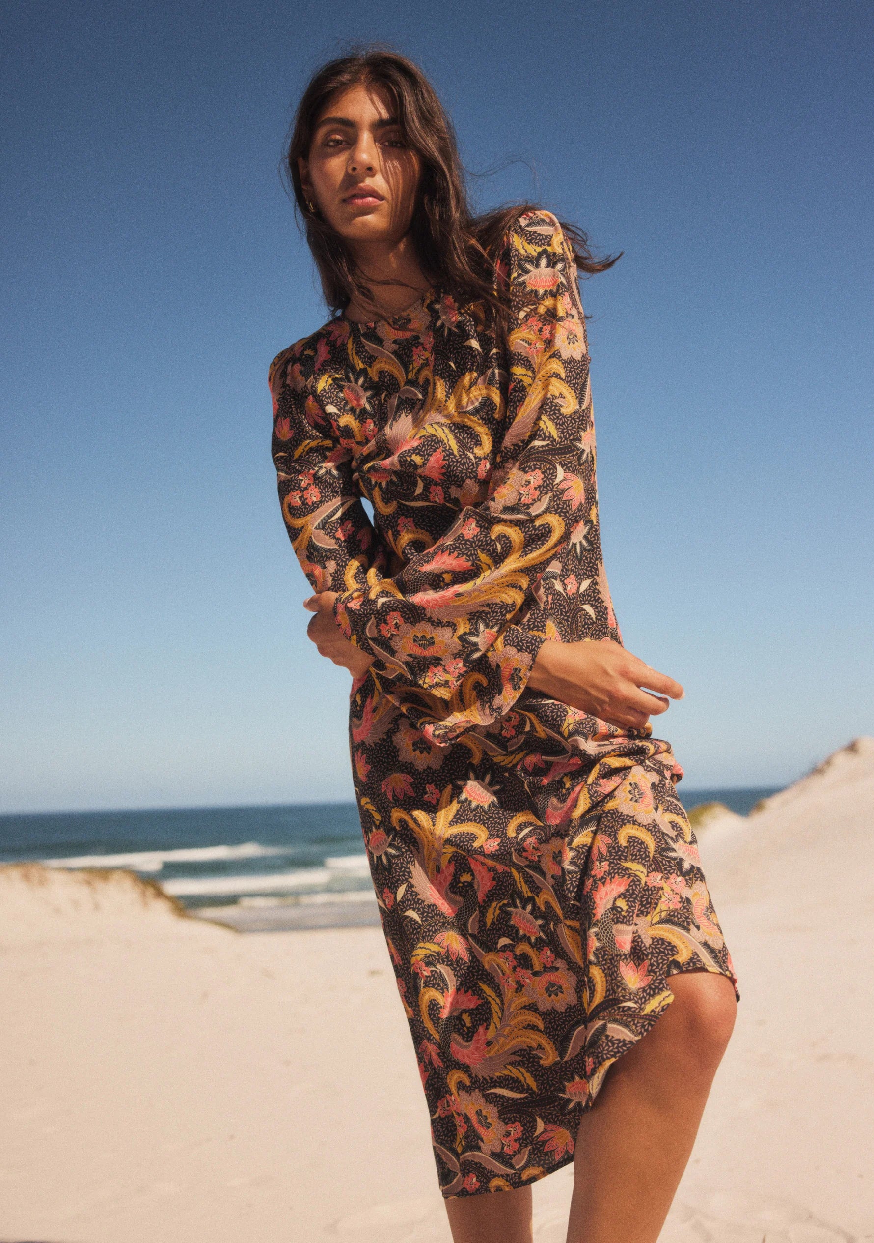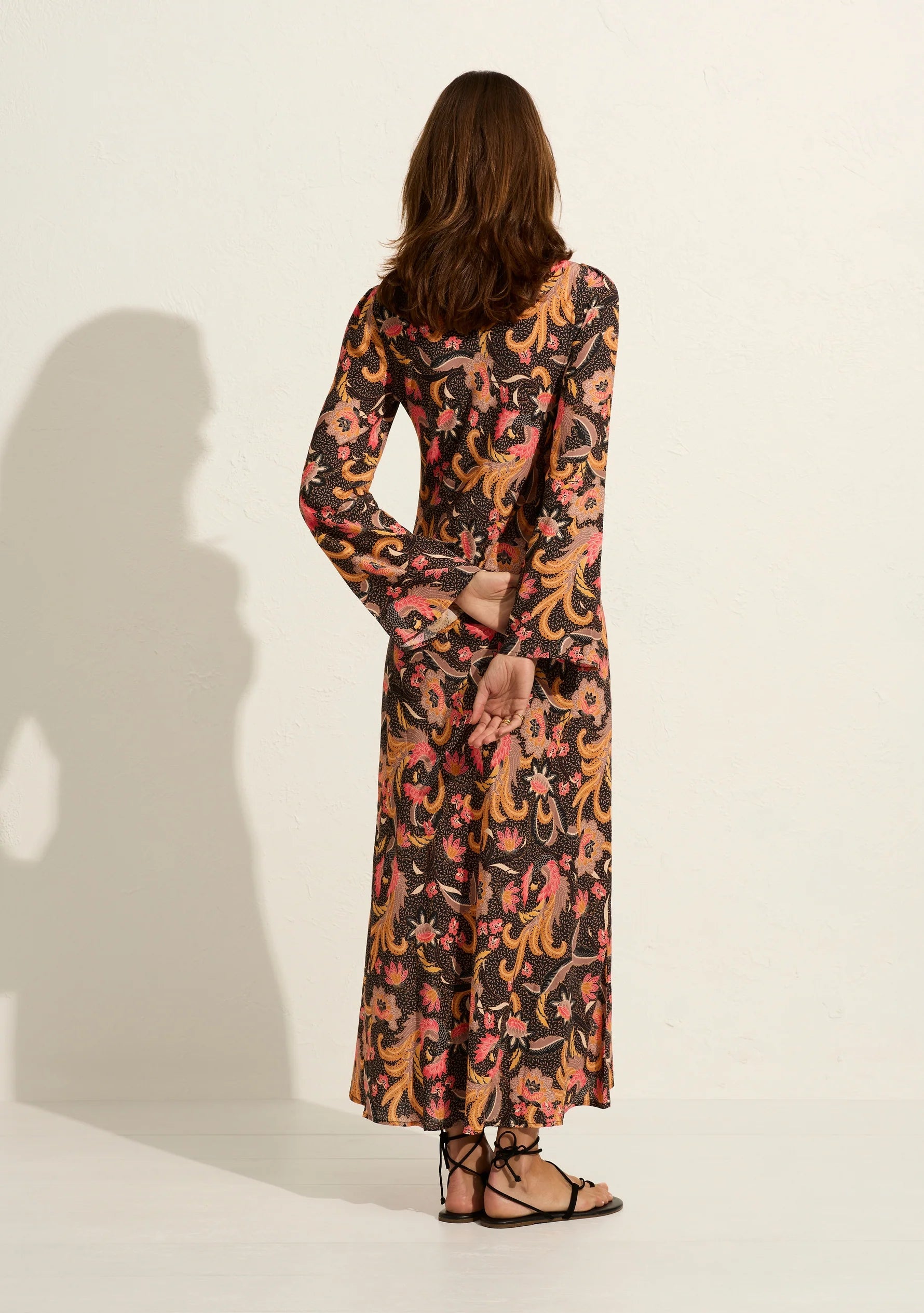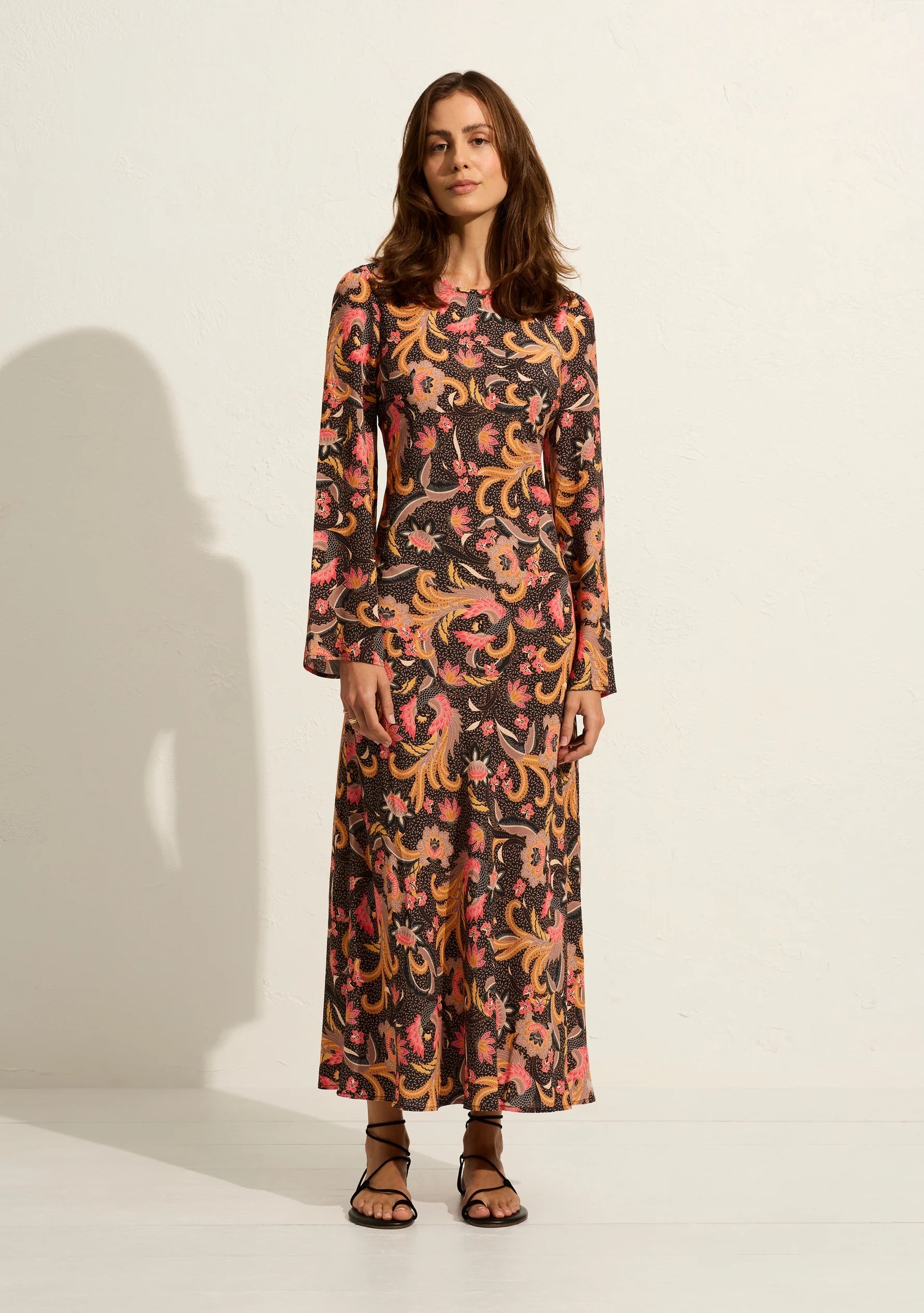 The timeless Kalea Midi Dress in our Charcoal Arizona Print features a round neckline with elegant long sleeves into an open cuff. This flattering style features a bias-cut silhouette that fits to the shape of your body and falls to a draped hem with a waist for a more personalised fit.