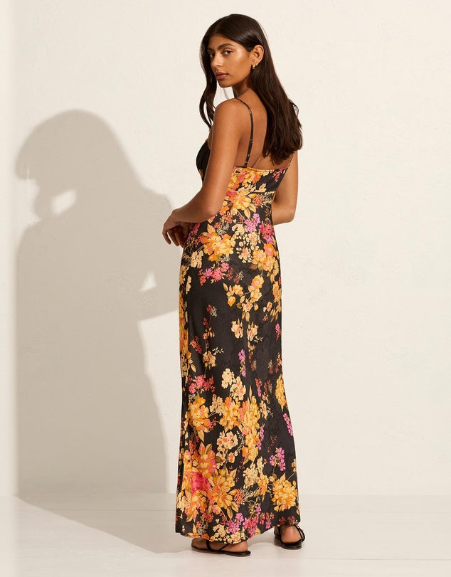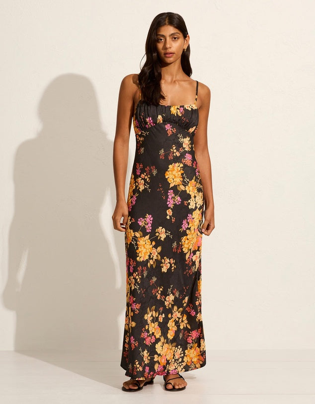 The Lavinia Midi Dress in soft khaki effortlessly transitions from day to night with its adjustable straps, gathered bust detail, and flattering bias-cut silhouette.