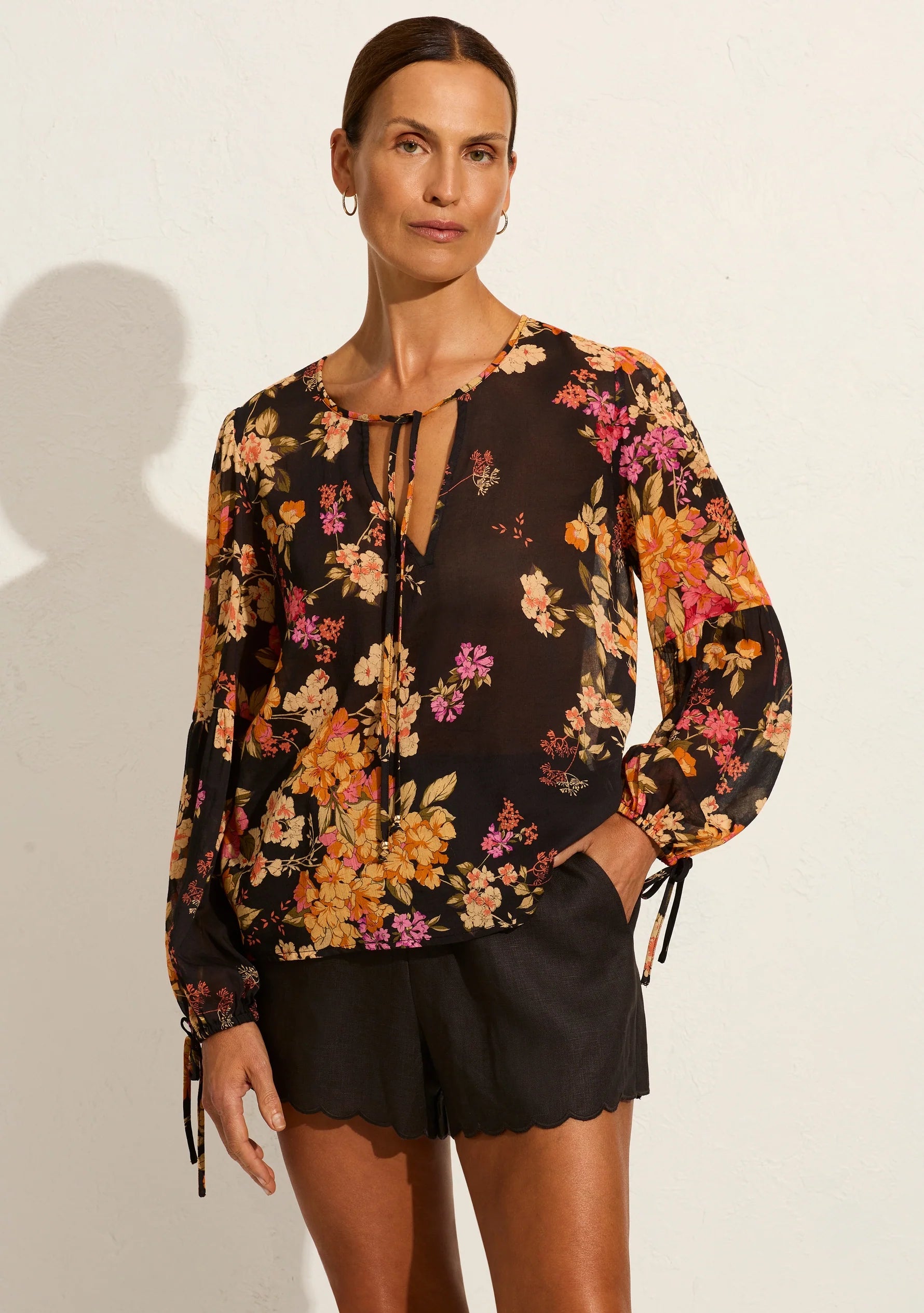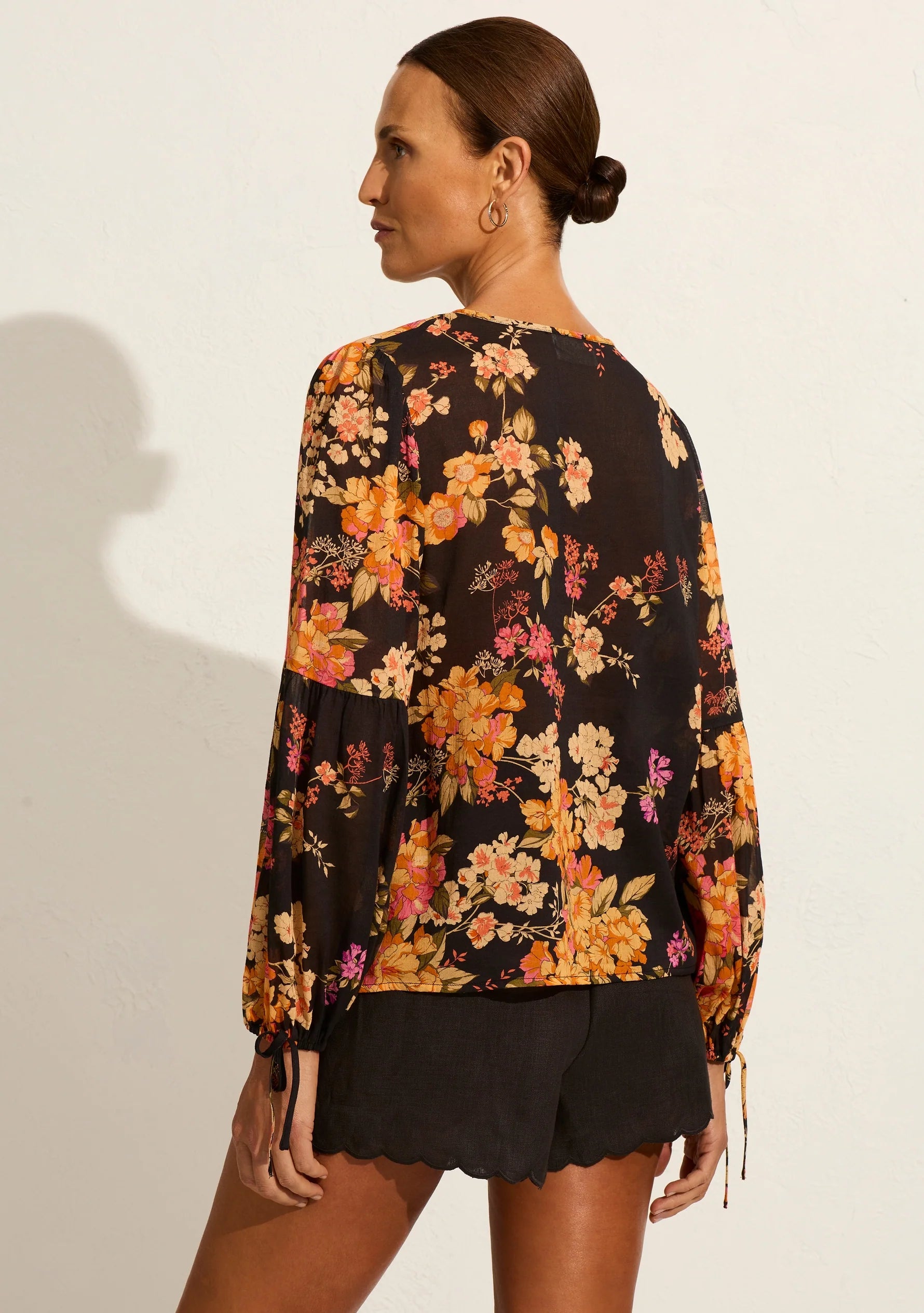 The Lennox Blouse is crafted from a soft cotton blend in our vintage-inspired Elisabeth floral. It features a V neckline with a tie detail, blouson sleeves with elasticated cuffs and ties. It's your denim shorts' new best friend!"