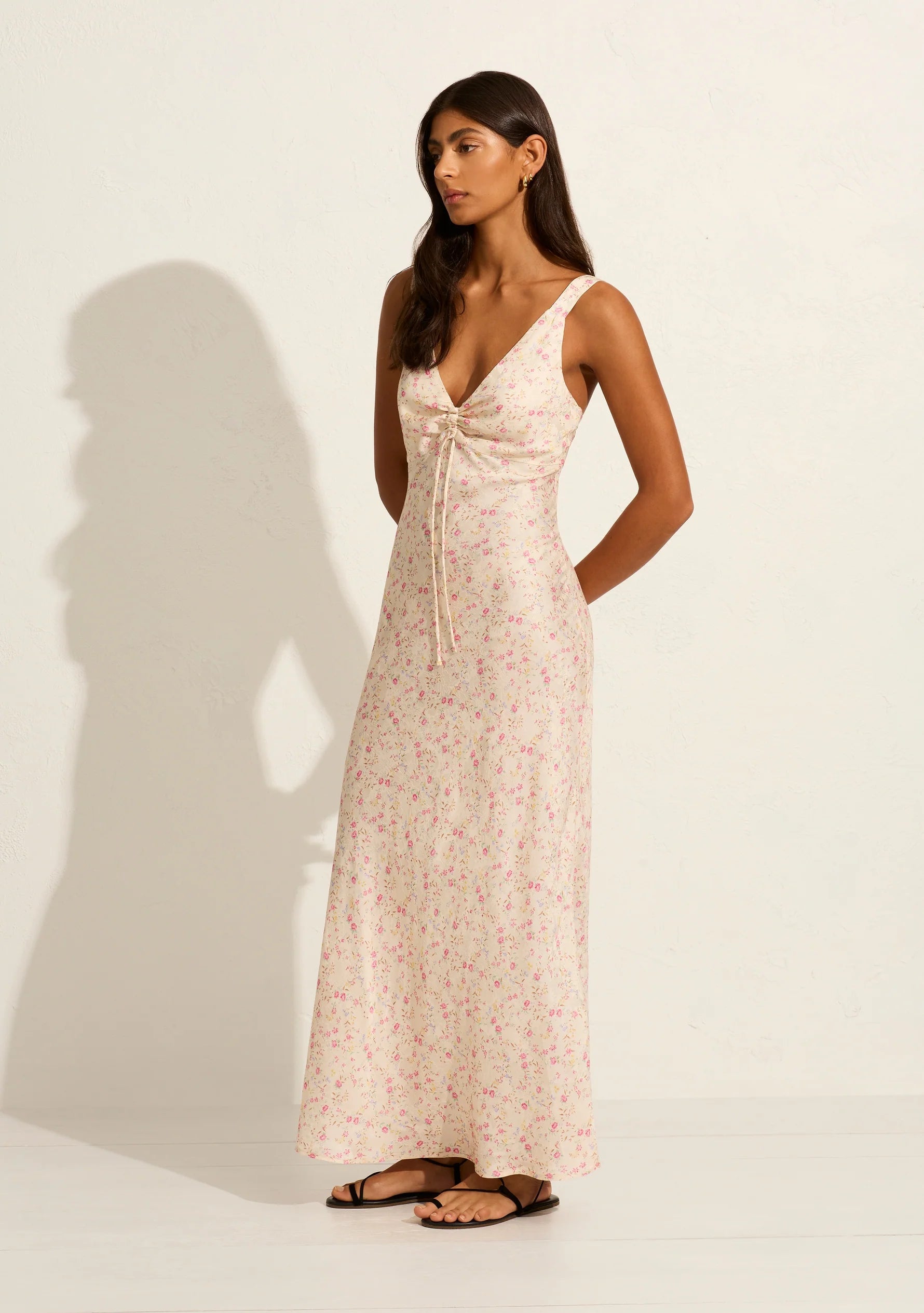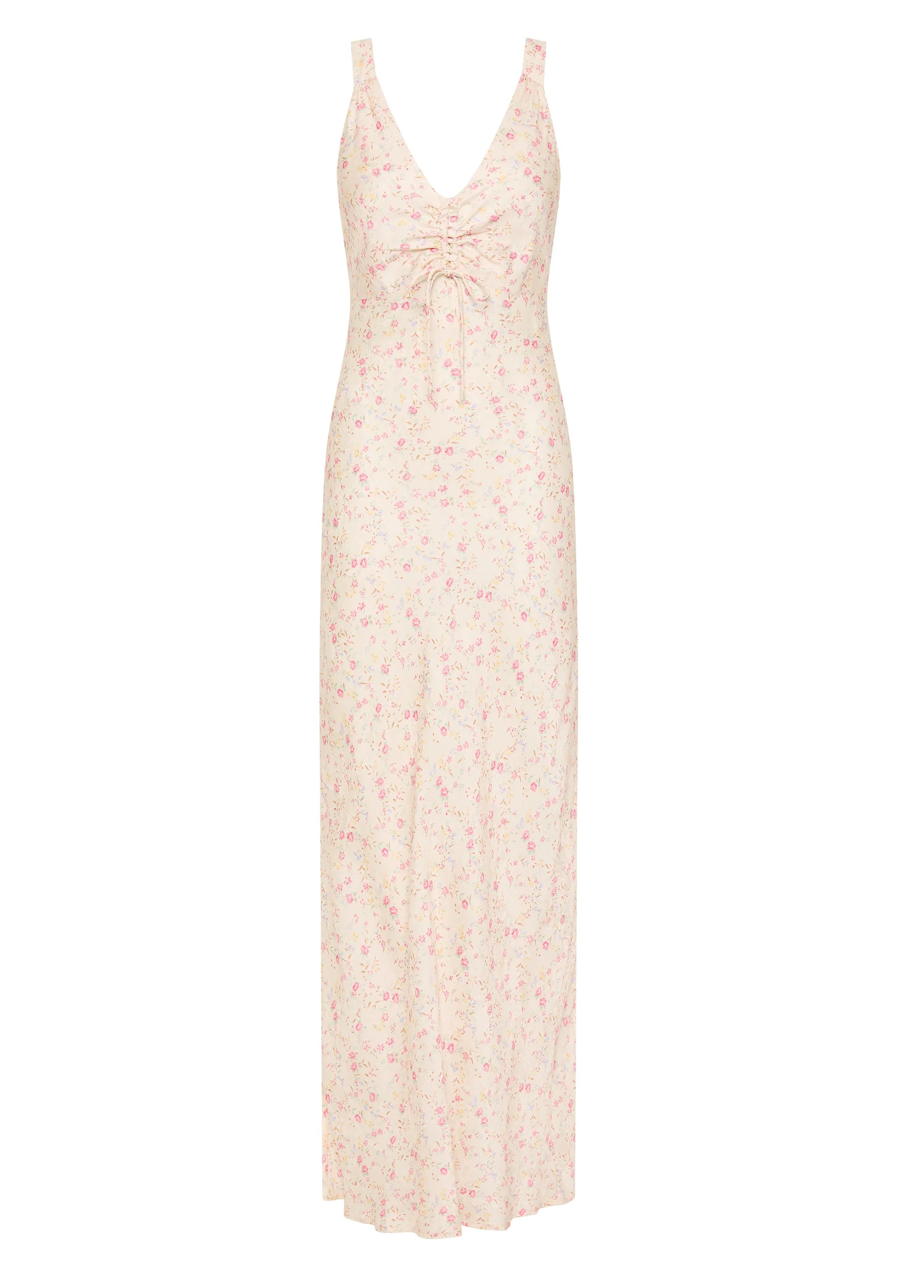 The Melodie Maxi Dress in our creamy white Milana print is a heavenly piece with a V neckline and gathered drawstring detail. It features thick fixed straps and a flattering bias-cut silhouette that conforms to your body shape, gracefully falling to a draped hem. Made from a silky floral jacquard, it offers an elegant and luxurious feel.