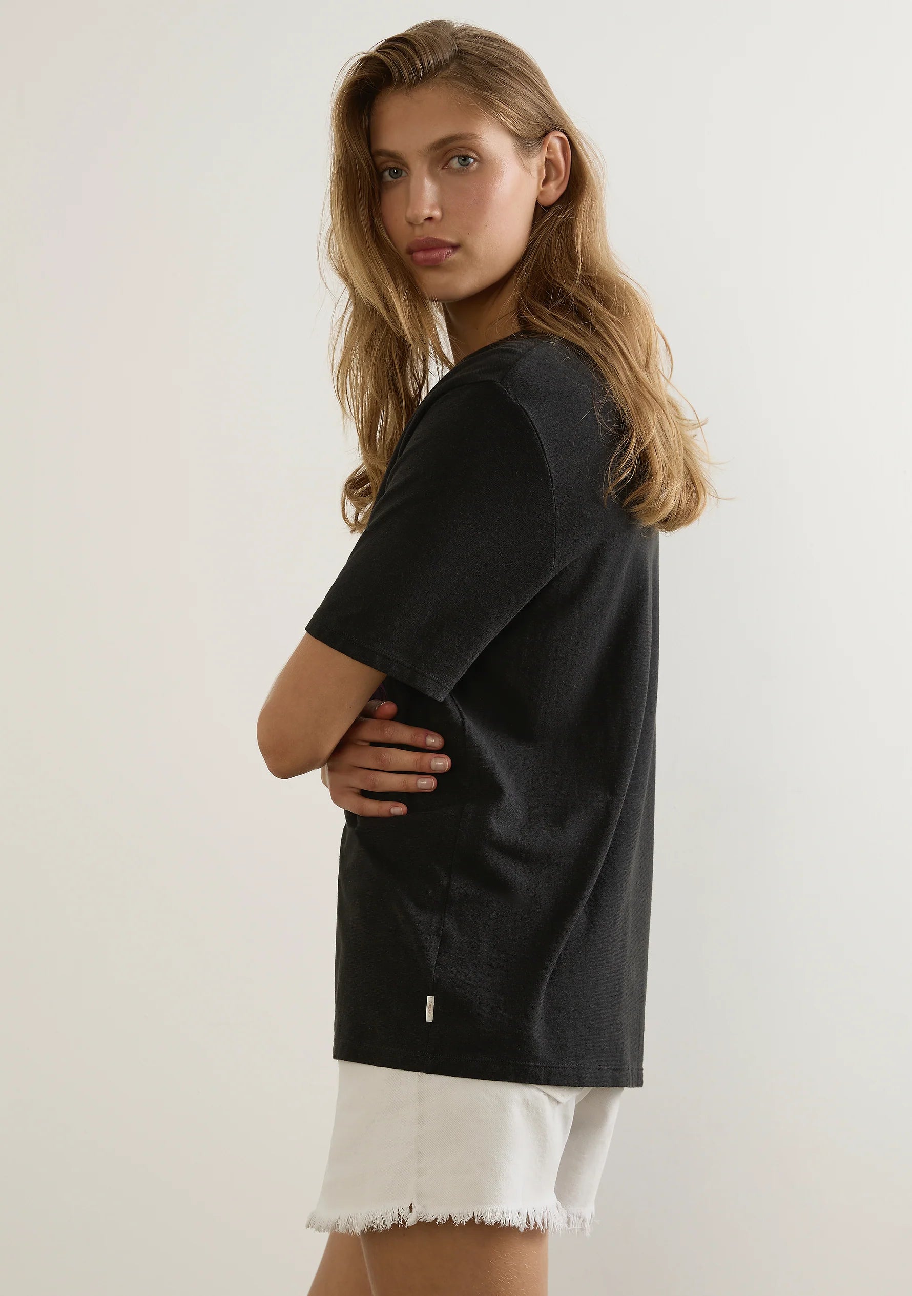 he Mystique Classic Tee in black is an everyday essential with a luxe, laid-back feel. Crafted from a sustainable hemp and organic cotton blend, it features a classic crew neckline and a true-to-size fit. The perfect piece to pair back with denim or floaty skirts, it’s a timeless staple for every wardrobe.