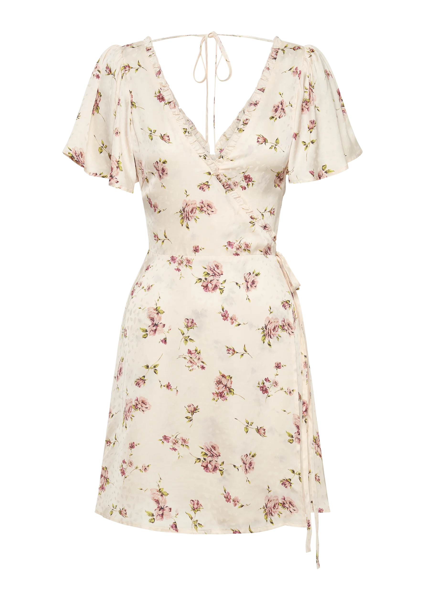 The Pepper Mini Dress in Ivory Isla Floral is a chic and stylish piece with its V neckline and subtle frill details. The functional wrap design adds a touch of elegance, while the flutter sleeves create a feminine look. Crafted from mid-weight, non-stretch fabric with a floral satin finish, it offers a luxurious feel with its silky touch and beautiful drape.