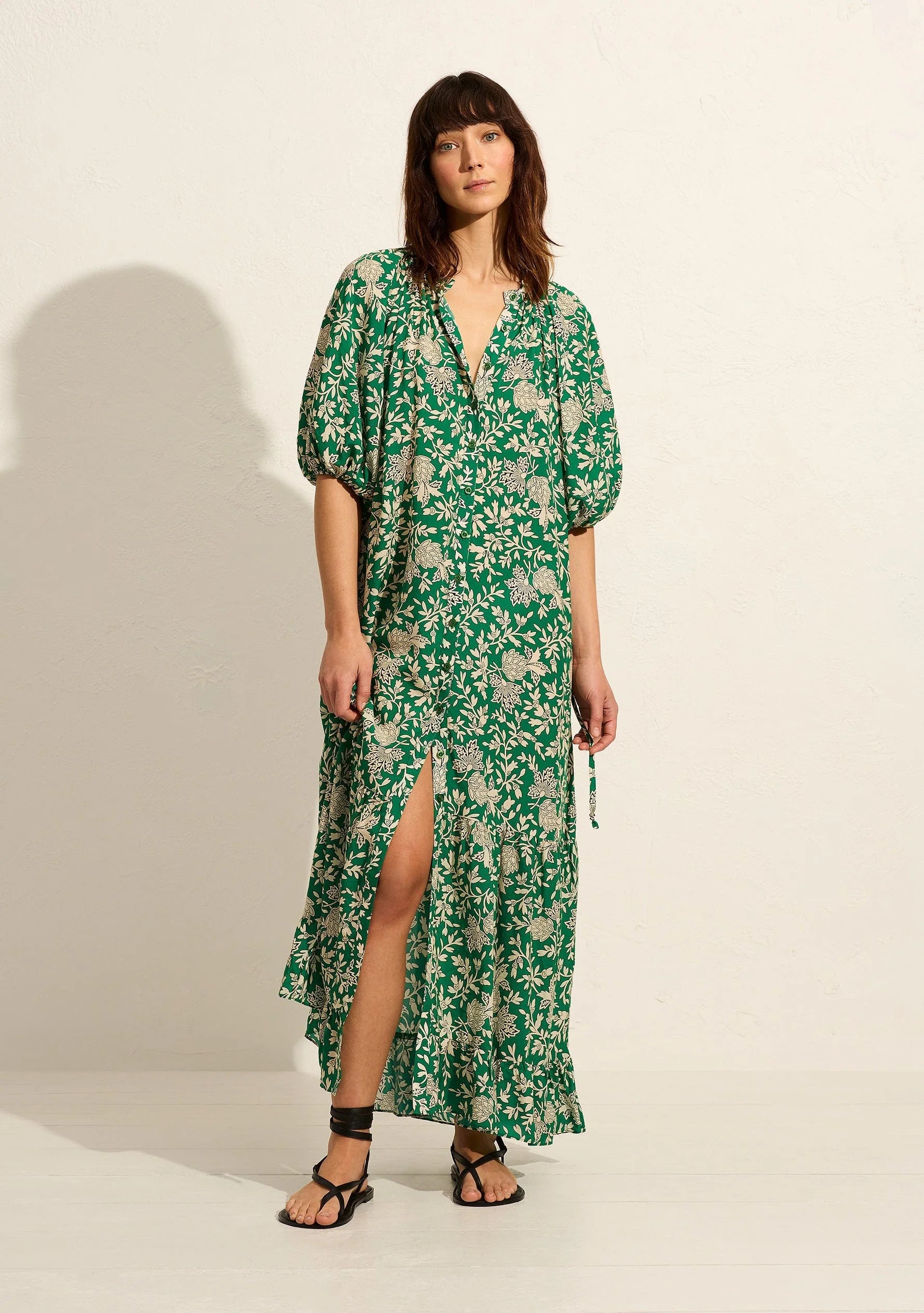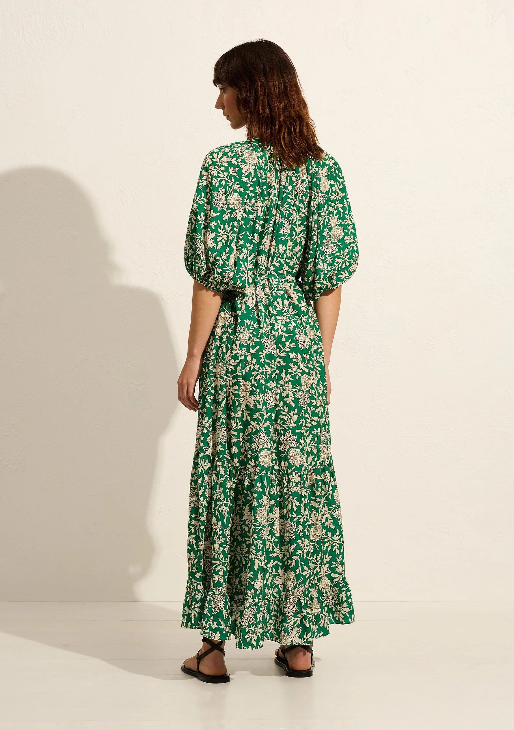 The Peyton Maxi Dress in the fresh apple green Cyrus print features a round neckline with a Mandarin collar, puff raglan sleeves, button-front closure, and a voluminous tiered silhouette. An optional waist tie adds a flattering, adjustable fit.