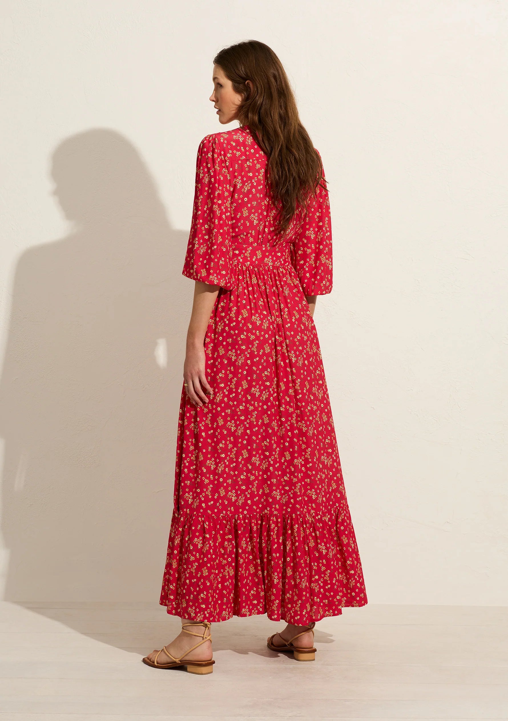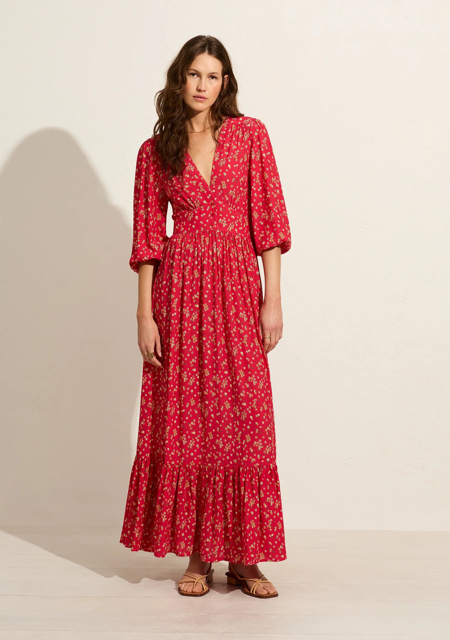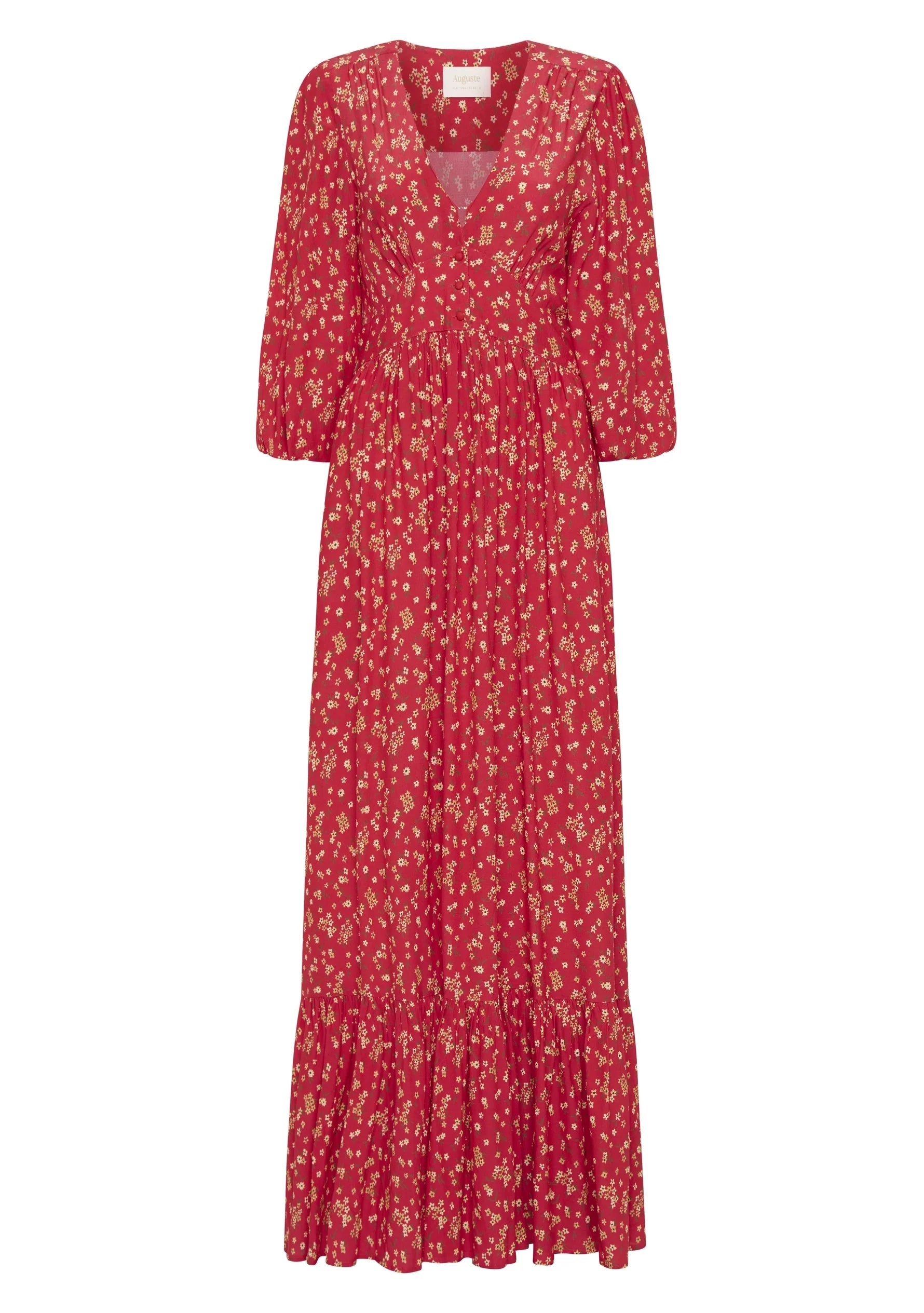The Raquel Maxi Dress in our Red Cleo Print captures quintessential Auguste charm. It boasts full-length blouson sleeves with a V neckline and button front closure, softly gathered bust and a flattering fixed waistband falling into a voluminous tiered skirt. Crafted from lightweight fabric with a silky touch and elegant drape.