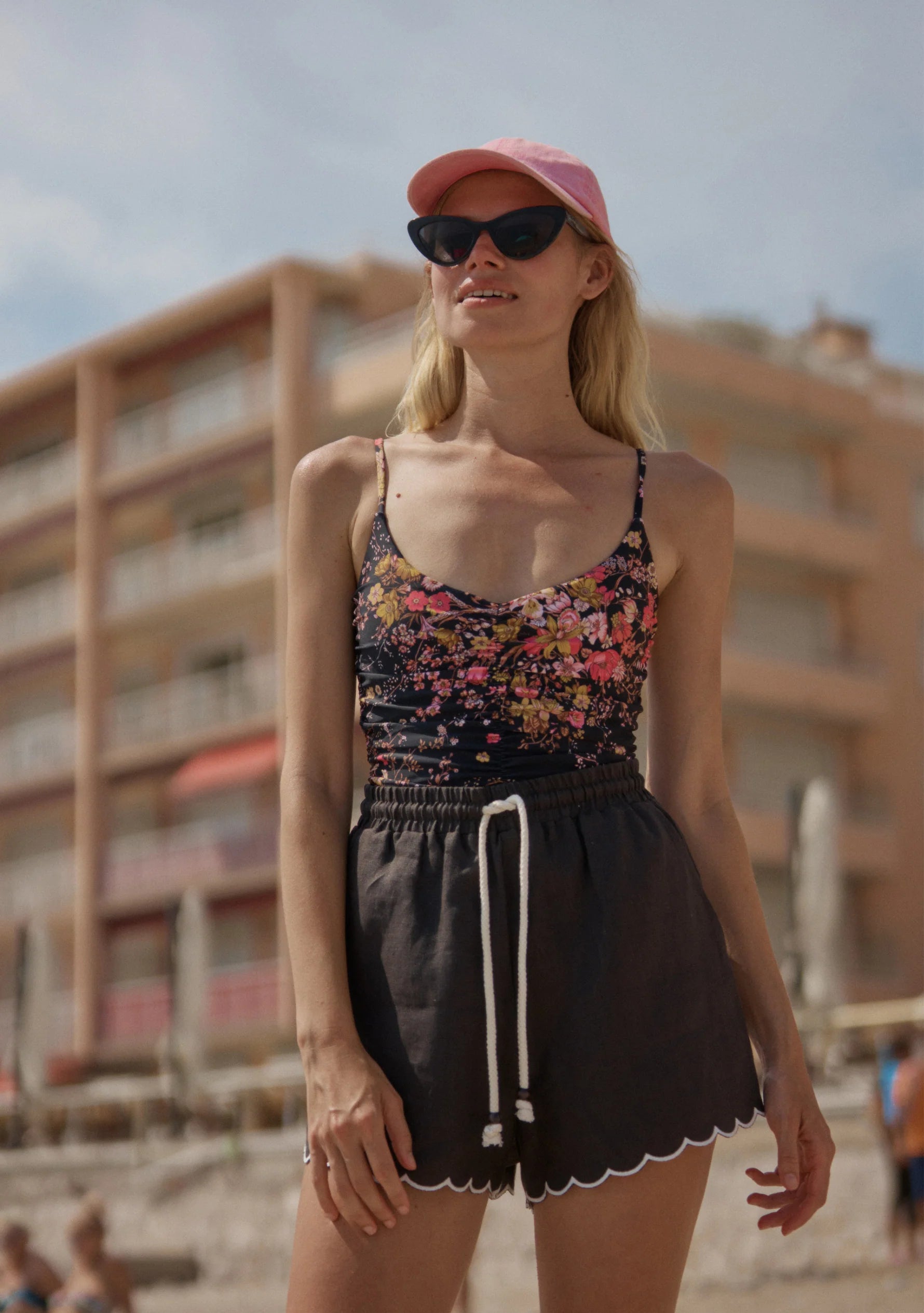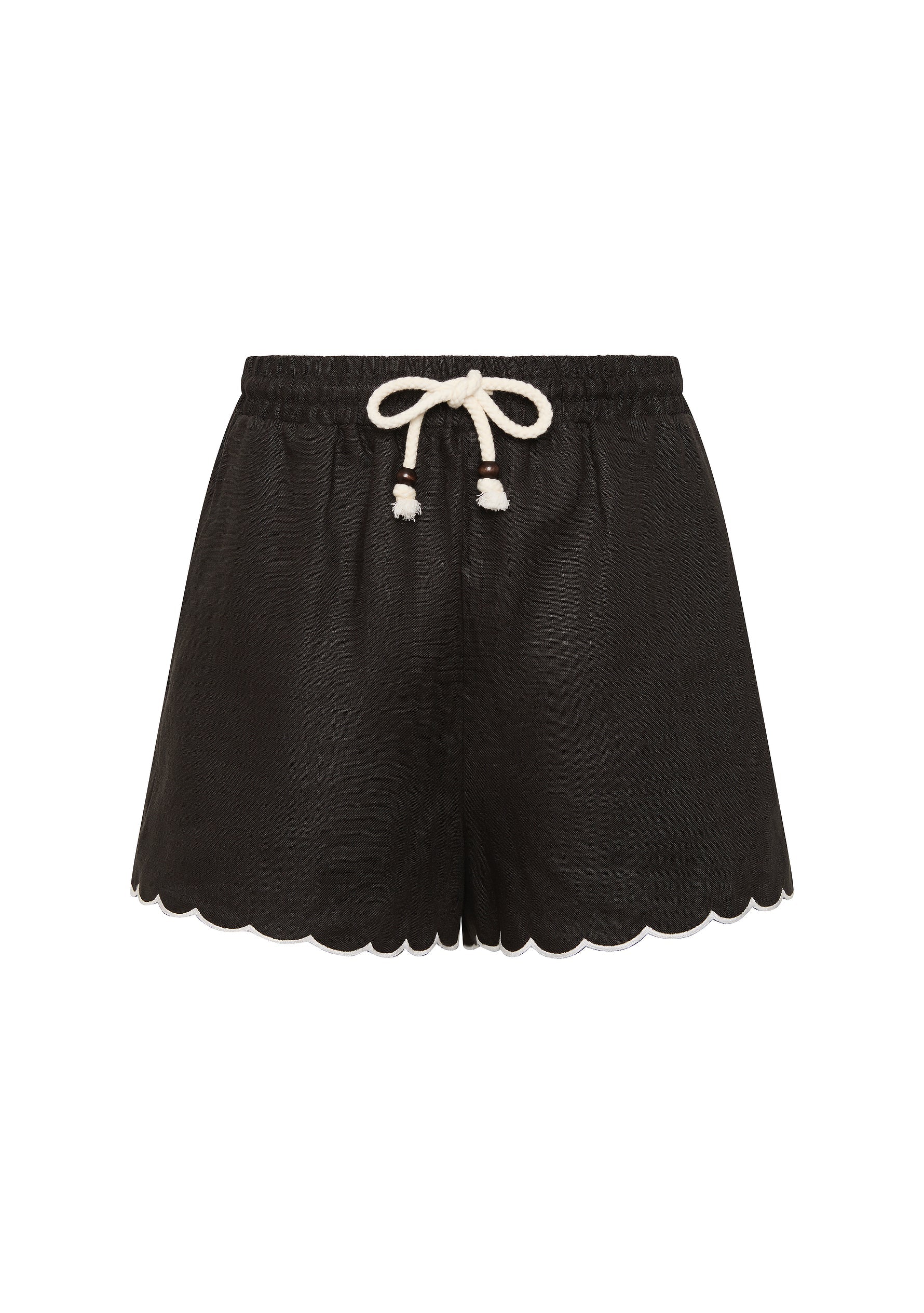 The Riley Short in classic black is a stylish summer essential, featuring an elasticated waistband with a contrasting drawcord and a scalloped hem detail. Crafted from 100% linen, these shorts are ready to hang out with you all summer long!