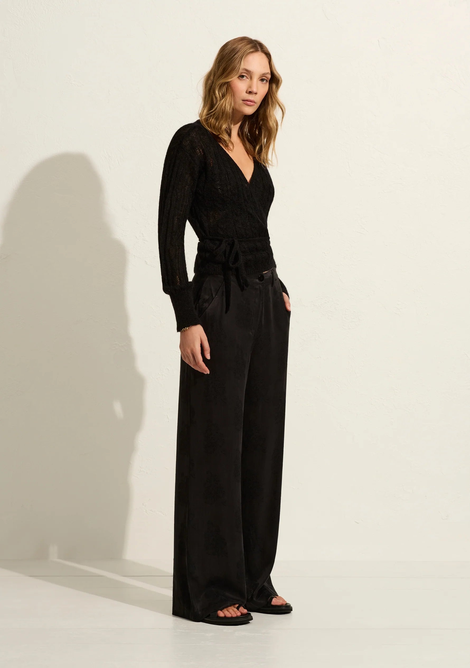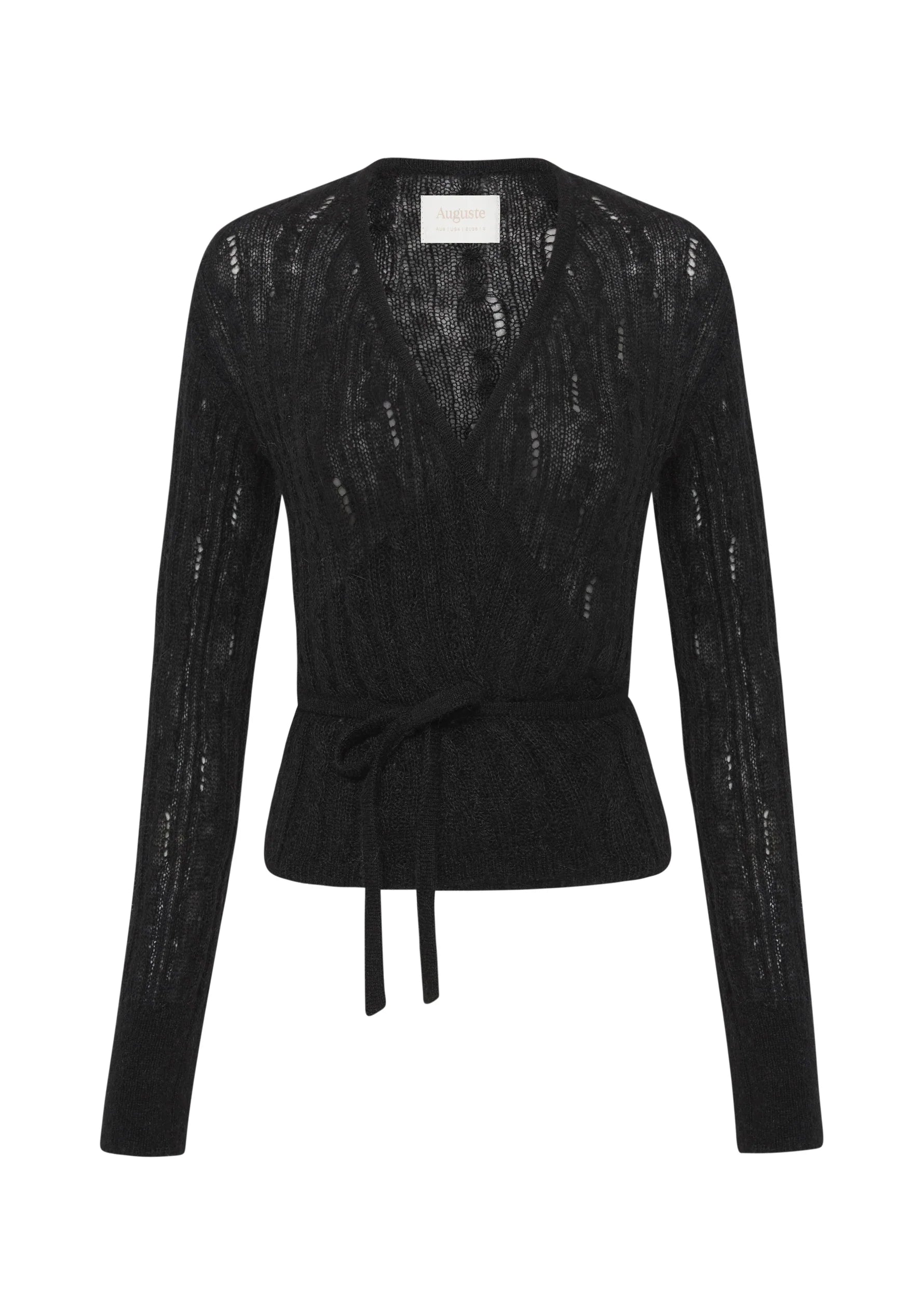 The ballerina-inspired Rowan Wrap Knit Cardigan in Classic Black features a functional wrap design with ribbed neckline, cuffs, and hem. Crafted from a soft Mohair and wool blend. Feminine knitwear for everyday elegance. An Auguste bestseller, available exclusively online and in-store.