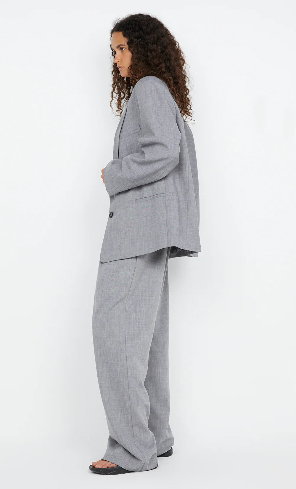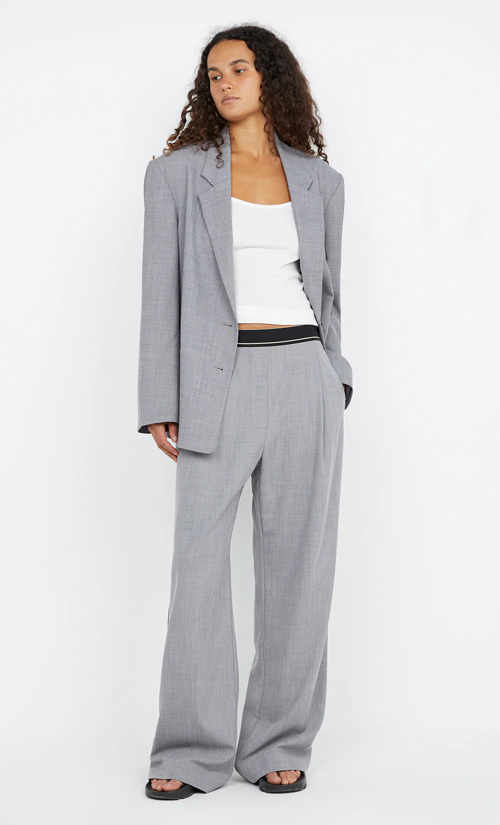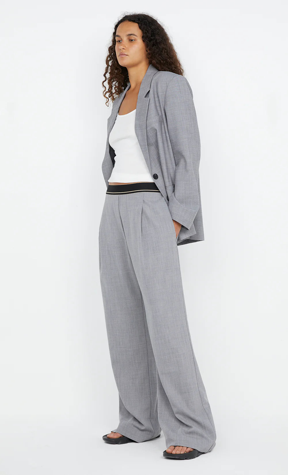 The BEC + BRIDGE Jordin Pant in Charcoal Weave offers a chic, relaxed silhouette with a wide leg cut from salt-and-pepper suiting fabric. Designed to sit at the mid to low waist, it features a striped elastic waistband, faux fly front, and front pleats for a polished look. With soft gathering at the back waistband and in-seam side pockets, these pull-on pants are finished with a clean blind hem, making them ideal for stylish comfort. Pair with BEC + BRIDGE Jordin Blazer for a elevated look that transitions seamlessly from day to night.