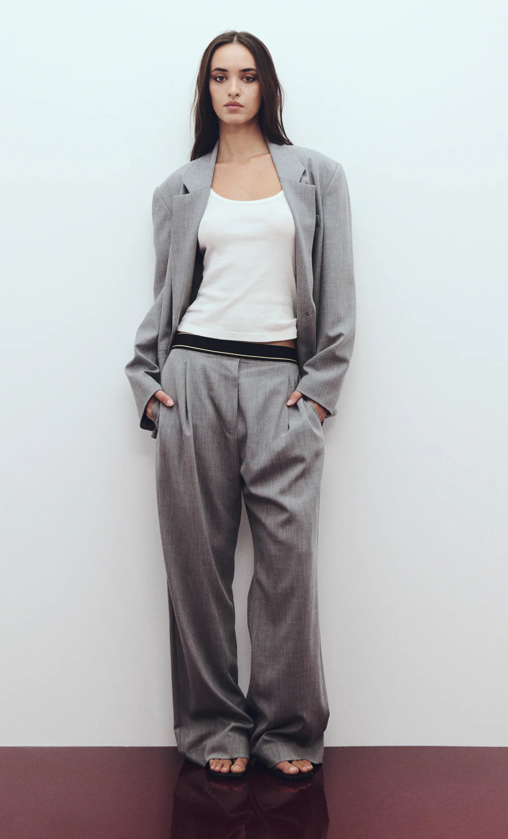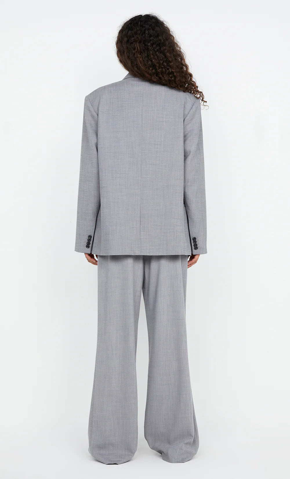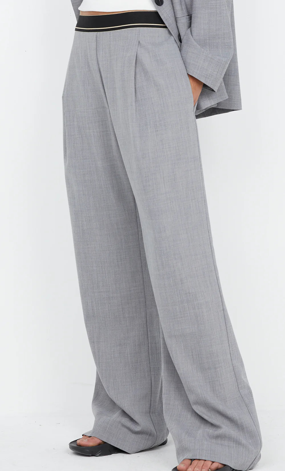 The BEC + BRIDGE Jordin Pant in Charcoal Weave offers a chic, relaxed silhouette with a wide leg cut from salt-and-pepper suiting fabric. Designed to sit at the mid to low waist, it features a striped elastic waistband, faux fly front, and front pleats for a polished look. With soft gathering at the back waistband and in-seam side pockets, these pull-on pants are finished with a clean blind hem, making them ideal for stylish comfort. Pair with BEC + BRIDGE Jordin Blazer for a elevated look that transitions seamlessly from day to night.