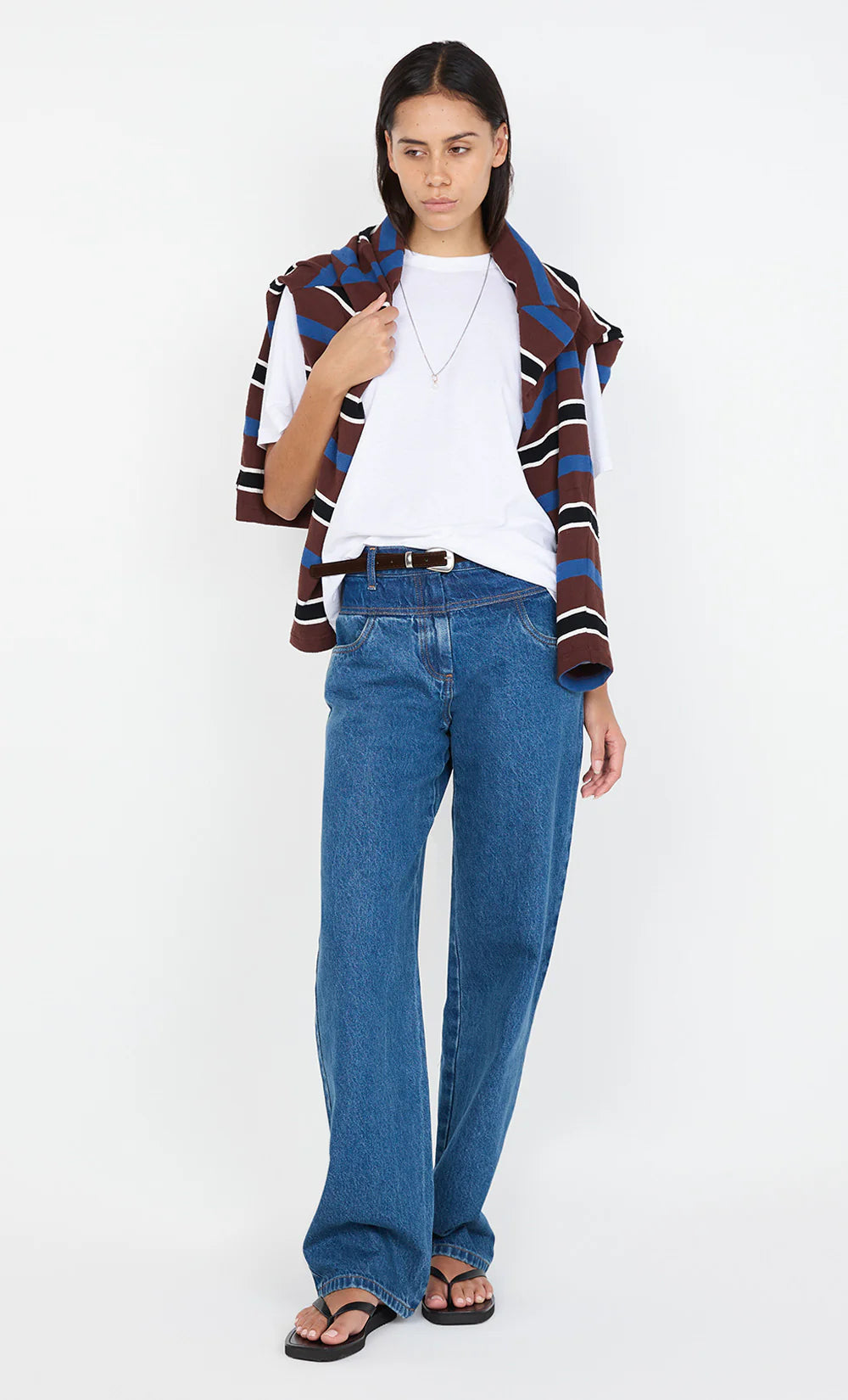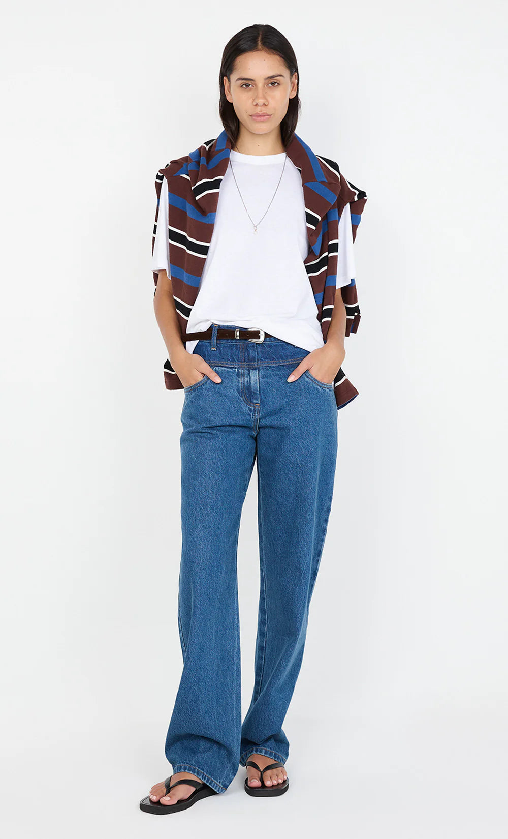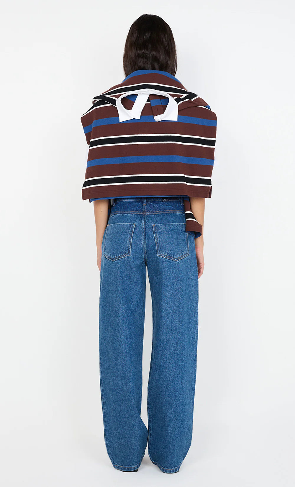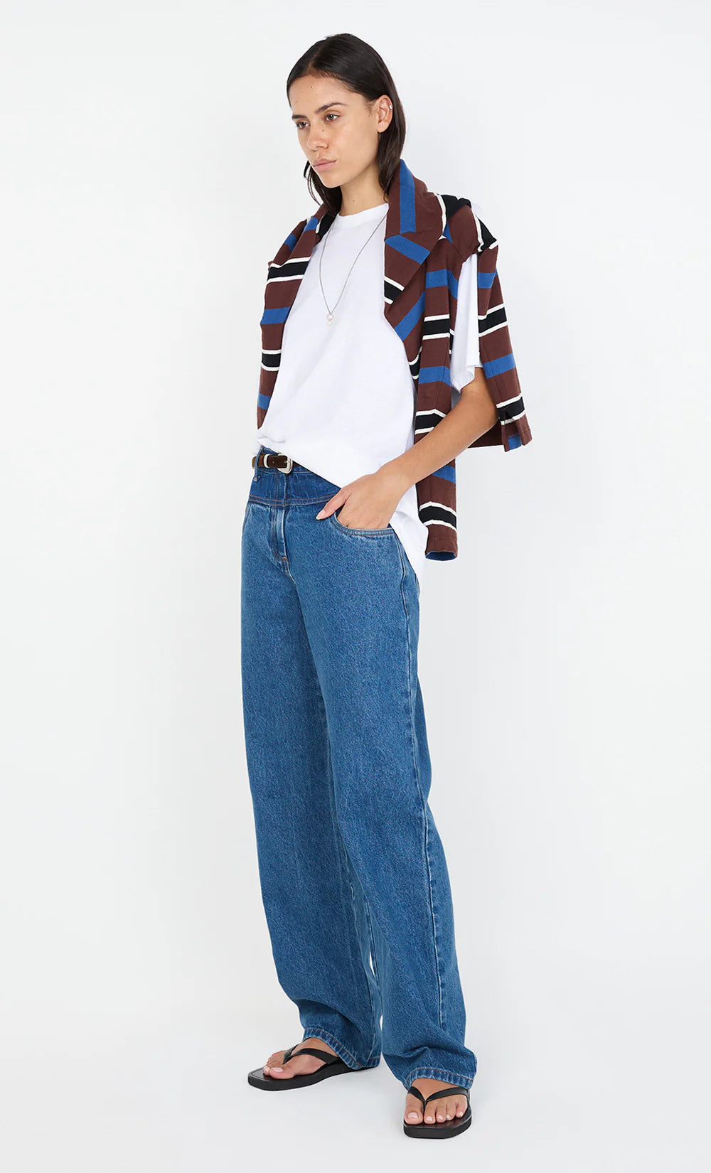 The BEC + BRIDGE Lucian Contrast Jean in Indigo Washed Denim is crafted from a blend of cotton and recycled cotton for a sustainable yet stylish fit. Designed to sit at the mid to high waist, these jeans feature a contrast dark indigo yoke and a straight-leg silhouette for a flattering, classic look. They are accessed via a fly front zipper with a custom BB denim tack and include front pockets, back patch pockets, and a custom BB patch at the back waistband.