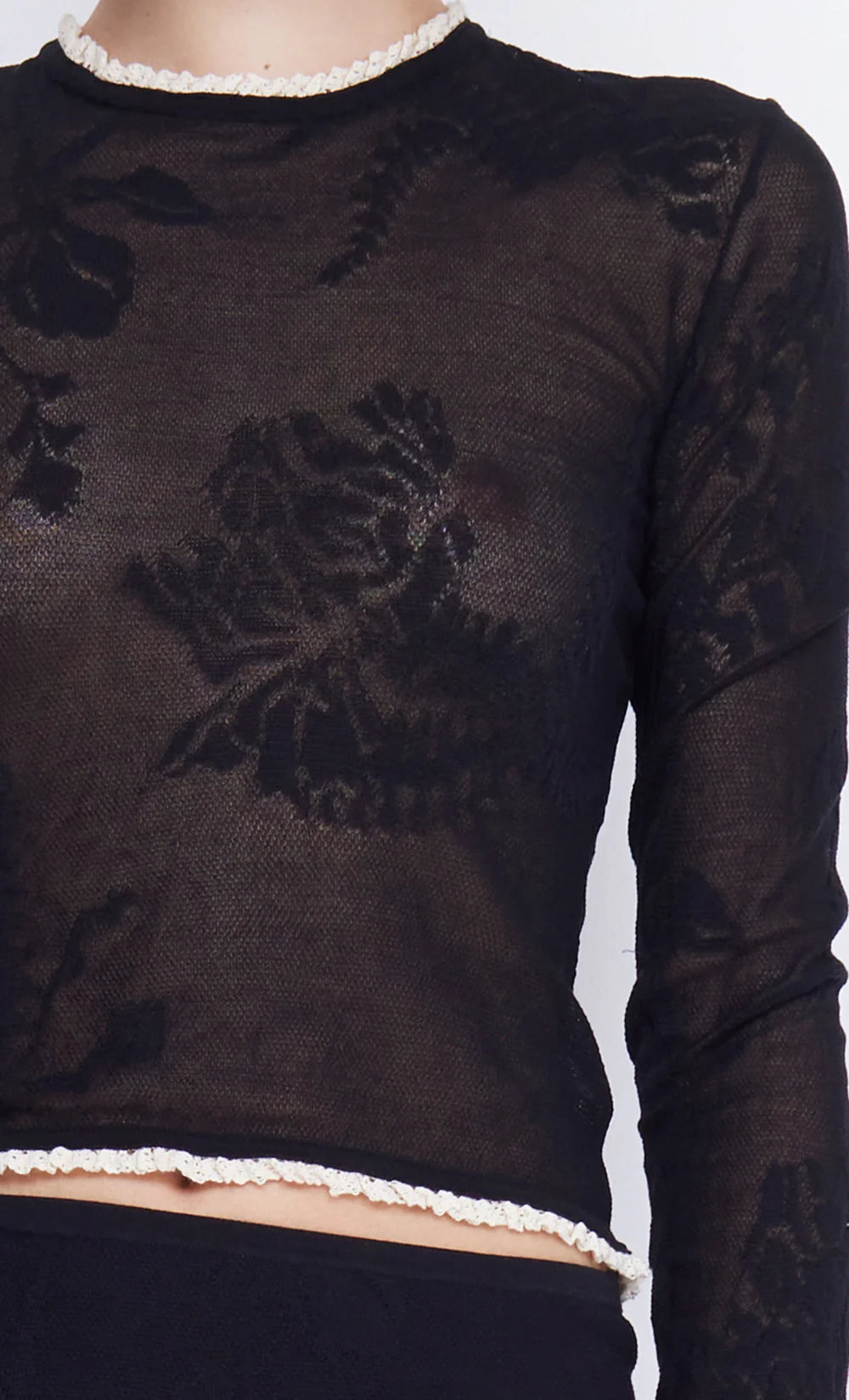 The BEC + BRIDGE Naelle Crew Neck Knit Top is crafted from a semi-sheer knit fabirc in a French lingerie style.The long sleeve top features a crew neck in a slightly cropped silhouette. Edges are Finished with contrast ivory trim. Styled with our BEC + BRIDGE Naelle Knit Mini Skirt.