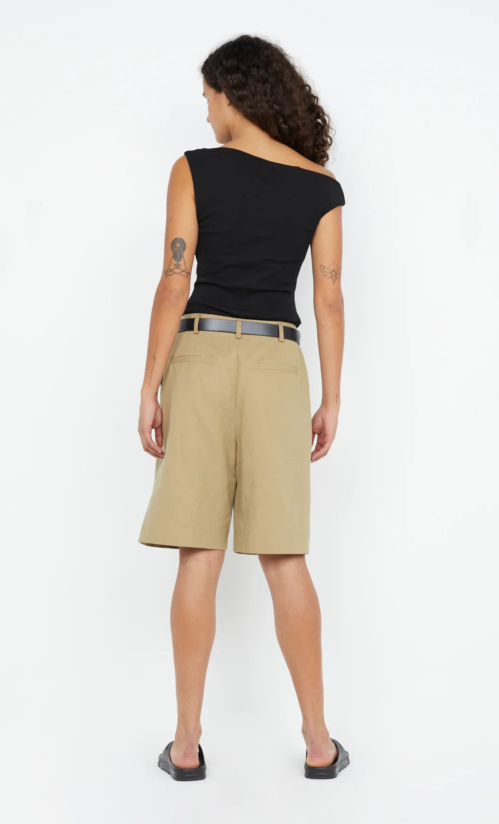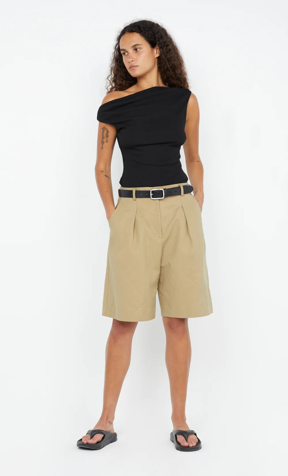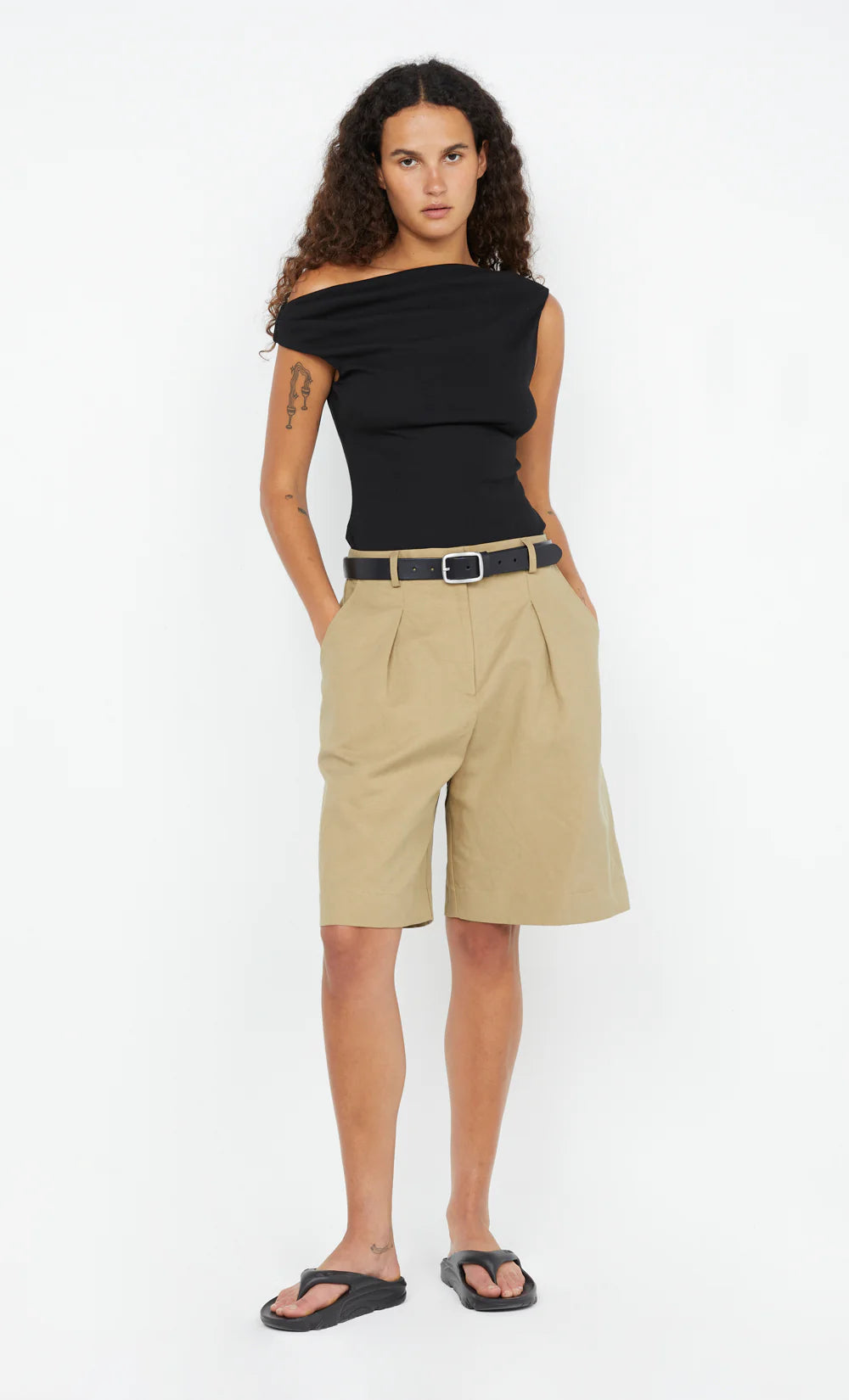 The BEC + BRIDGE Siera Asym Top in Black is a fitted, asymmetrical top crafted from organic cotton rib. Featuring a unique tuck detail at the shoulder seams, this top offers a comfortable and flattering fit with some stretch. It’s designed for a sleek silhouette and is finished with a twin-needle turned-back hem. Pair with BEC + BRIDGE Renzo Short for an elevated everyday look or a chic look.