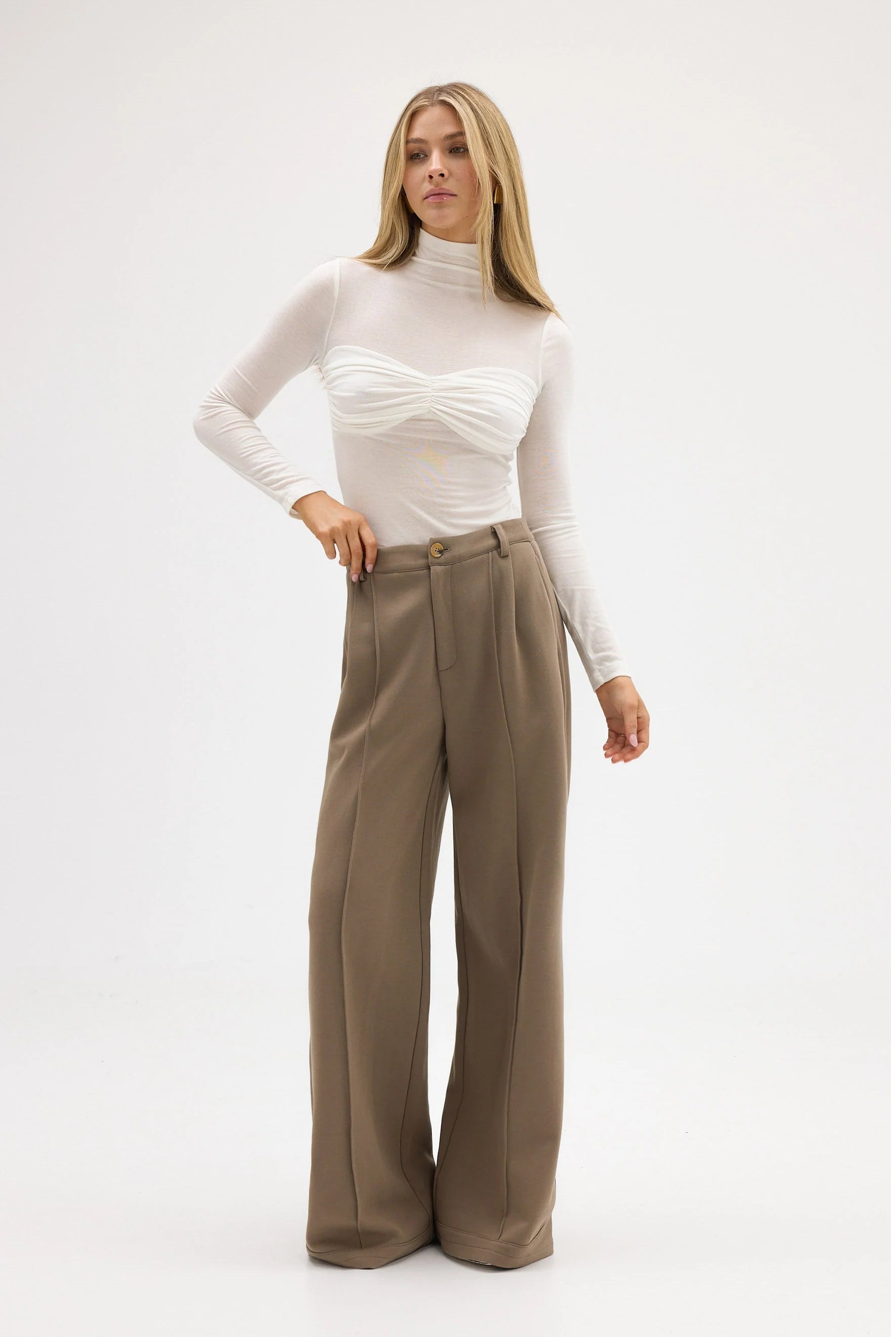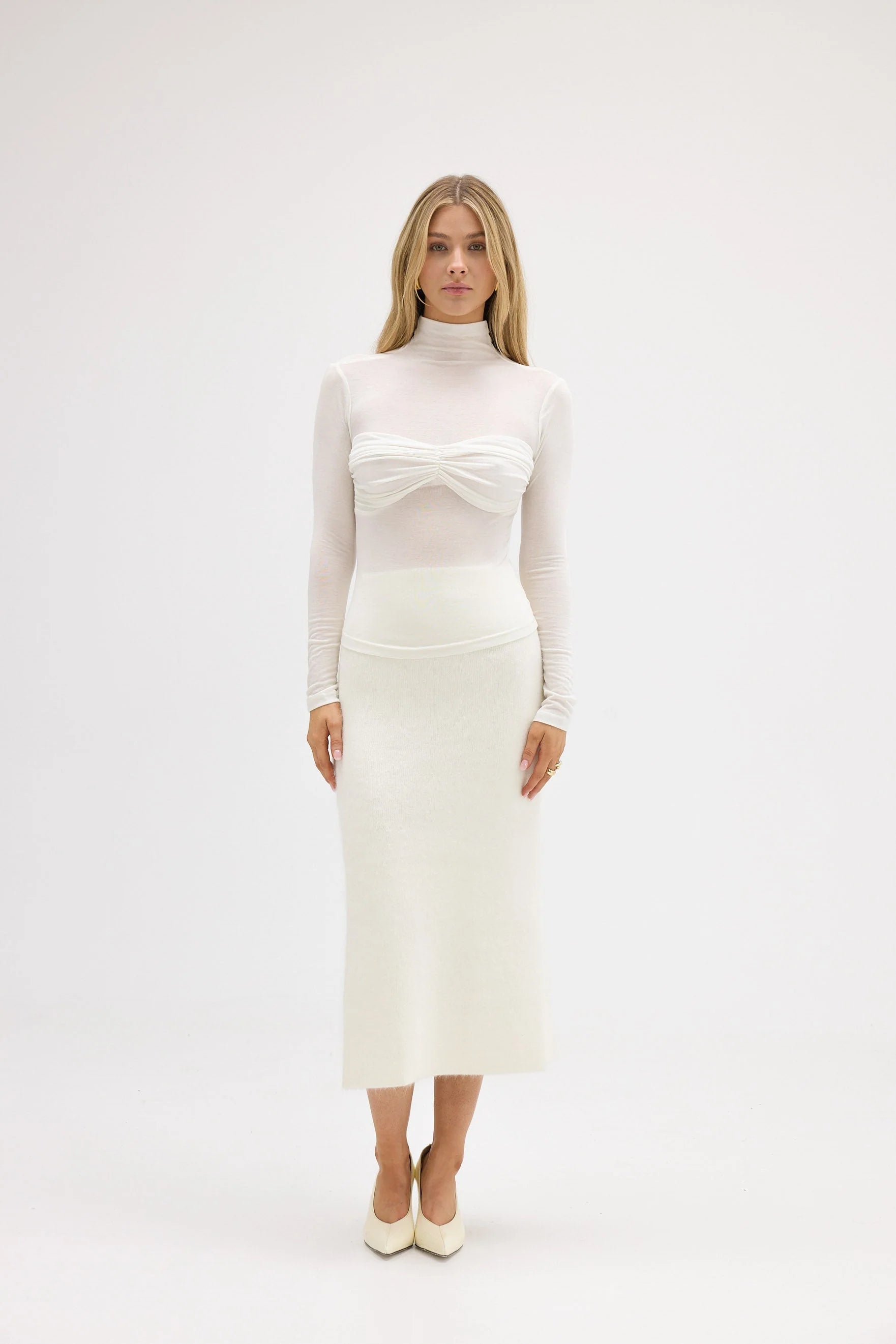 Meet the Eva Top in Ivory—a sheer, sculptural dream. Made from a luxurious wool blend, this easy-wearing top is soft, stretchy and designed to move with you. Featuring a high neckline and semi-sheer body with covered ruched bust detail, she's perfect for layering or making a statement all on her own.