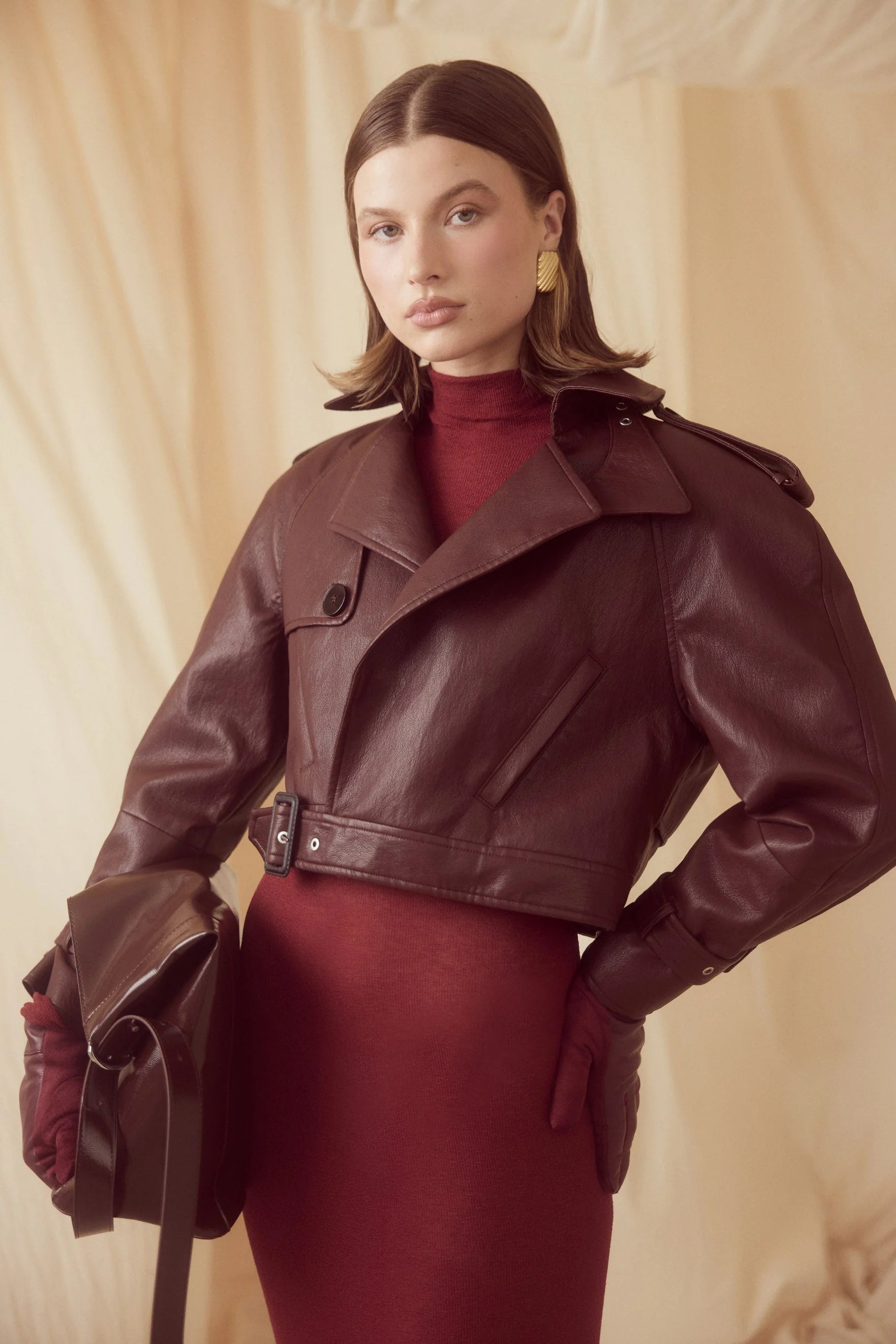 The Kara Jacket is an elevated take on a classic silhouette in a bold Cherry hue. Crafted from a premium faux fabrication, the Kara Jacket takes inspiration from classic trench details reimagined in a biker style jacket. Featuring a cropped length, side pockets and attached belt closure, she effortlessly pairs with the Alma Wool Skirt or the Kate Fringe Wrap Skirt.