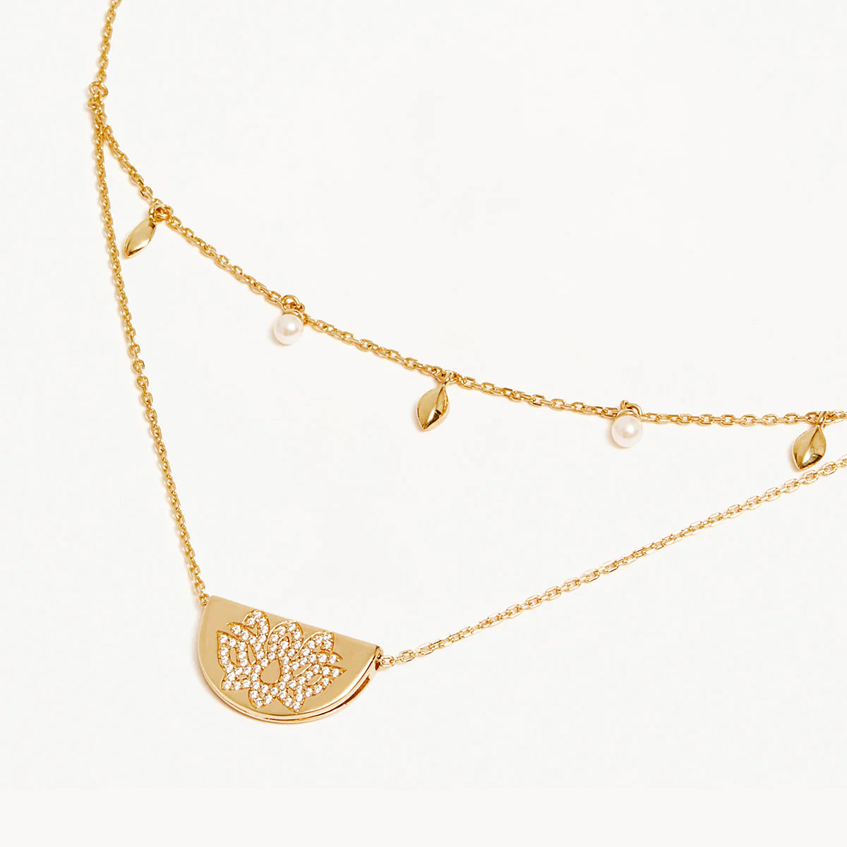 Our Live in Peace Lotus Necklace pays tribute to the transformative power of hope and optimism. The lotus symbolises the peace of simply being; it floats above the waters in calm and storm alike, unaffected by what transpires beneath the surface. This keepsake features a reimagining of our iconic Lotus Necklace on our signature fine chain, layered with a second chain for effortless necklace stacking.