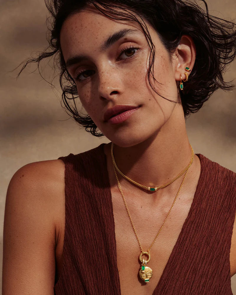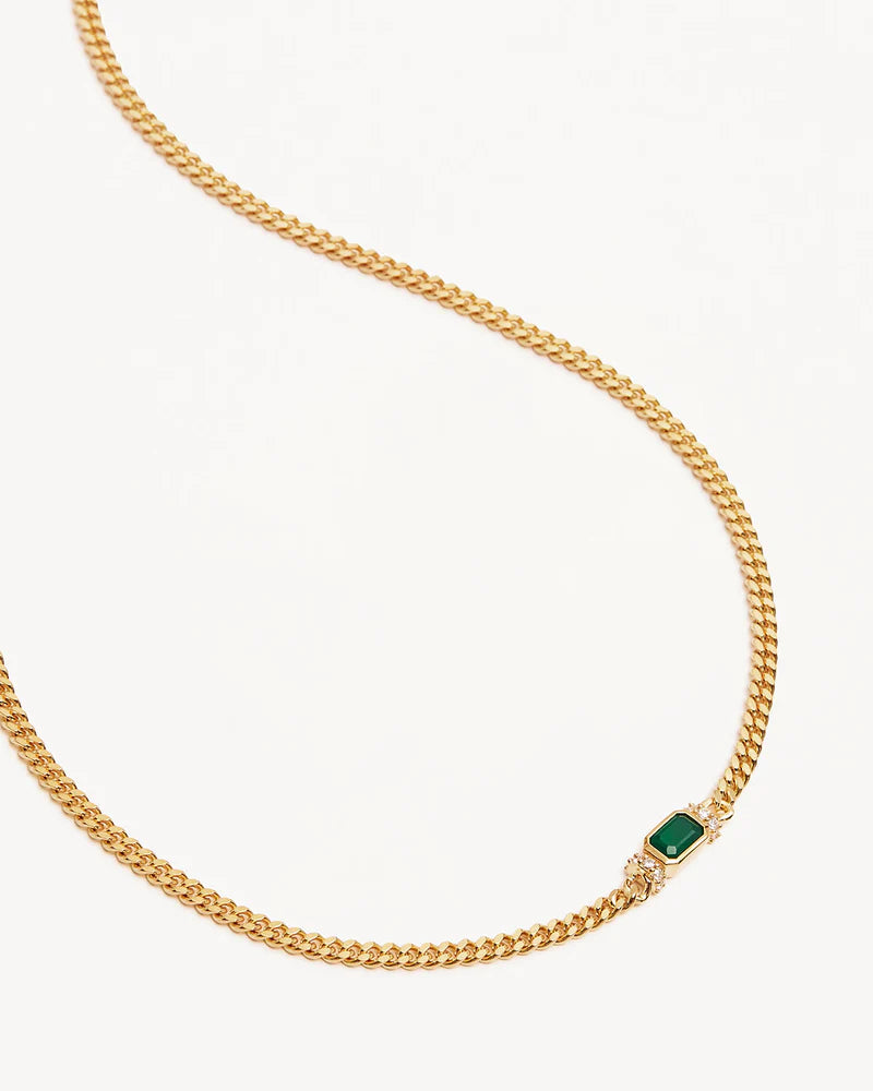 Be reminded of your inner power with our Strength Within Green Onyx Curb Choker. A bezel set natural green onyx is framed by two pave cubic zirconias, symbolic of the patience and purpose you hold on your journey. Crafted with a bold curb chain, this choker can be styled as a statement piece in your stack.