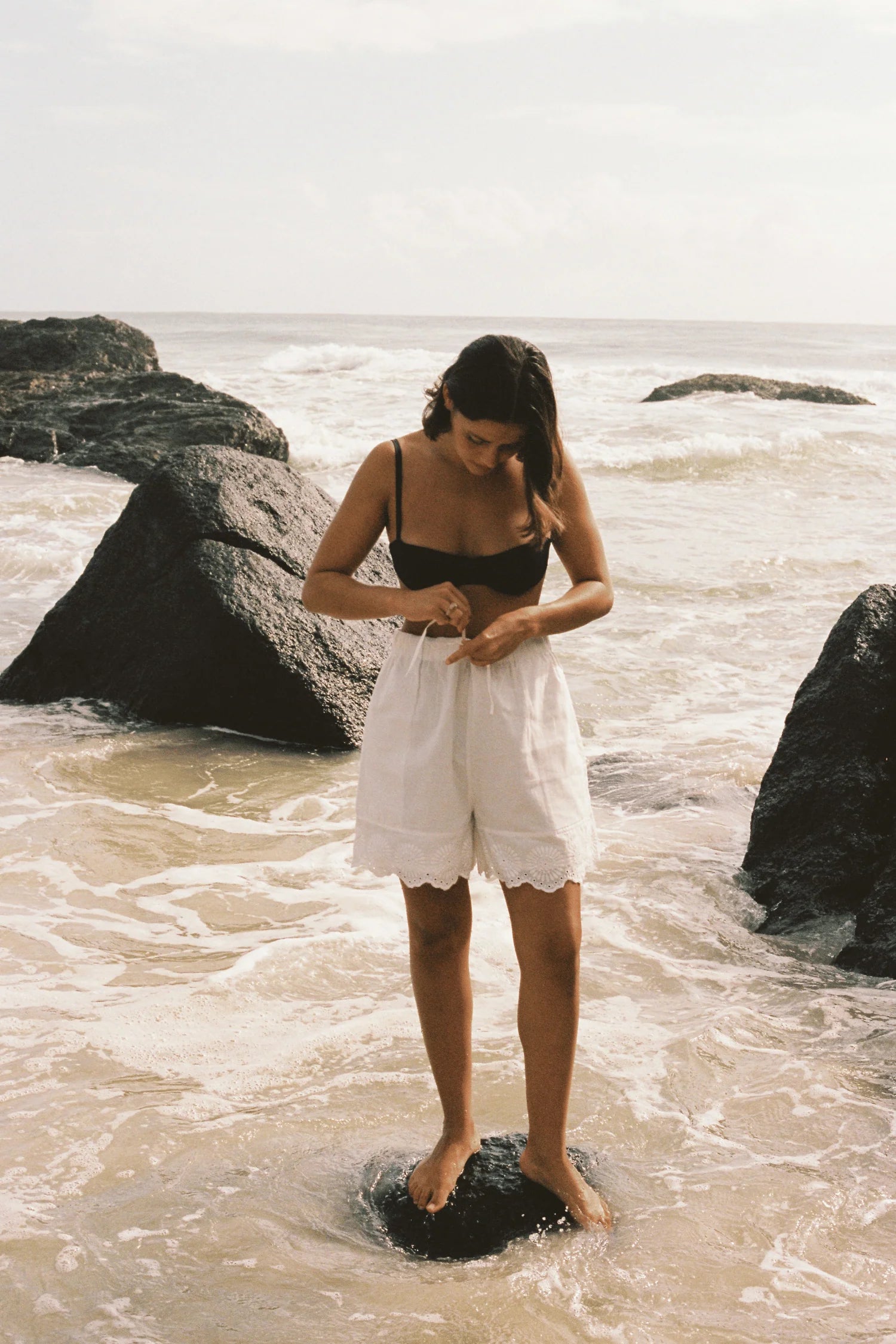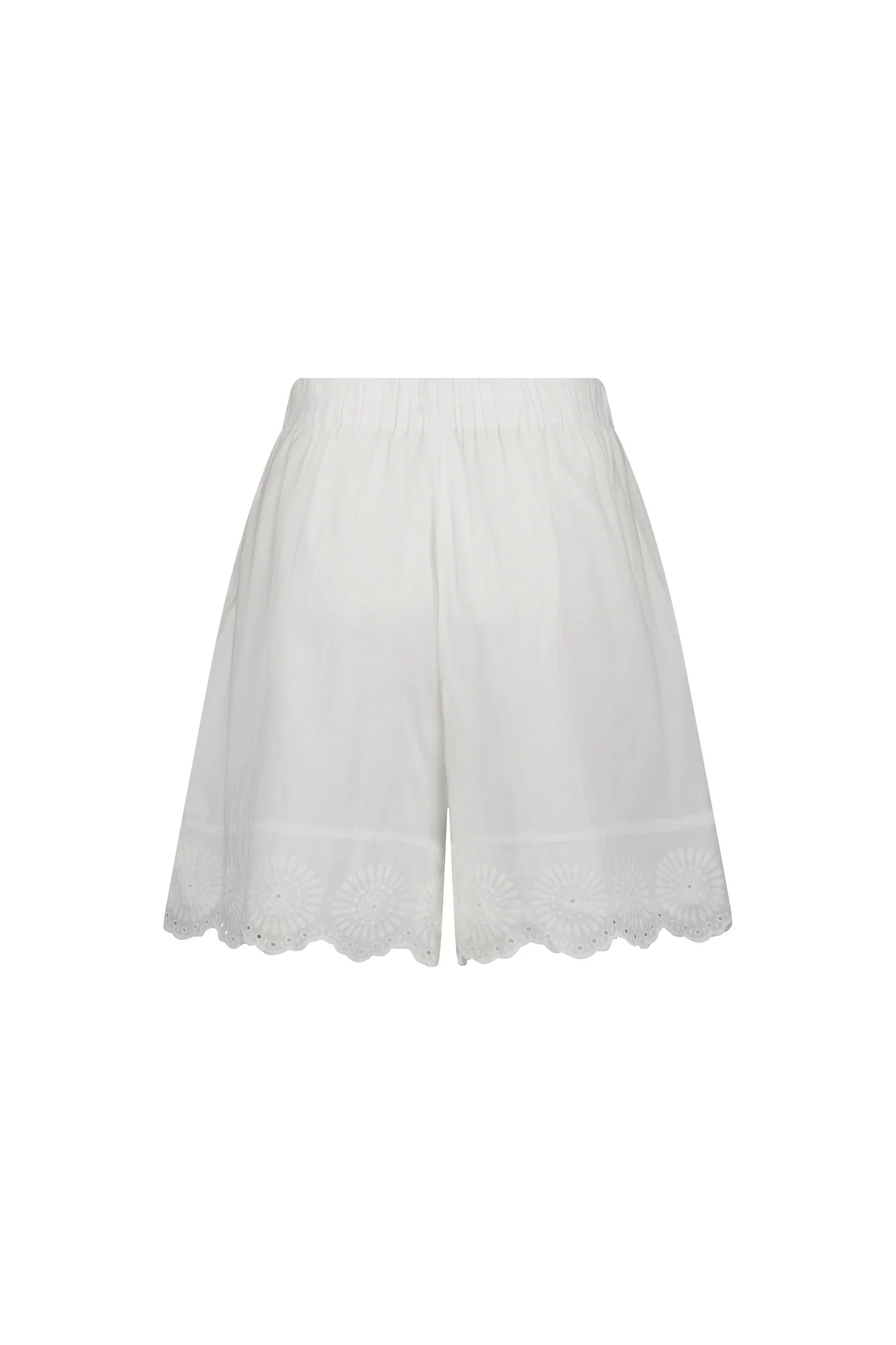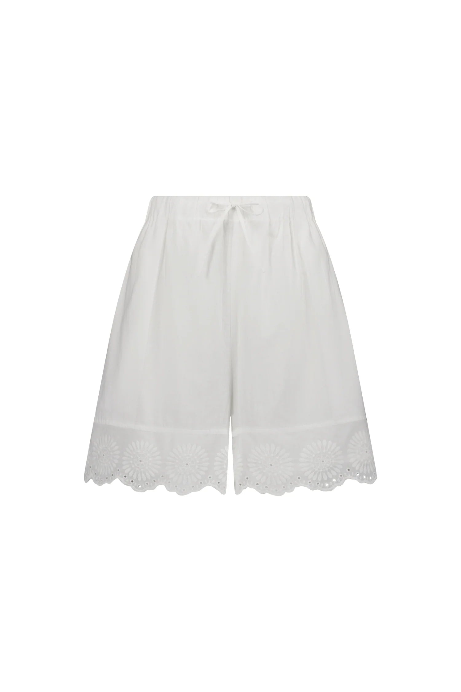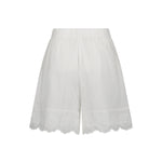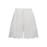 Crisp cotton poplin with a scalloped broderie hem and mid-thigh length. A relaxed drawstring waist makes these the perfect throw-on for long mornings or warm evenings.