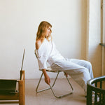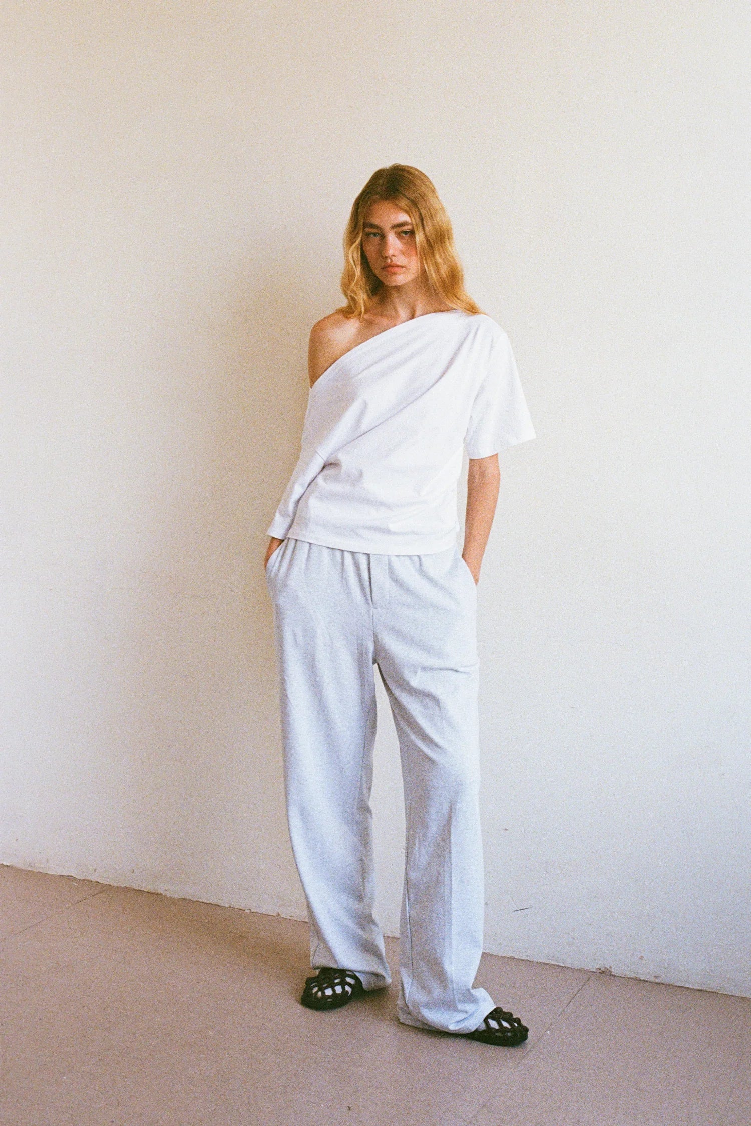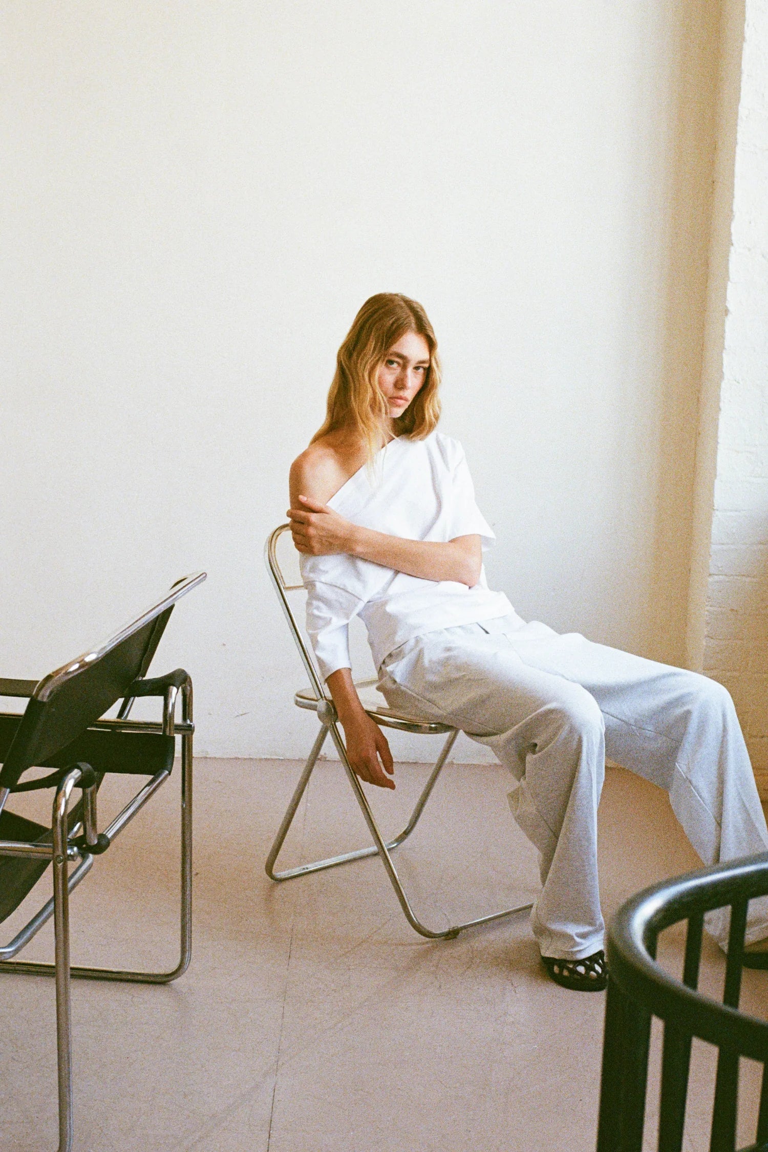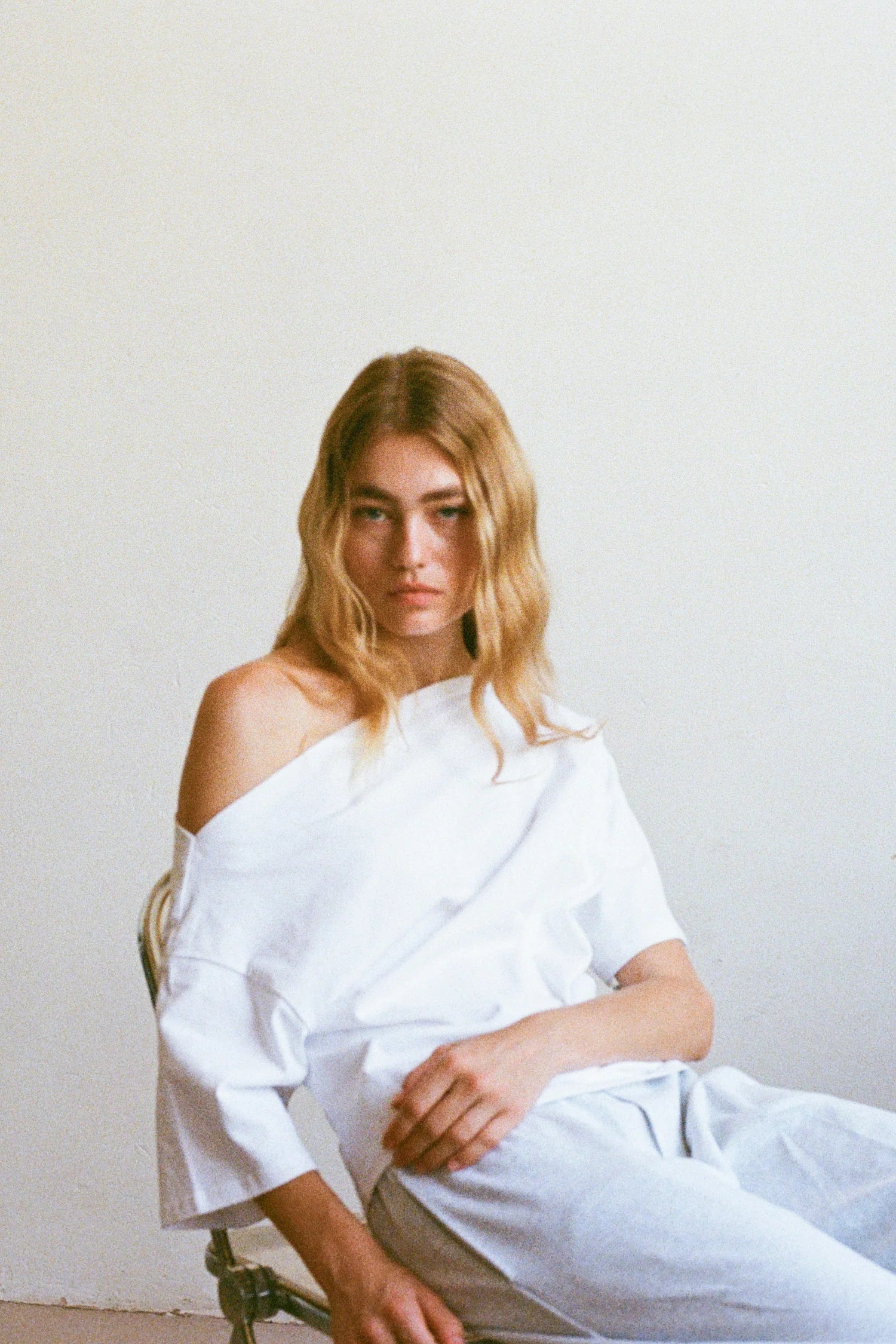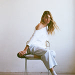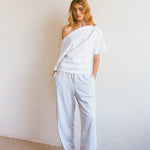 A softly draped organic cotton top with an asymmetric neckline and ruched side detailing. Designed to bring subtle interest to simple styling. Model wears size Medium
