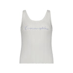 A soft pointelle knit tank with subtle texture and a refined scoop neckline. Finished with our cursive logo in washed periwinkle for a touch of nostalgia. 100% cotton.