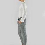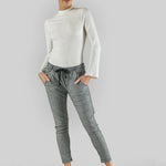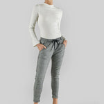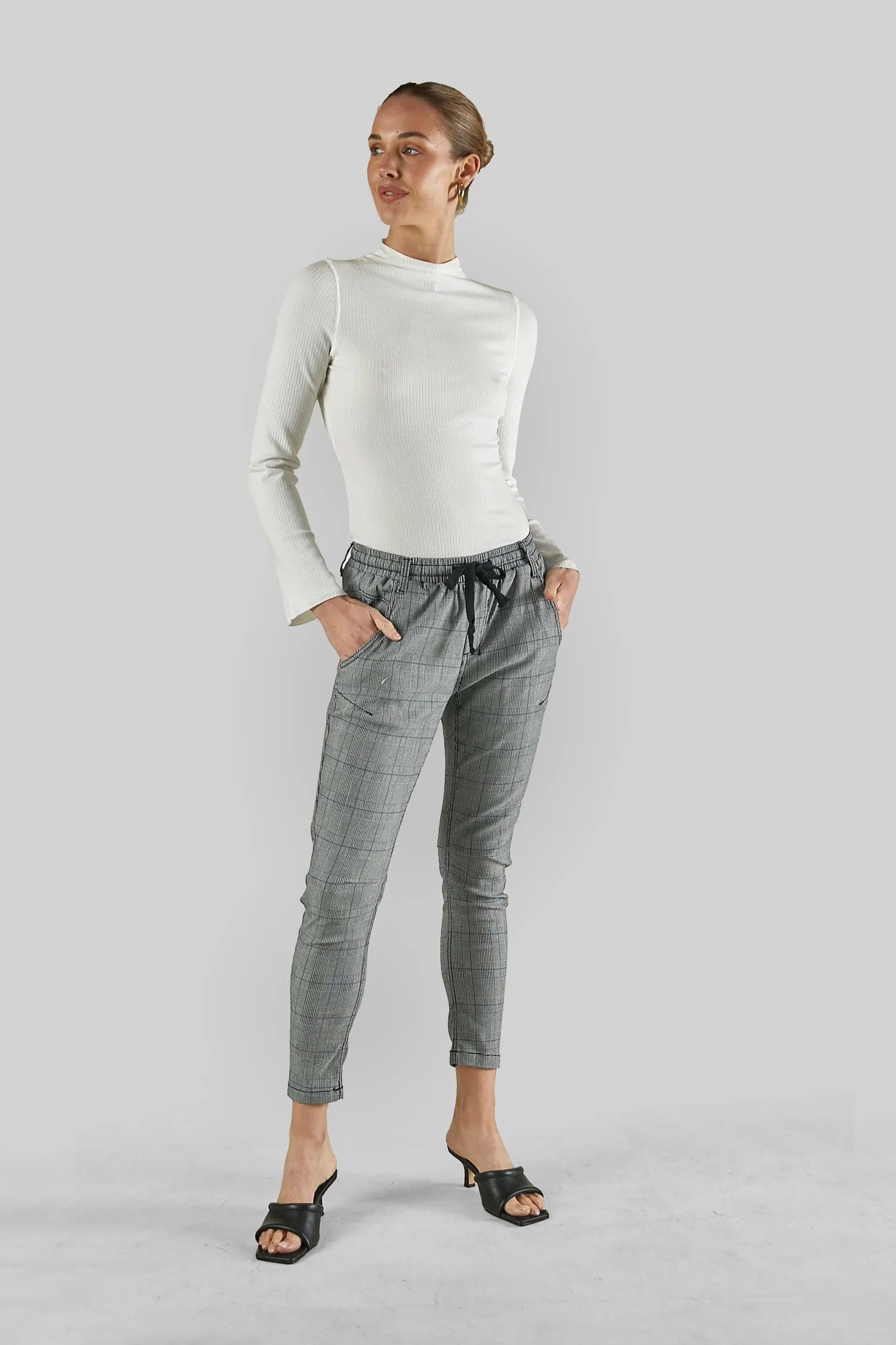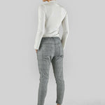 A mid-rise and cropped length in a Cobalt Blue Check print, complete with an elasticated waistband and sportive drawstring. These stretch jeans have a flattering arch shape leg which sits at the hip for a relaxed look.
