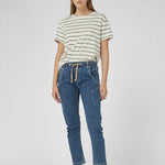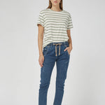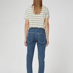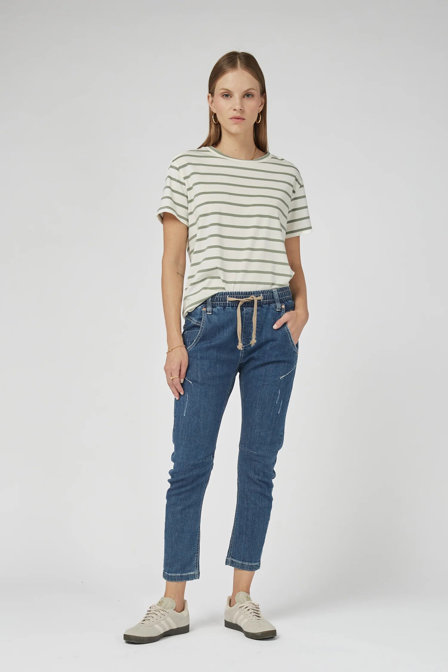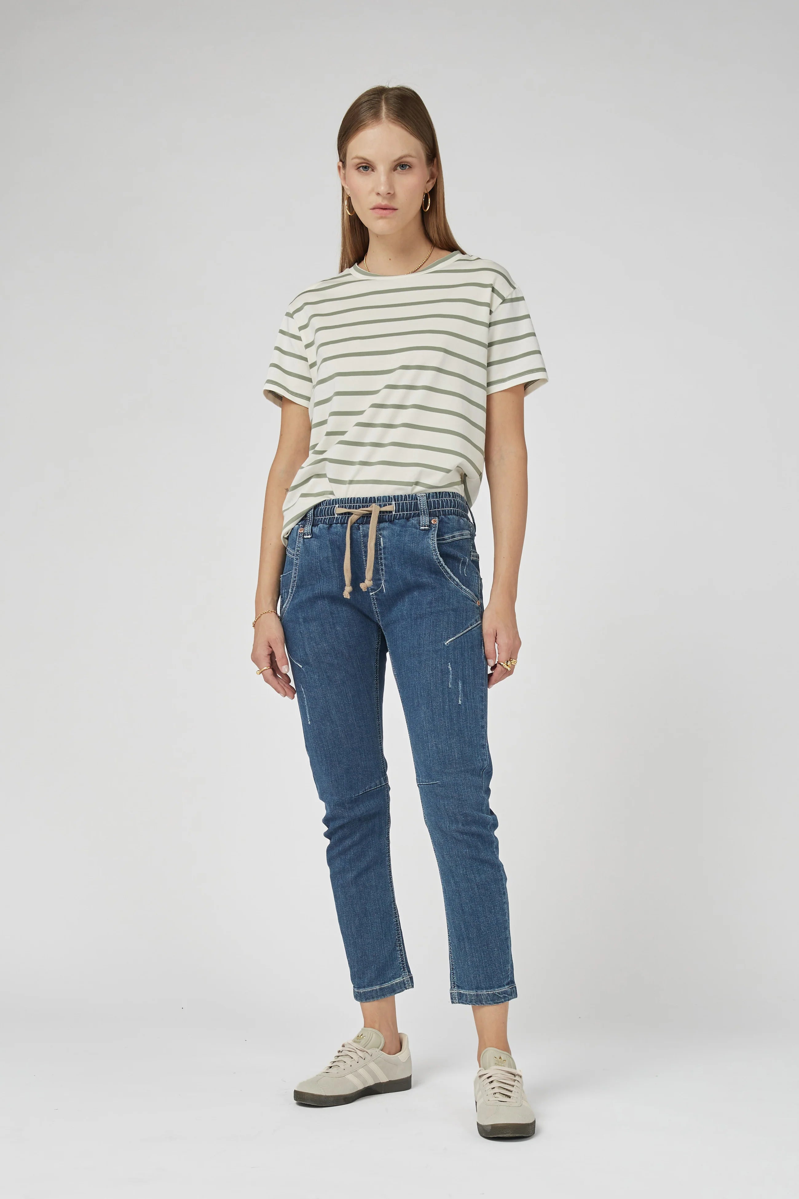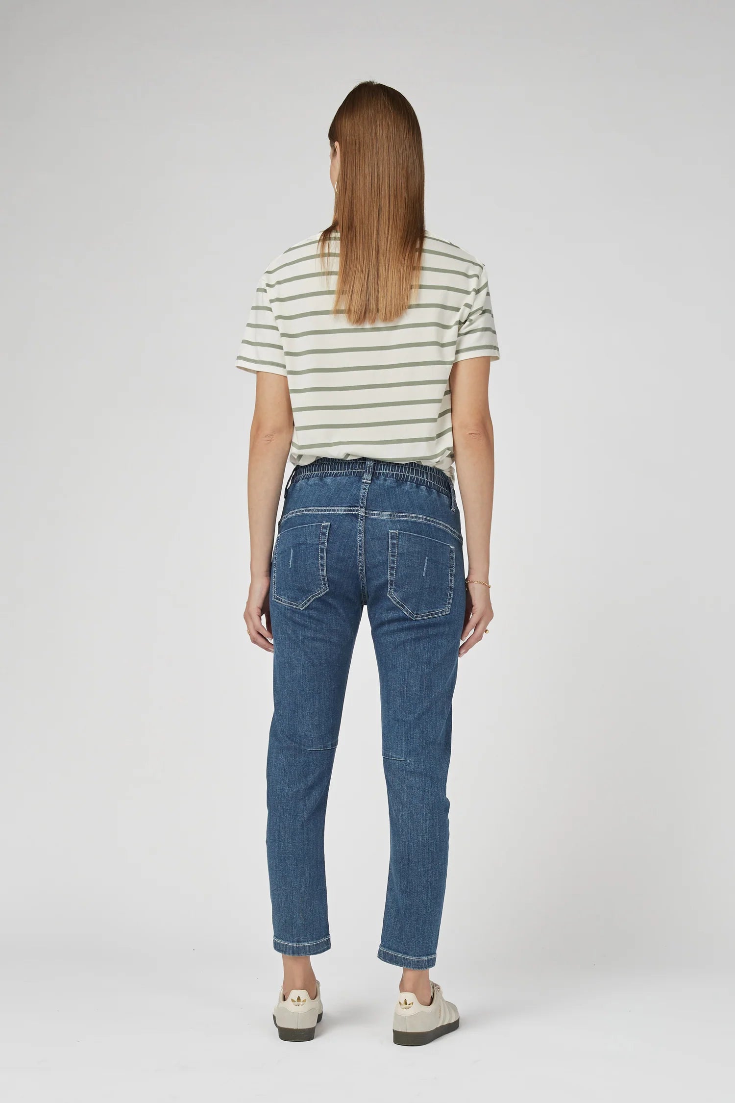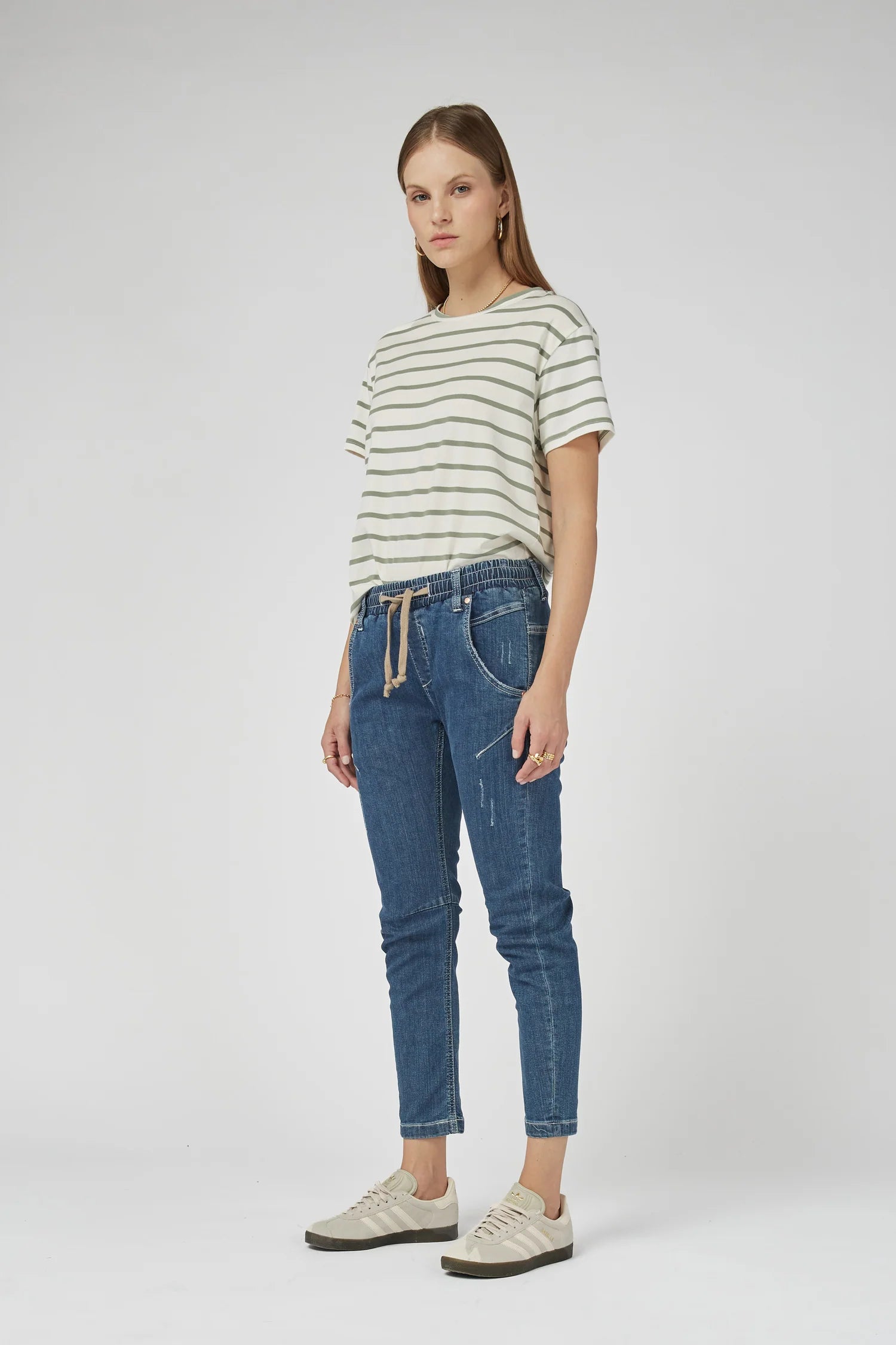 A mid-rise and cropped length in Dark Indigo Wash complete with an elasticated waistband and sportive drawstring. These stretch denim jeans have a flattering arch shape leg which sits at the hip for a relaxed look.