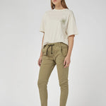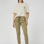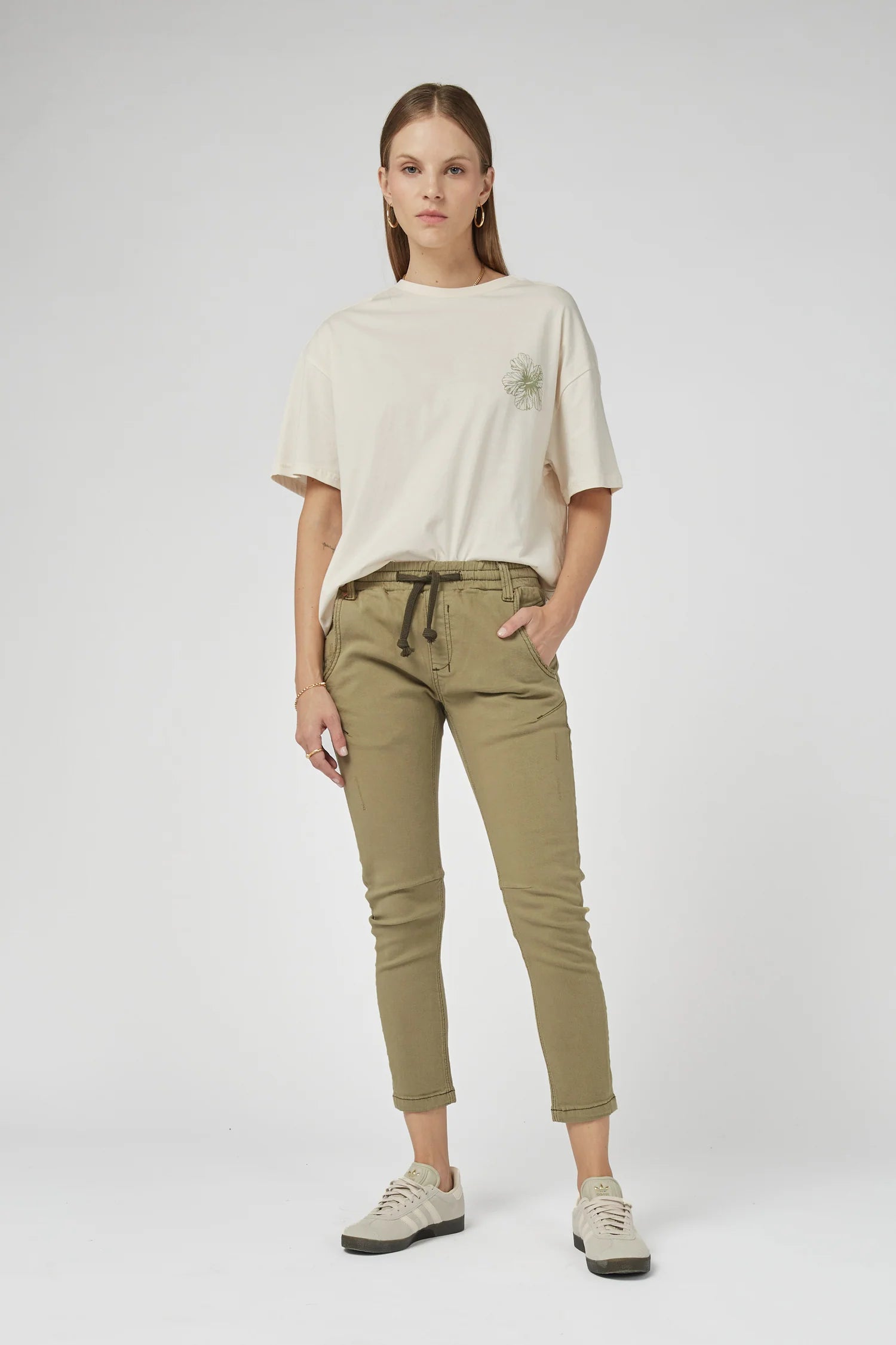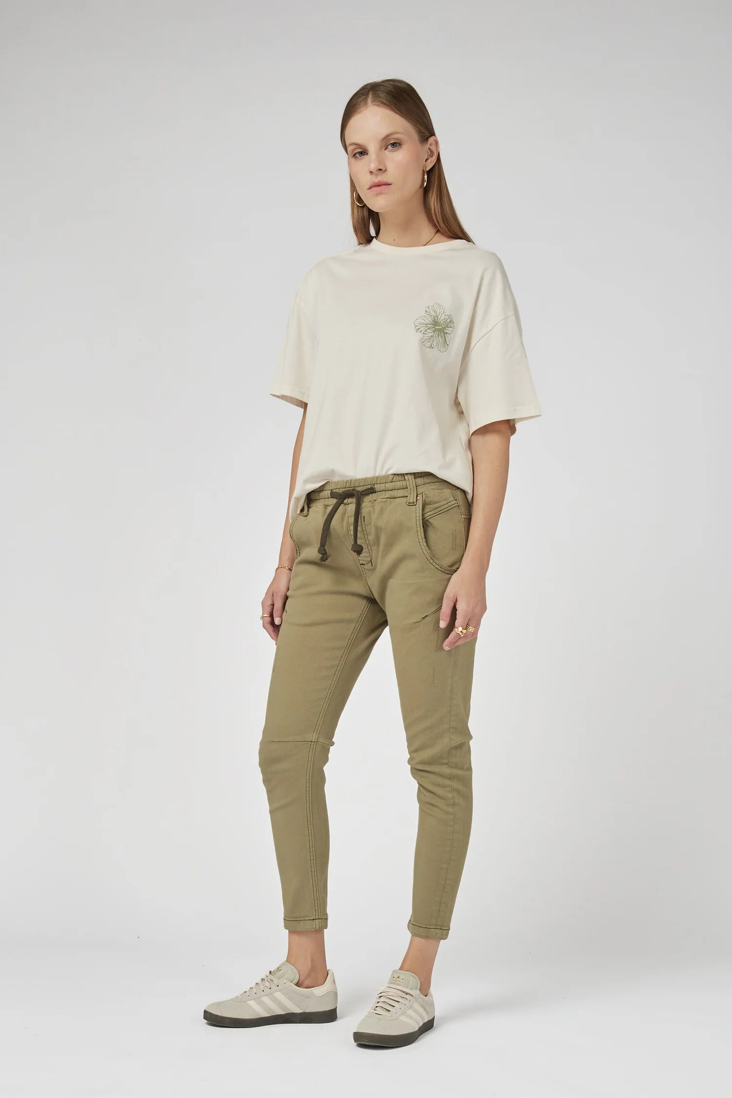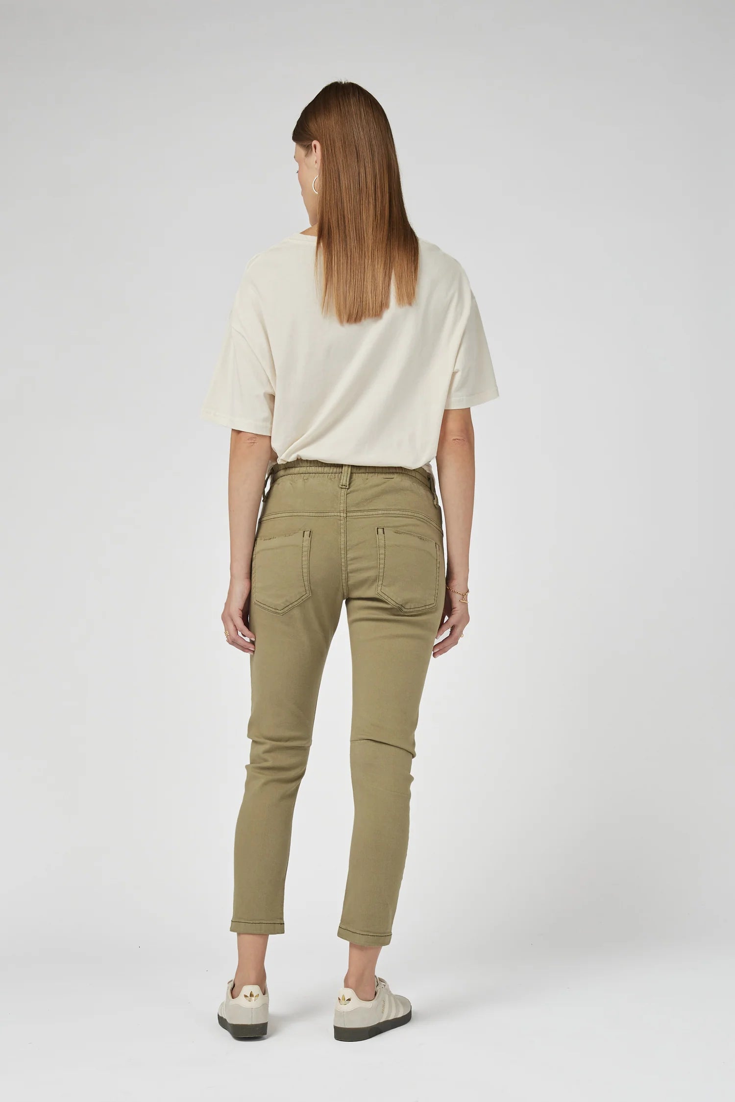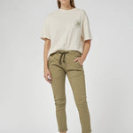 A mid-rise and cropped length in Khaki colour, complete with an elasticated waistband and sportive drawstring. These stretch denim jeans have a flattering arch shape leg which sits at the hip for a relaxed look.
